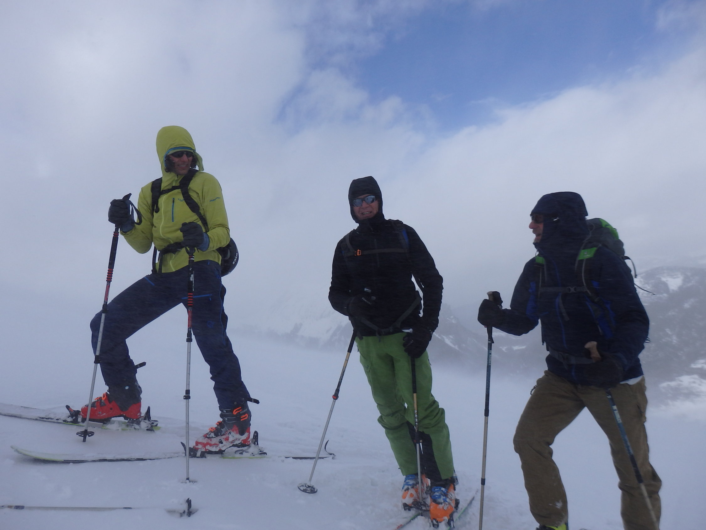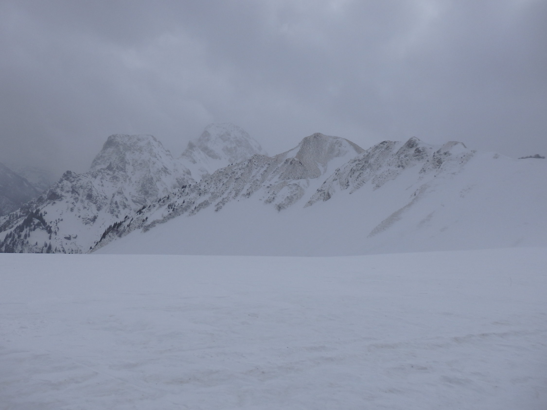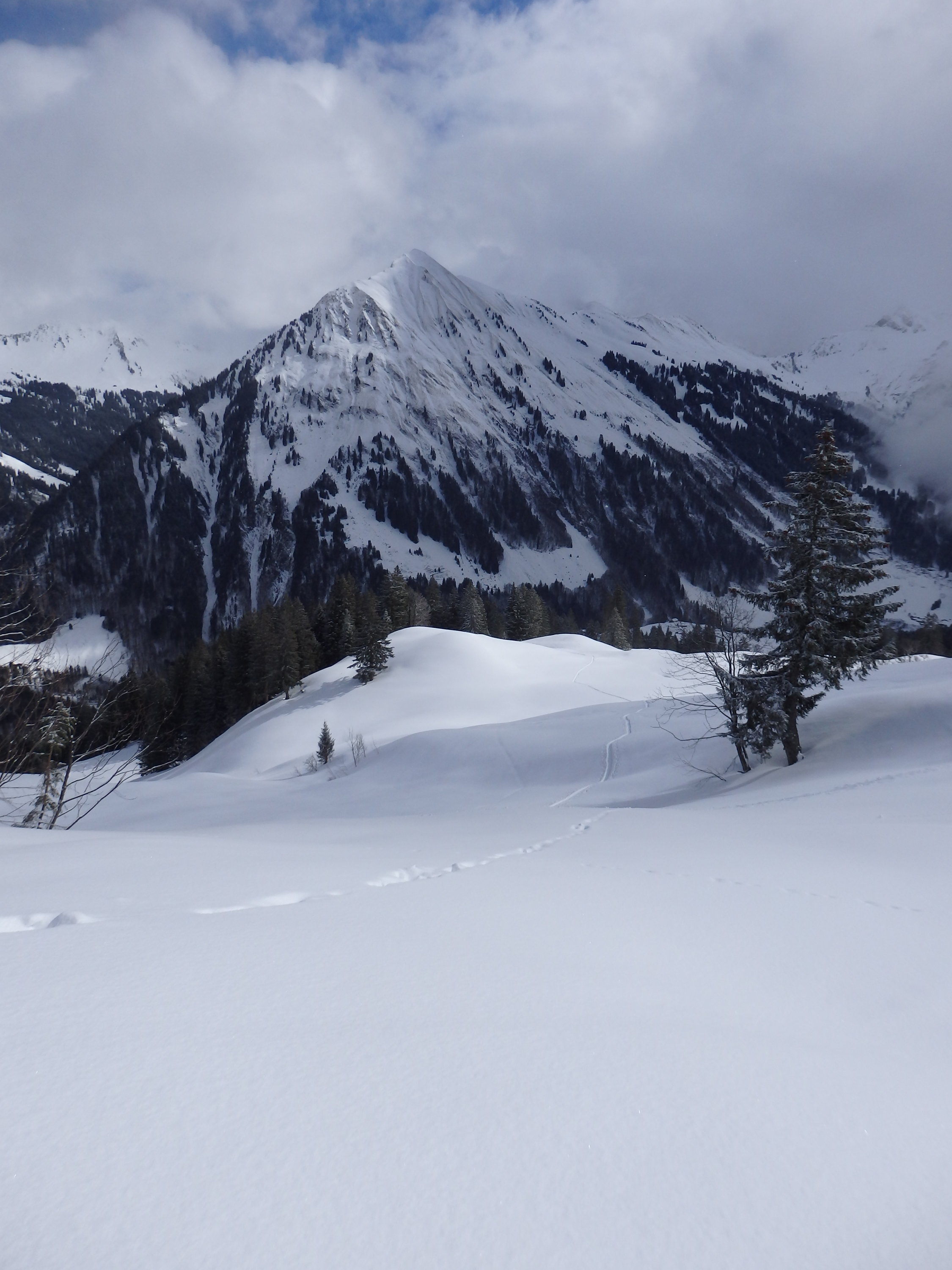 Wettermäßig gab es heute von allem etwas: leichter Regen bei der Anfahrt, erste Aufhellungen beim Start, dichtes Schneetreiben oberhalb der Gräsalpe, dann Sonne und blauer Himmel vor der Hochalpe und schließlich orkanartige Böen vor und am Gipfel. Tolle frischverschneite Winterlandschaft. Wunderschöne Abfahrt im Pulverschnee, der nach und nach feuchter wurde, der sich wegen der festen Unterlage bis unten sehr gut fahren ließ.
