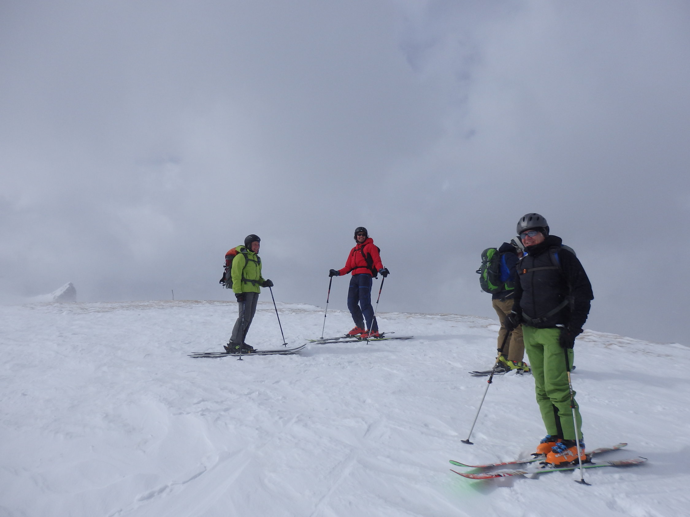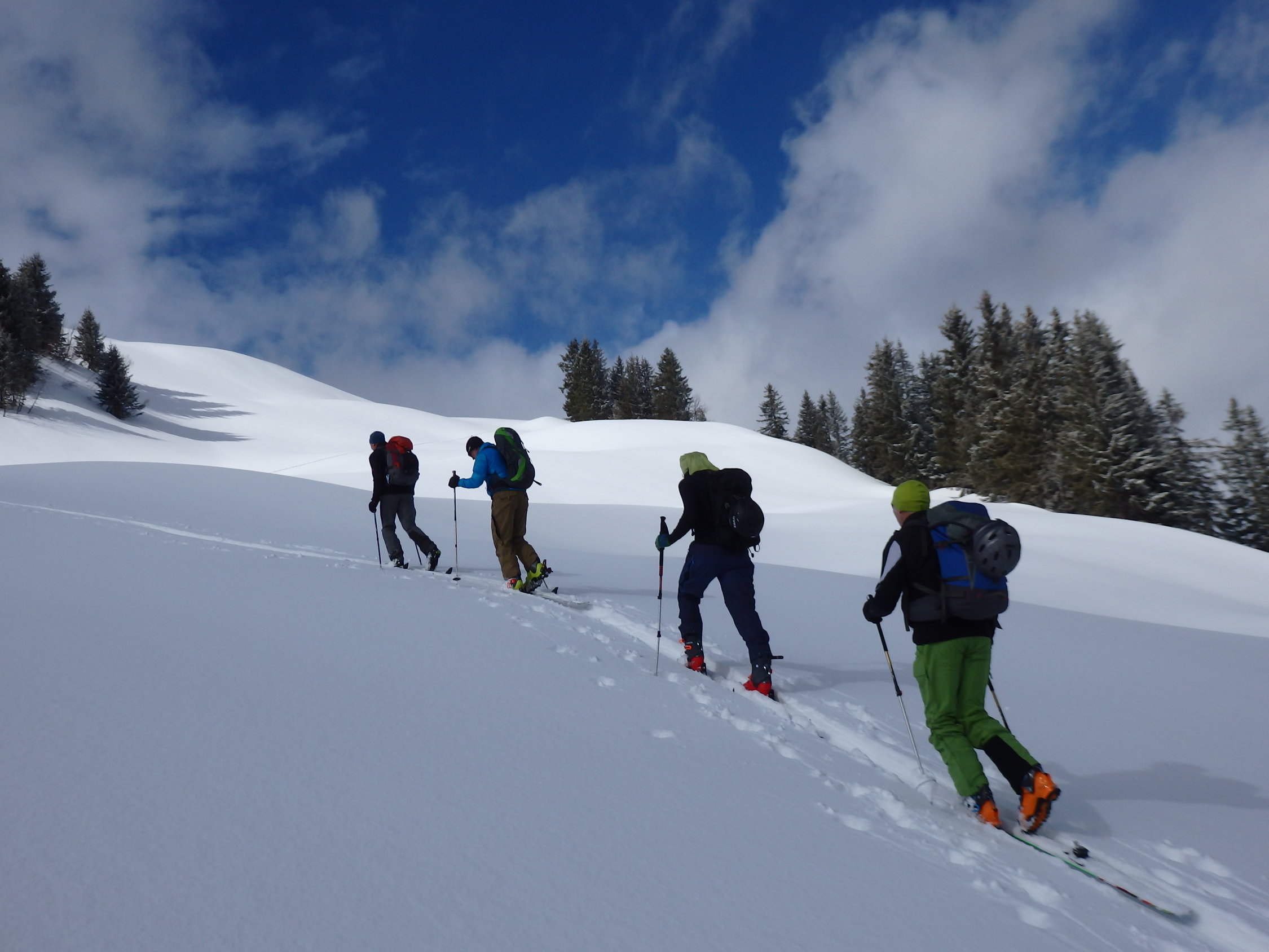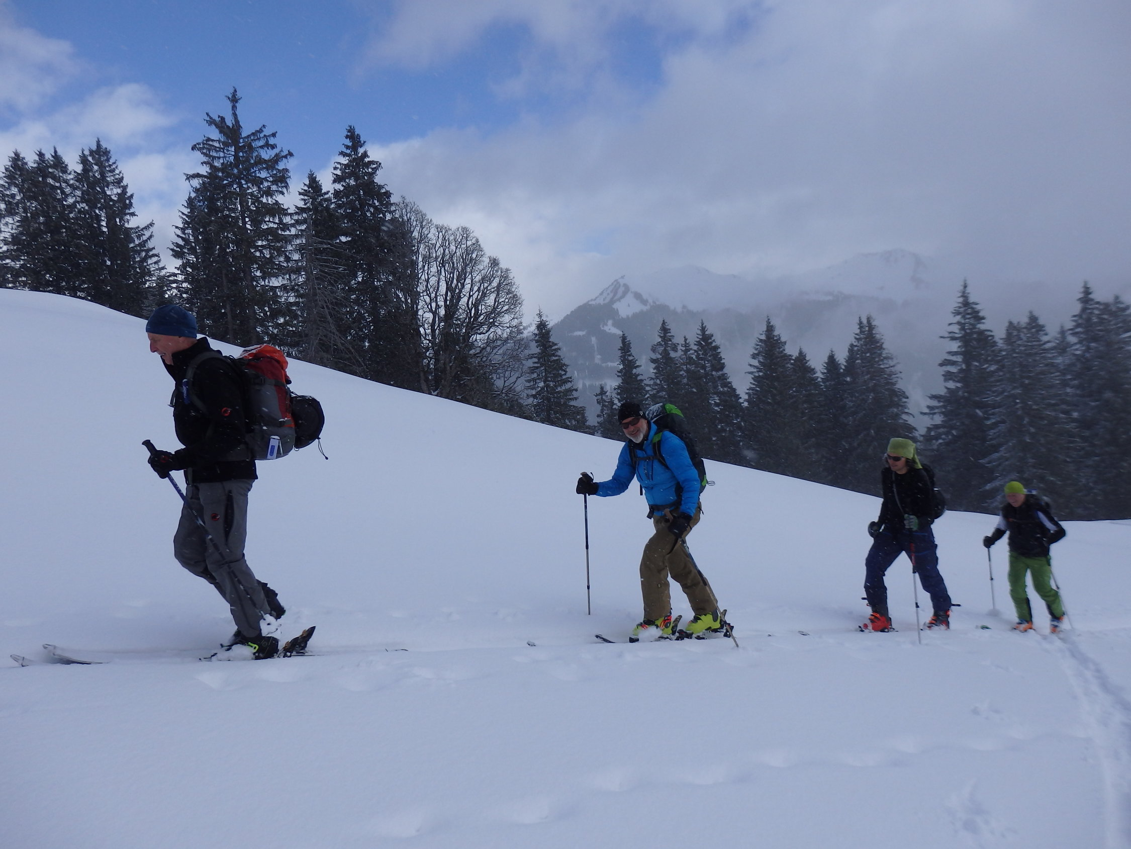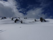 Wettermäßig gab es heute von allem etwas: leichter Regen bei der Anfahrt, erste Aufhellungen beim Start, dichtes Schneetreiben oberhalb der Gräsalpe, dann Sonne und blauer Himmel vor der Hochalpe und schließlich orkanartige Böen vor und am Gipfel. Tolle frischverschneite Winterlandschaft. Wunderschöne Abfahrt im Pulverschnee, der nach und nach feuchter wurde, der sich wegen der festen Unterlage bis unten sehr gut fahren ließ.