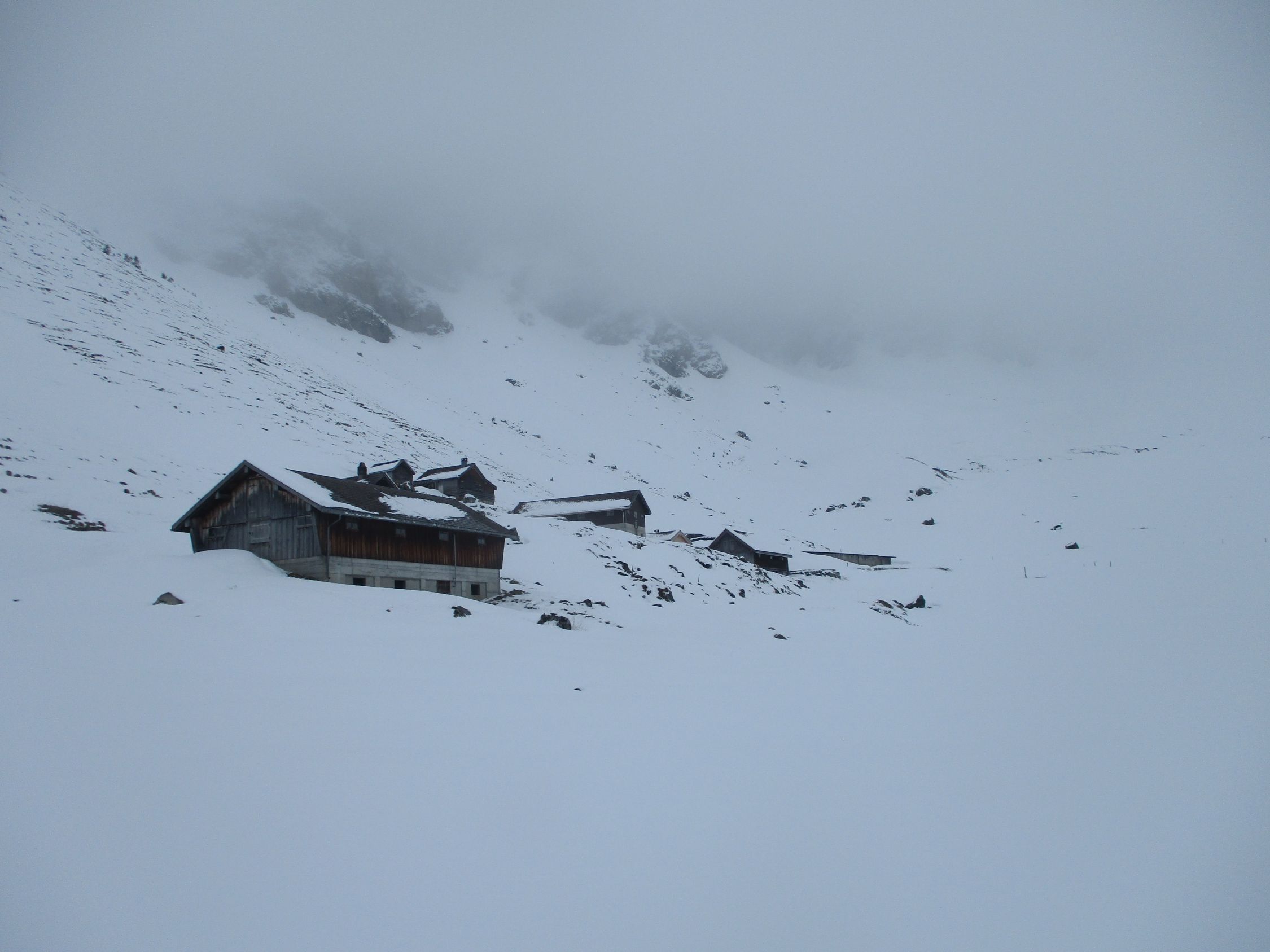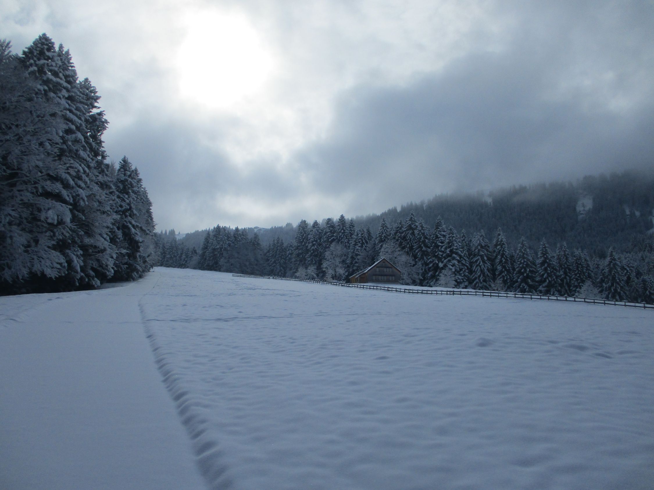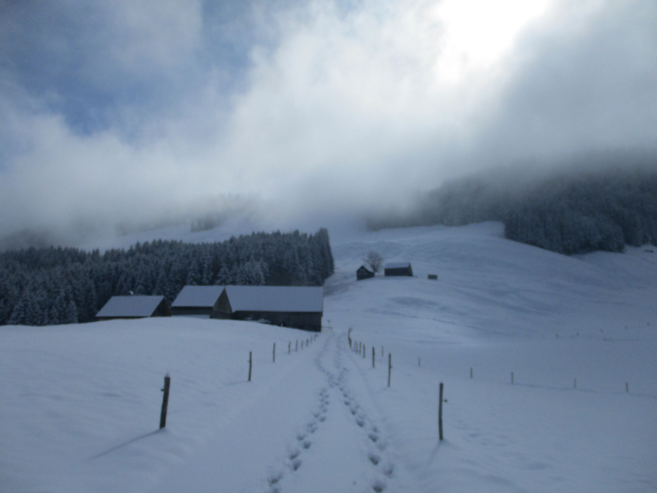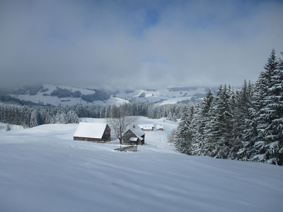 Die meiste Zeit über musste im unberührten Neuschnee gespurt werden. Die Fußspuren zu Beginn halfen praktisch nicht. Oberhalb der Jakobskapelle traf ich einen Wandersmann ohne Schneeschuhe, dessen Spur mir die Orientierung bis zum Gipfel erleichterte, denn was hoffnungsfroh begann (siehe Bilder) endete mit Ankunft auf dem Kamm beim (geschlossenen) Gasthaus Scheidegg im Whiteout. Eine Herausforderung war dann der Abstieg unter diesen Bedingungen gen Schwägalp durch unverspurtes Gelände. Dort kamen mir zwei mit Hund von Urnäsch her entgegen. von dieser Spur konnte ich immerhin bis zur Abzweigung P. 1557 profitieren, danach wieder weiter durch jungfräuliches Weiß. Diffuse Sicht vom Feinsten, Konturen und Hangneigungen waren kaum mal erkennbar. Unterhalb vom Langälpli besserte sich die Sicht ein wenig, da ich dort wieder unterhalb der Wolkenglocke unterwegs war. Der Säntis zeigte sich den ganzen Tag über nicht, ebensowenig gab es Aussichten nach Norden, übers Appenzellerland hinweg zum Bodensee.