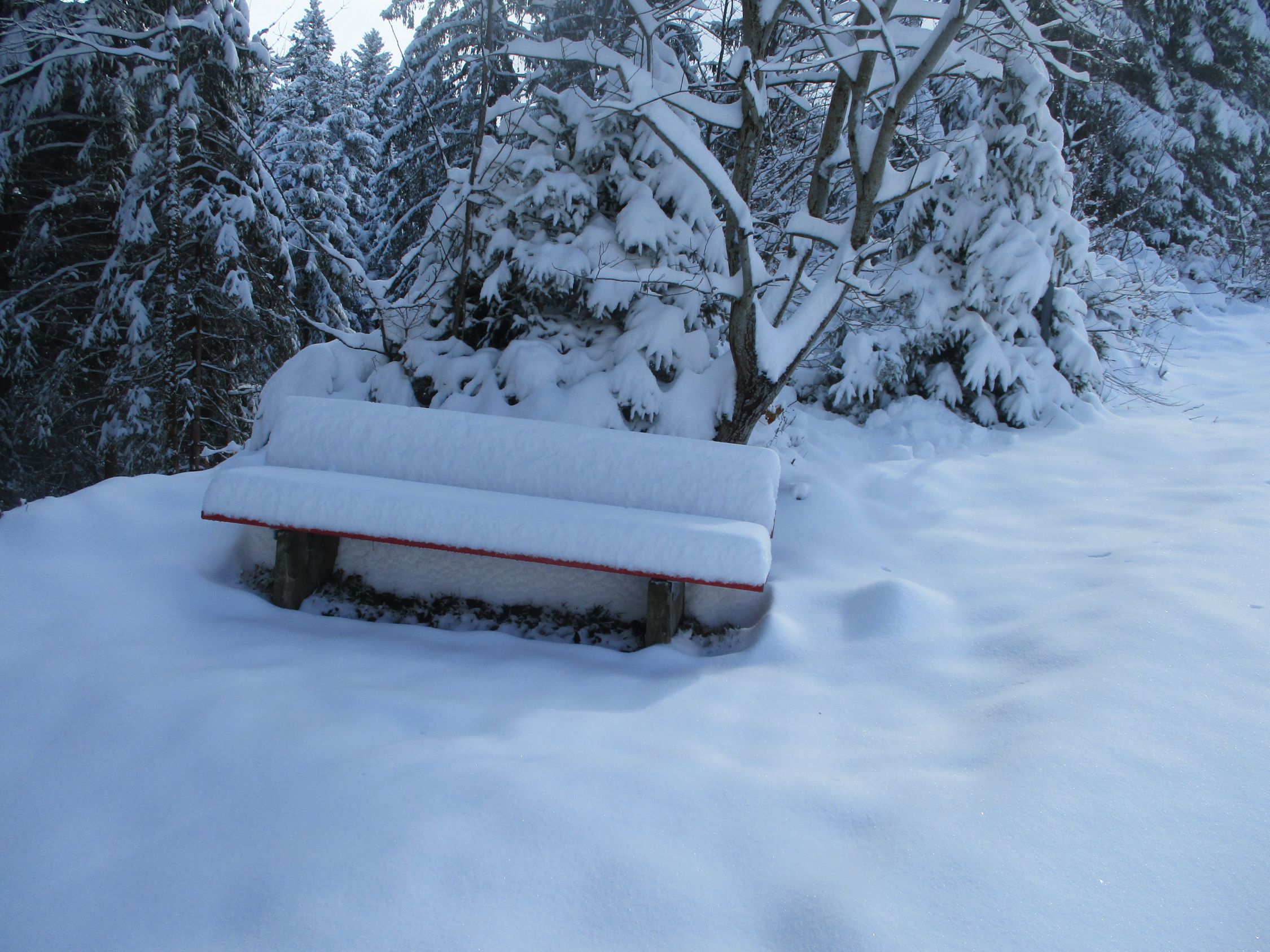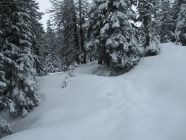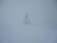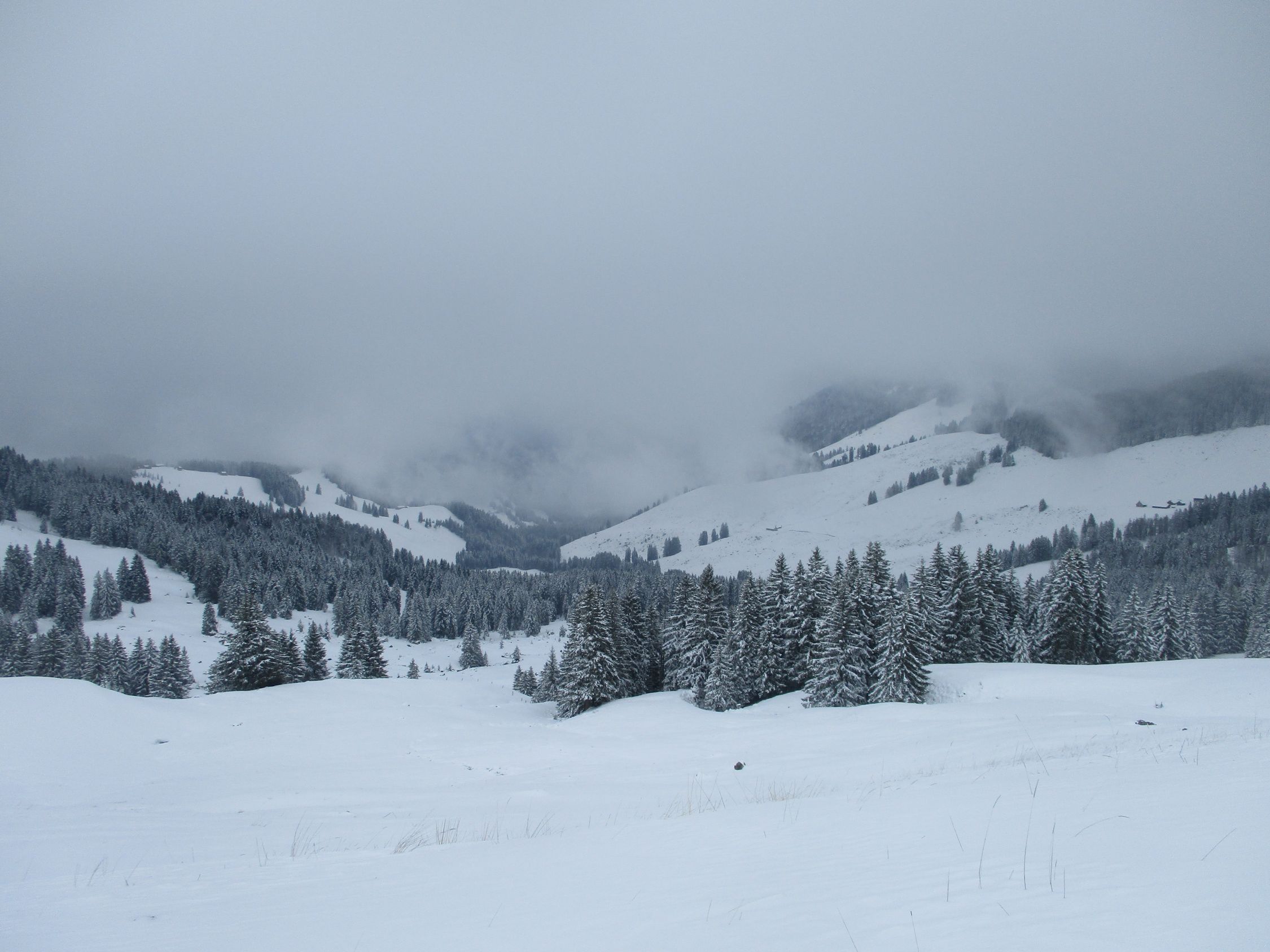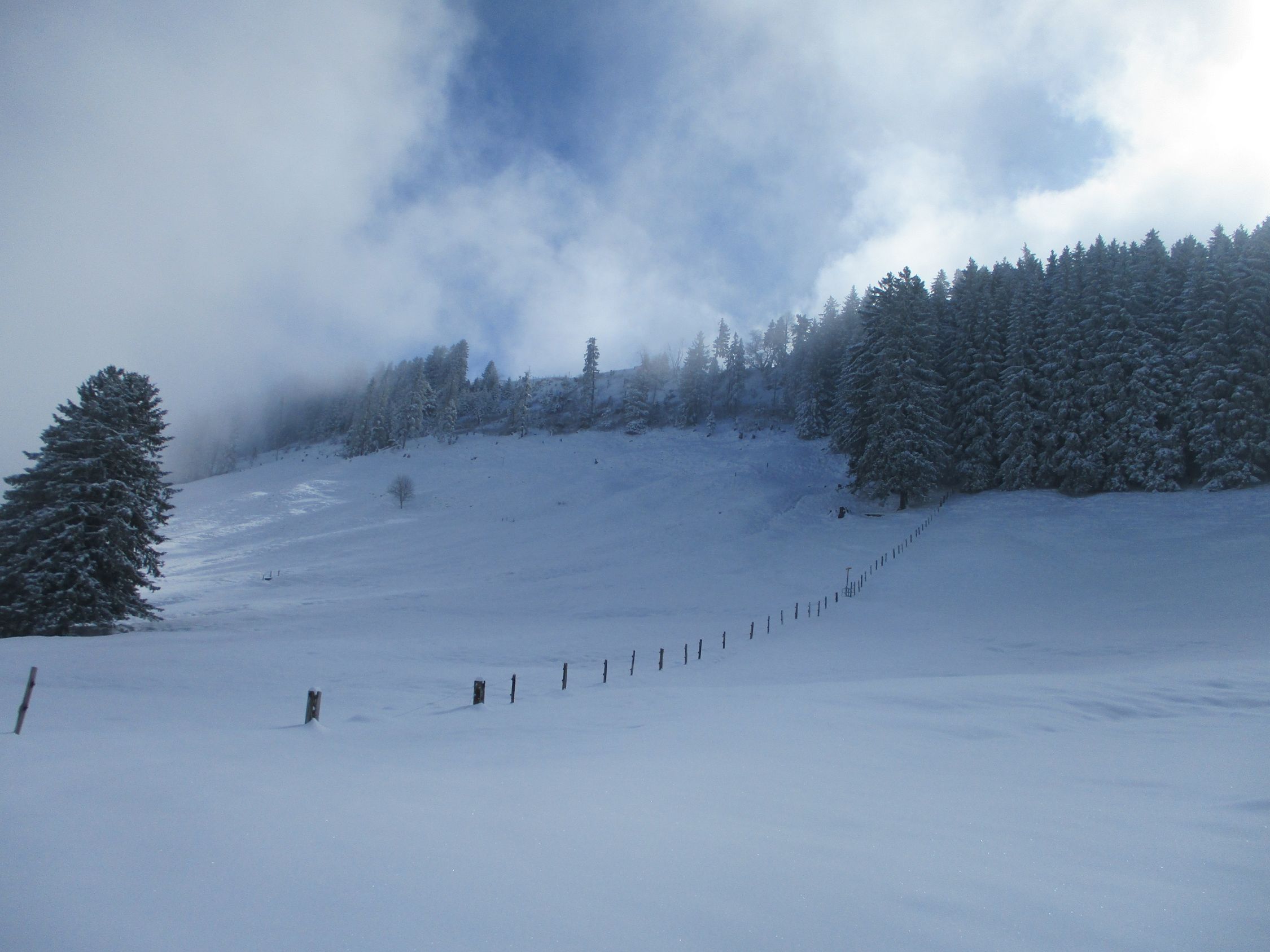 Die meiste Zeit über musste im unberührten Neuschnee gespurt werden. Die Fußspuren zu Beginn halfen praktisch nicht. Oberhalb der Jakobskapelle traf ich einen Wandersmann ohne Schneeschuhe, dessen Spur mir die Orientierung bis zum Gipfel erleichterte, denn was hoffnungsfroh begann (siehe Bilder) endete mit Ankunft auf dem Kamm beim (geschlossenen) Gasthaus Scheidegg im Whiteout. Eine Herausforderung war dann der Abstieg unter diesen Bedingungen gen Schwägalp durch unverspurtes Gelände. Dort kamen mir zwei mit Hund von Urnäsch her entgegen. von dieser Spur konnte ich immerhin bis zur Abzweigung P. 1557 profitieren, danach wieder weiter durch jungfräuliches Weiß. Diffuse Sicht vom Feinsten, Konturen und Hangneigungen waren kaum mal erkennbar. Unterhalb vom Langälpli besserte sich die Sicht ein wenig, da ich dort wieder unterhalb der Wolkenglocke unterwegs war. Der Säntis zeigte sich den ganzen Tag über nicht, ebensowenig gab es Aussichten nach Norden, übers Appenzellerland hinweg zum Bodensee.