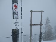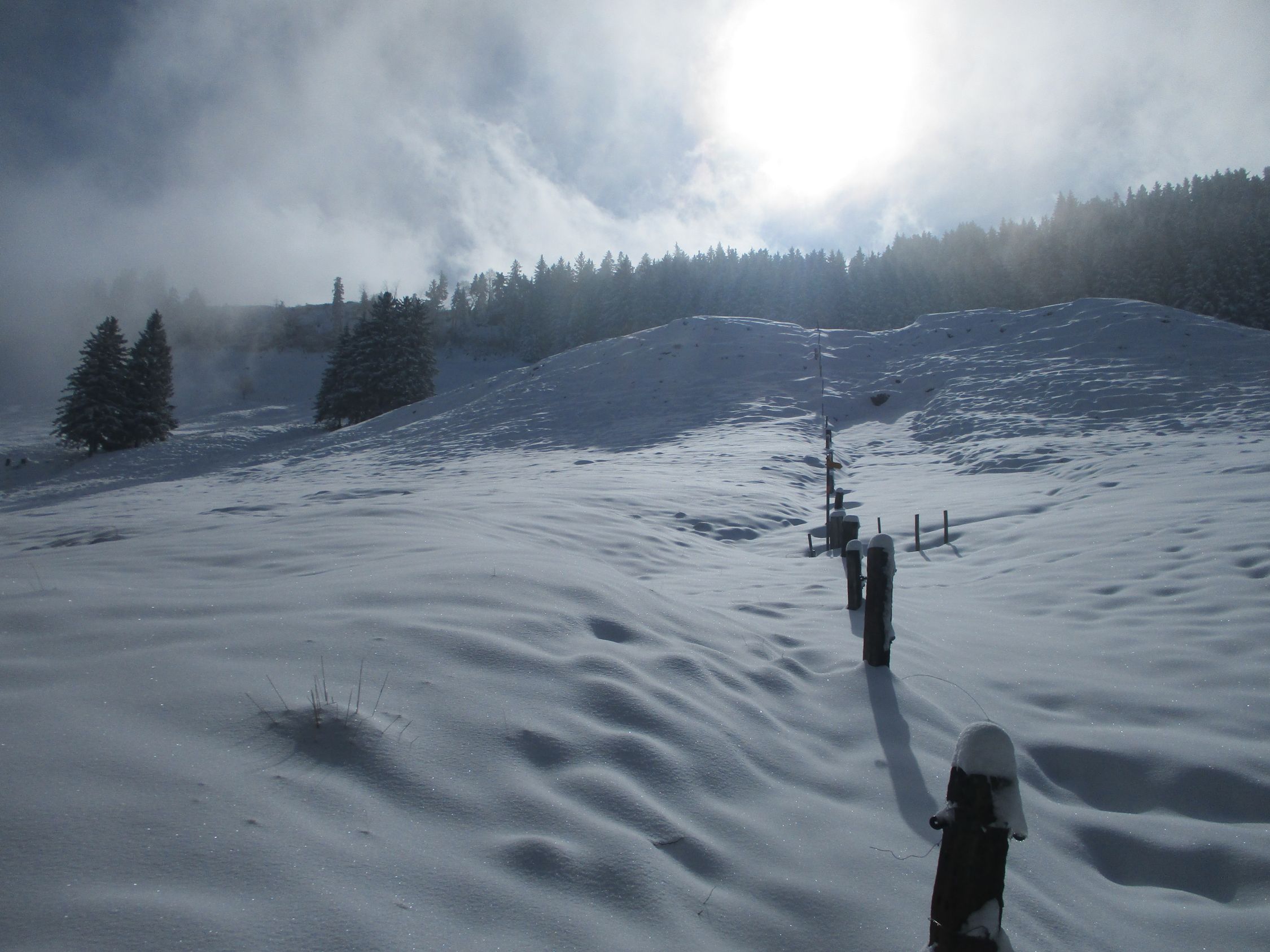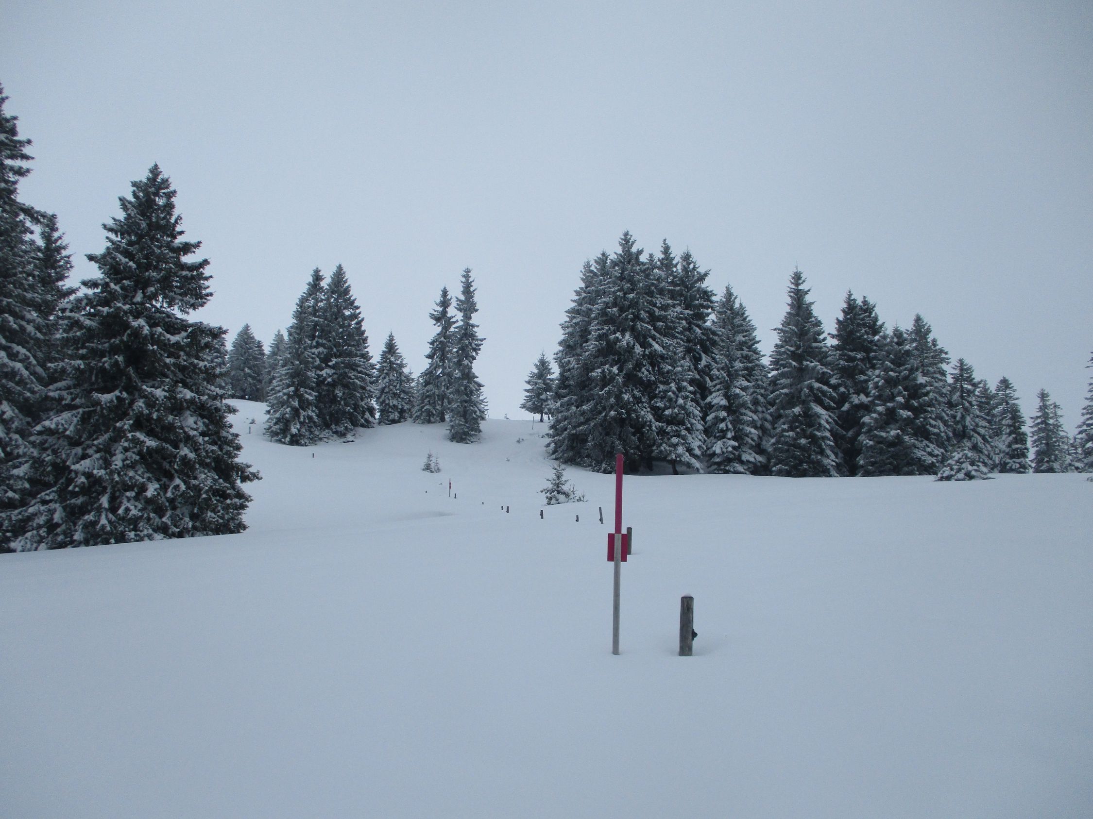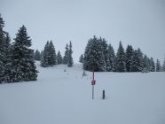 Obwohl die Markierungspfosten fast immer im Gelände erkennbar waren, hätte ich heute Gebietsfremden den Abstieg gen Schwägalp allenfalls mit GPS-Unterstützung empfohlen. Das Schild am P. 1557 ist drehbar und stand prompt verkehrt, was einem bei solchen Bedingungen durchaus mal stutzig werden lassen kann. Jetzt steht es (hoffentlich dauerhaft!) wieder richtig.