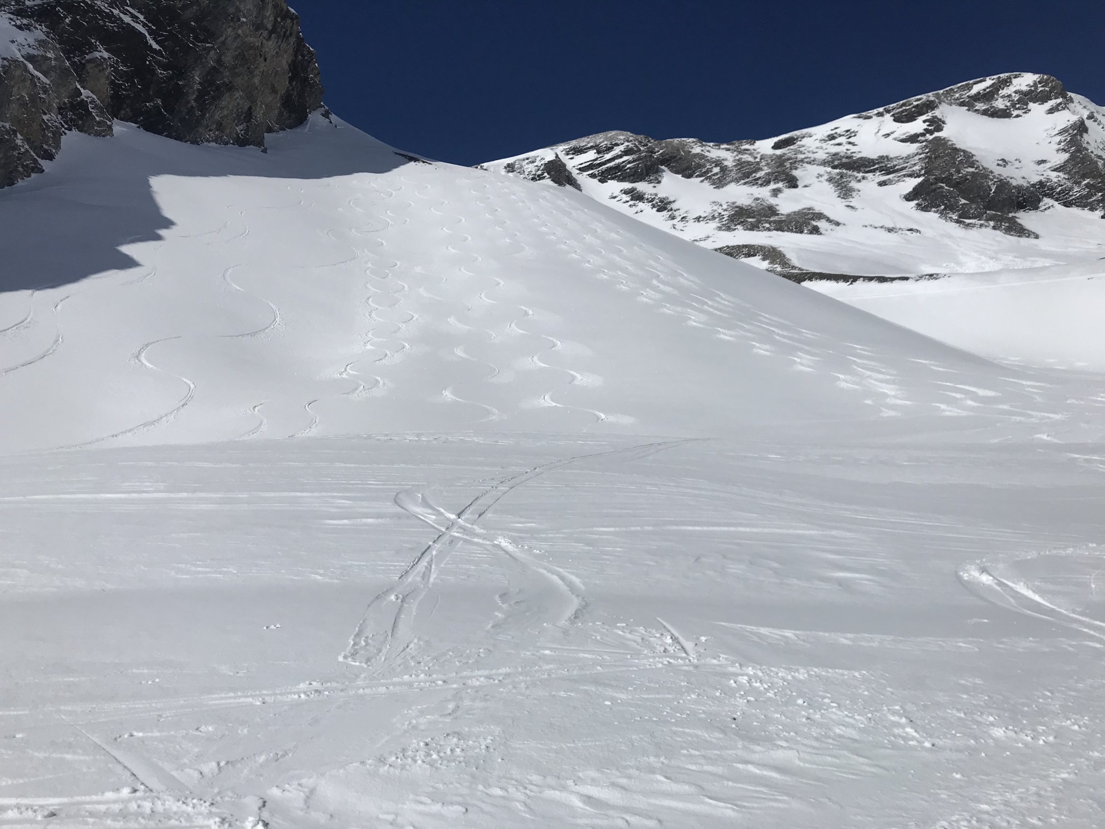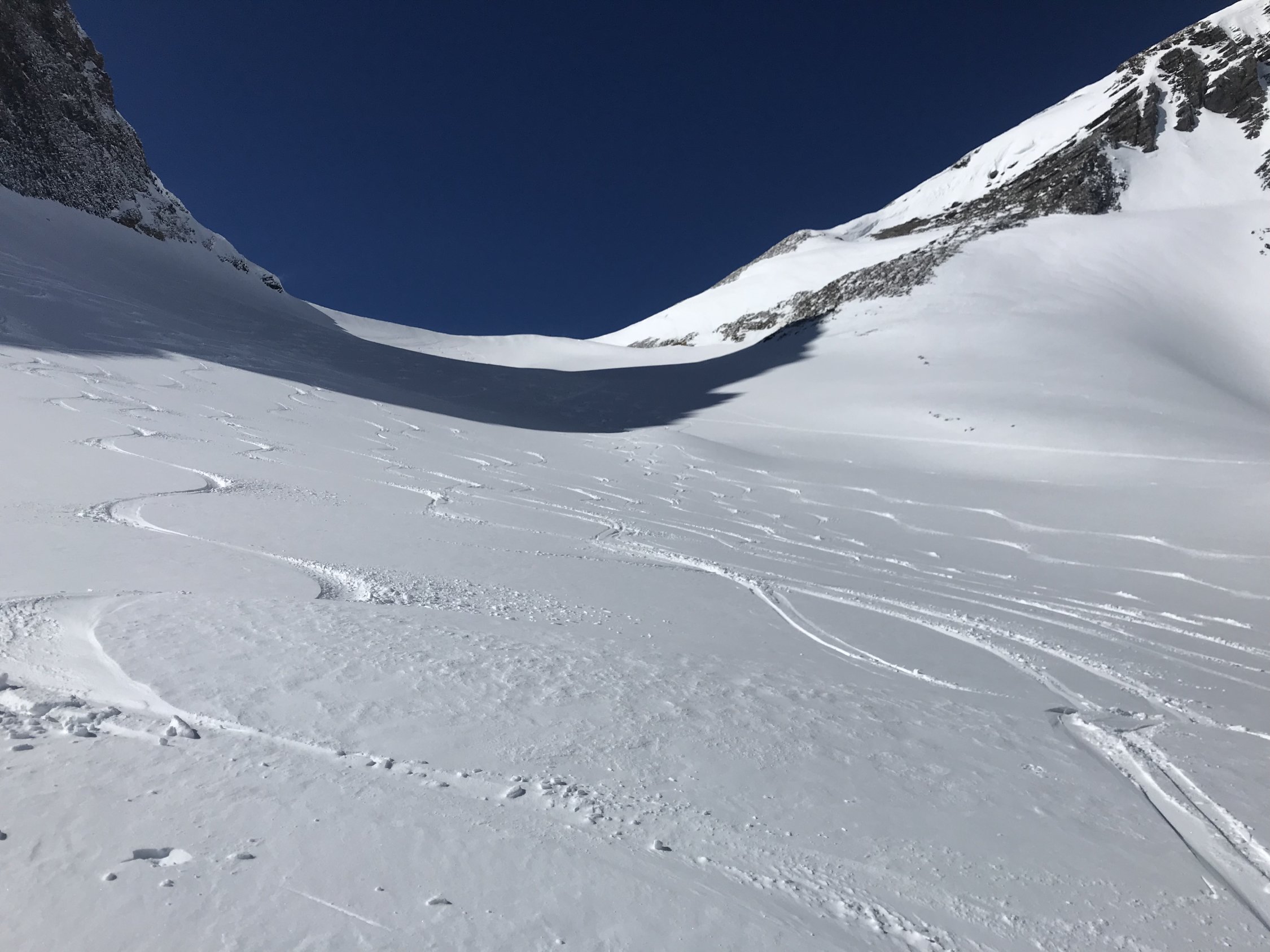 Oben von Wart bis in die Einfahrt westlich von Schrybershiri windgepresster Pulver auf tragender Unterlage. Ein Traum.