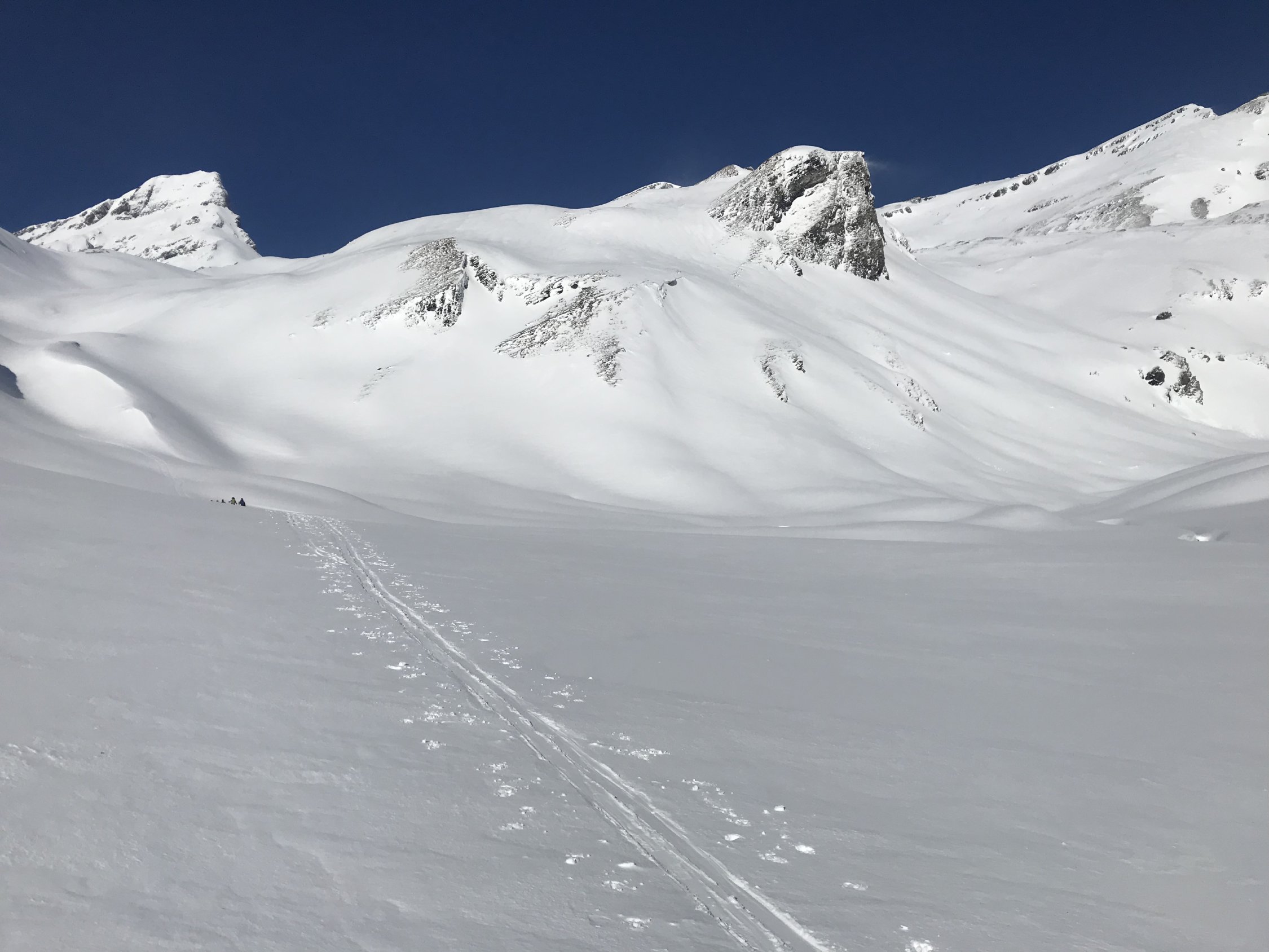 Gipfel komplett abgeblasen, mit Ski nur bis Wart (2705m) möglich. Gipfel haben wir dann zu Fuss gemacht.