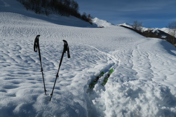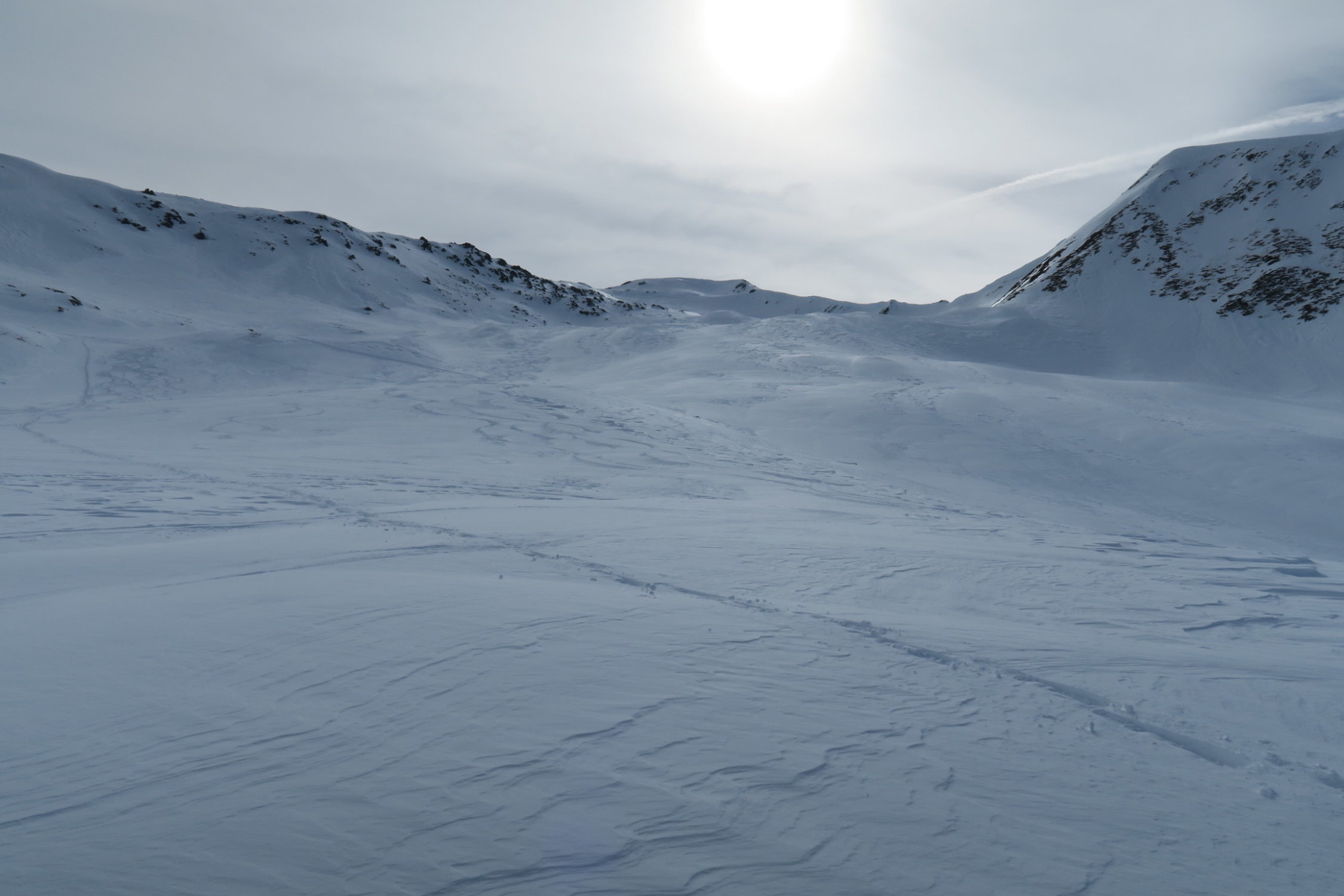 Abfahrt oben schwerer Presspulver, dann feinster Bruchharsch. Ca. ab 1700m zunehmend feucht. Am Schluss dann so feucht, dass es grad wieder gut fahrbar war.