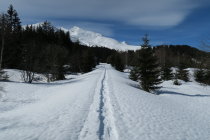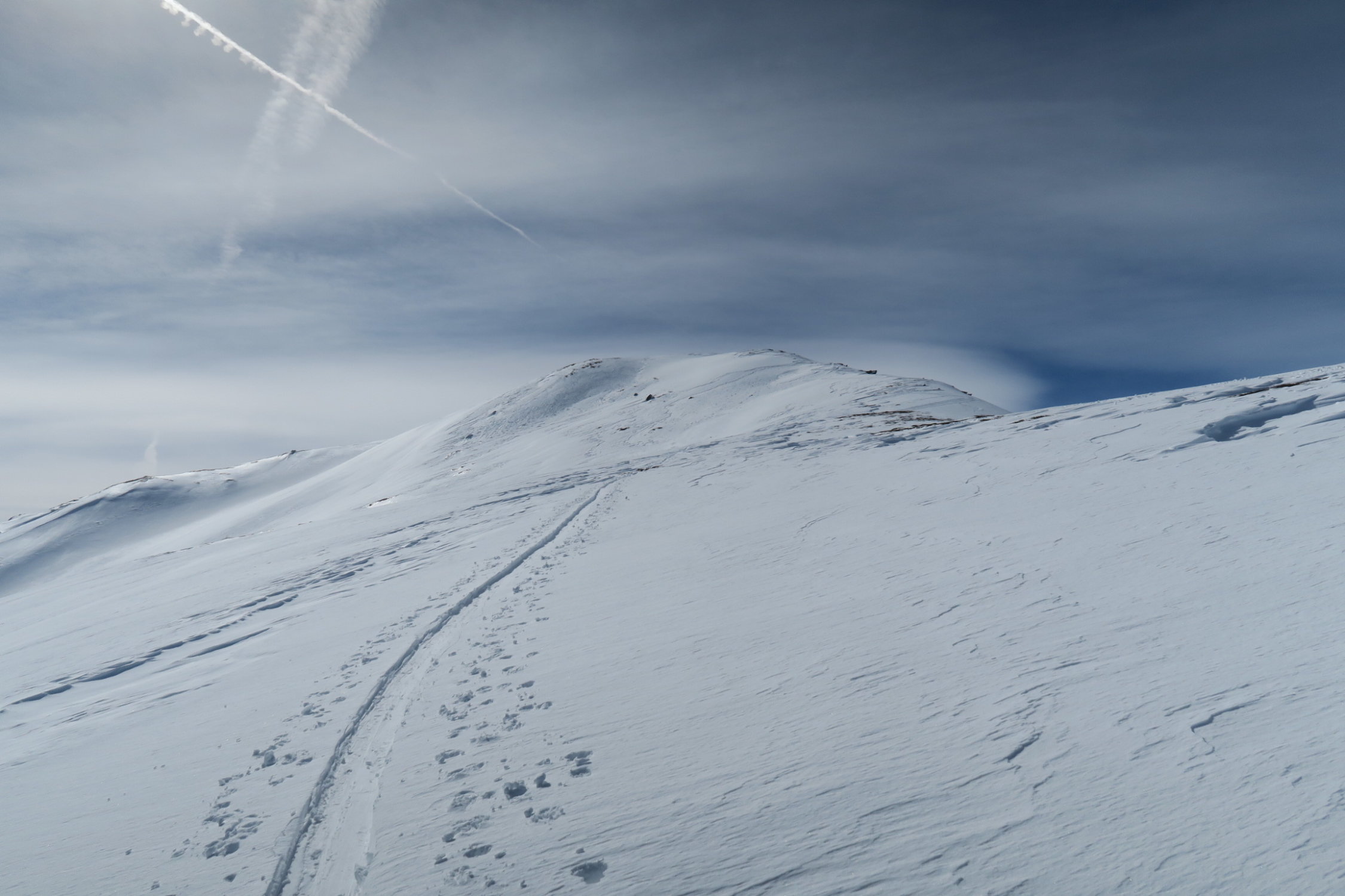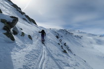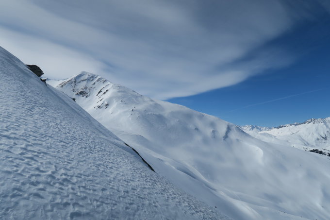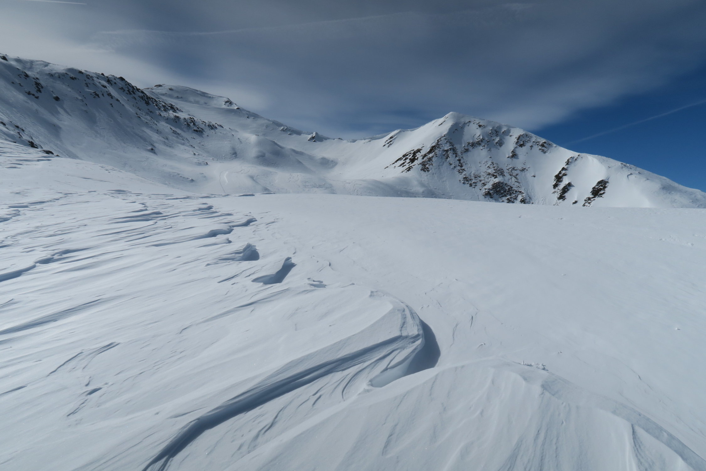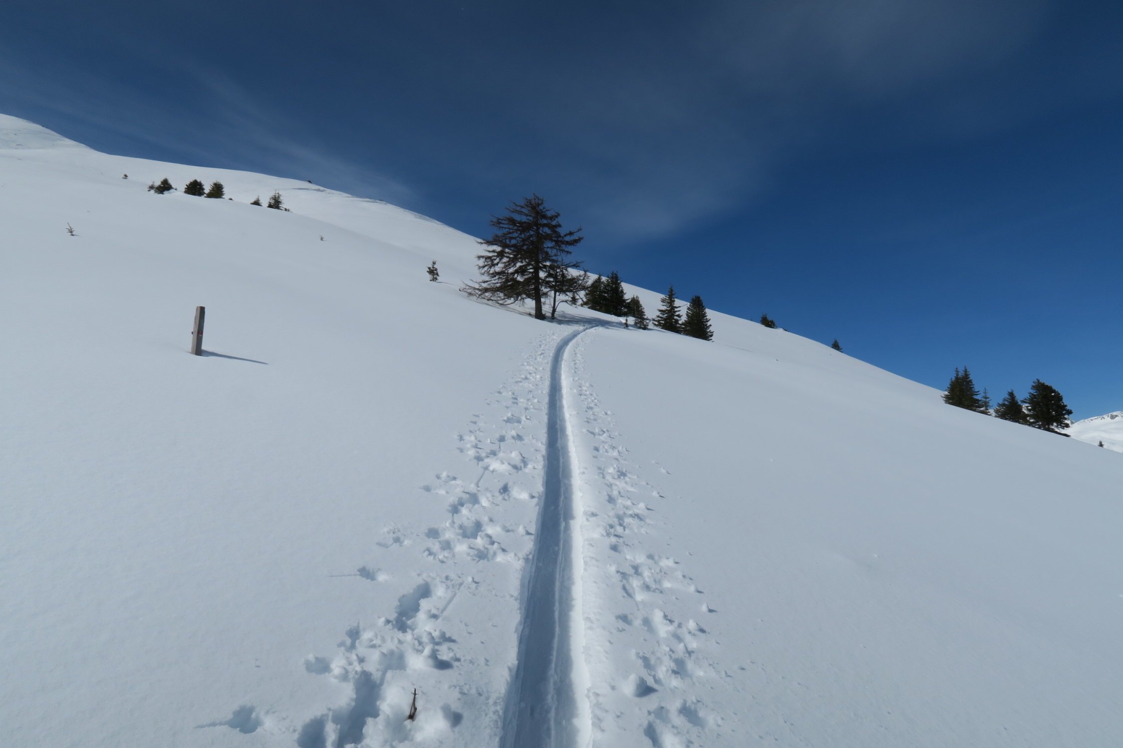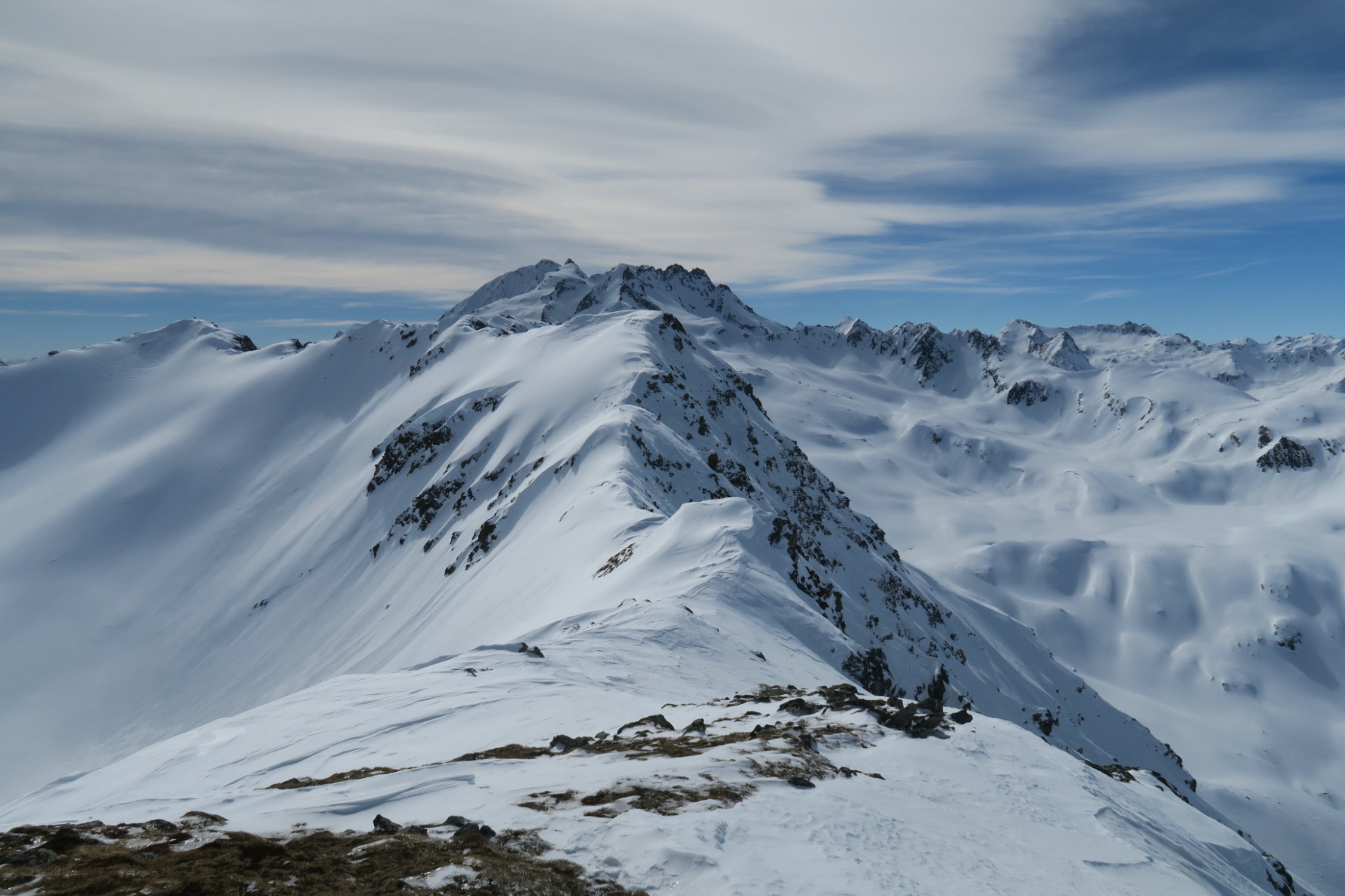 Beim Aufstieg unten Bruchharsch mit feucht-weicher Basis. Bei Stagias recht feucht wegen Sonneneinstrahlung, ab dem Waldstück zunehmend pulvrig/trocken. Ganz oben stark windgeprägt und oft pickelhart. An einigen Stellen liegt nur wenig Schnee auf dem Grat.
