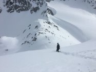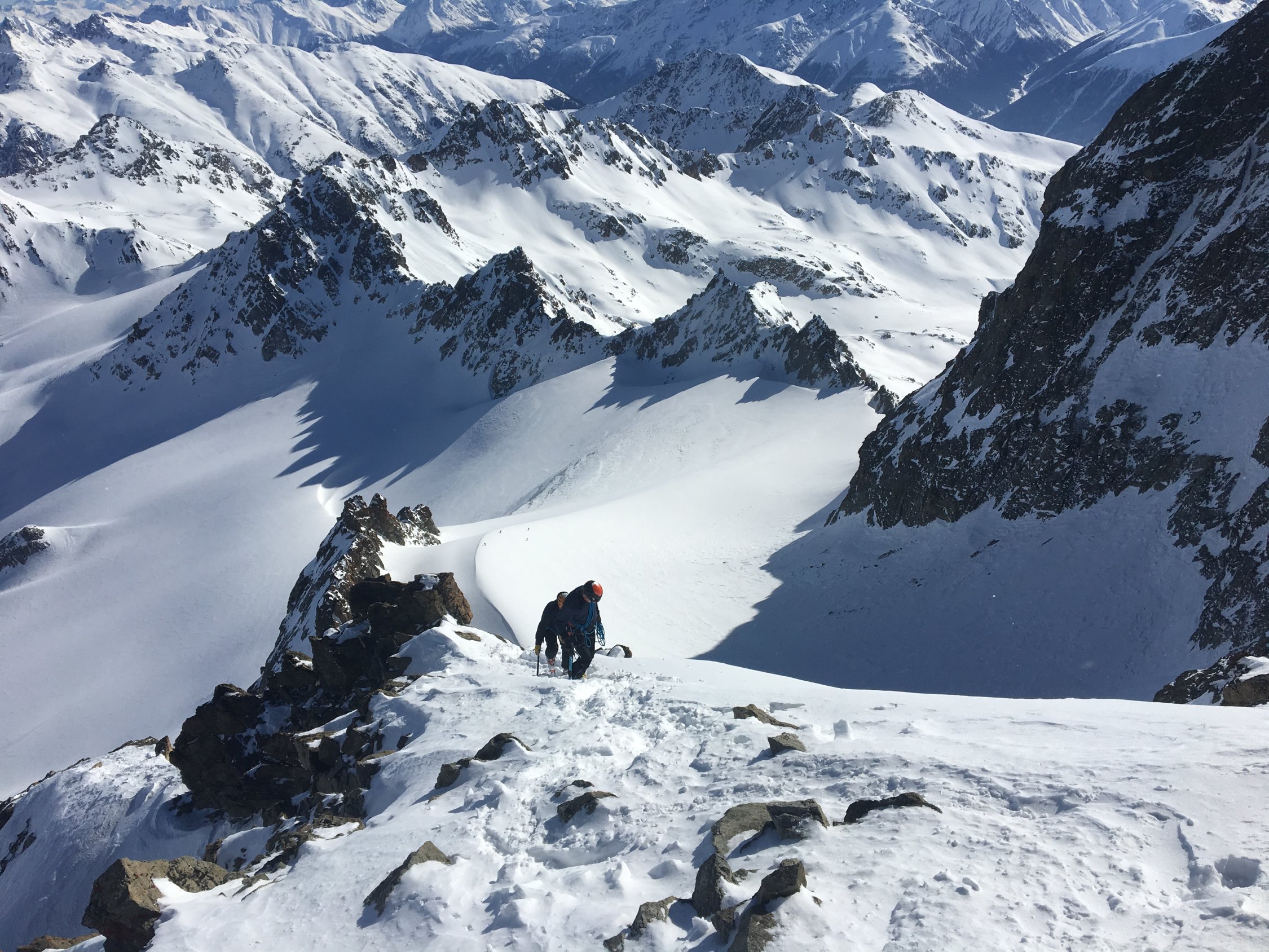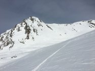 Südweststurm in der Nacht auf Sonntag, entsprechend war‘s das dann mit dem pulvertraum am Porchabella Gletscher (siehe Bilder). Abgesehen vom böigem Wind problemloser Zustieg bis Skidepot. Ab dort windstill auf guter Spur (dank erneut den Allgäuer Jungs für die Spurarbeit vom Vortag). Guter Trittschnee, alle Bohrhaken frei. Generell ist der Gipfelzustieg bei sicherem Seilhandling auch bei heikleren Bedingungen möglich. Bei verschneiten Bohrhaken lässt sich auch der eine oder andere Friend plazieren. Sonst Steigeisen, Pickel & 30m Seil je nach Wohlbefinden.