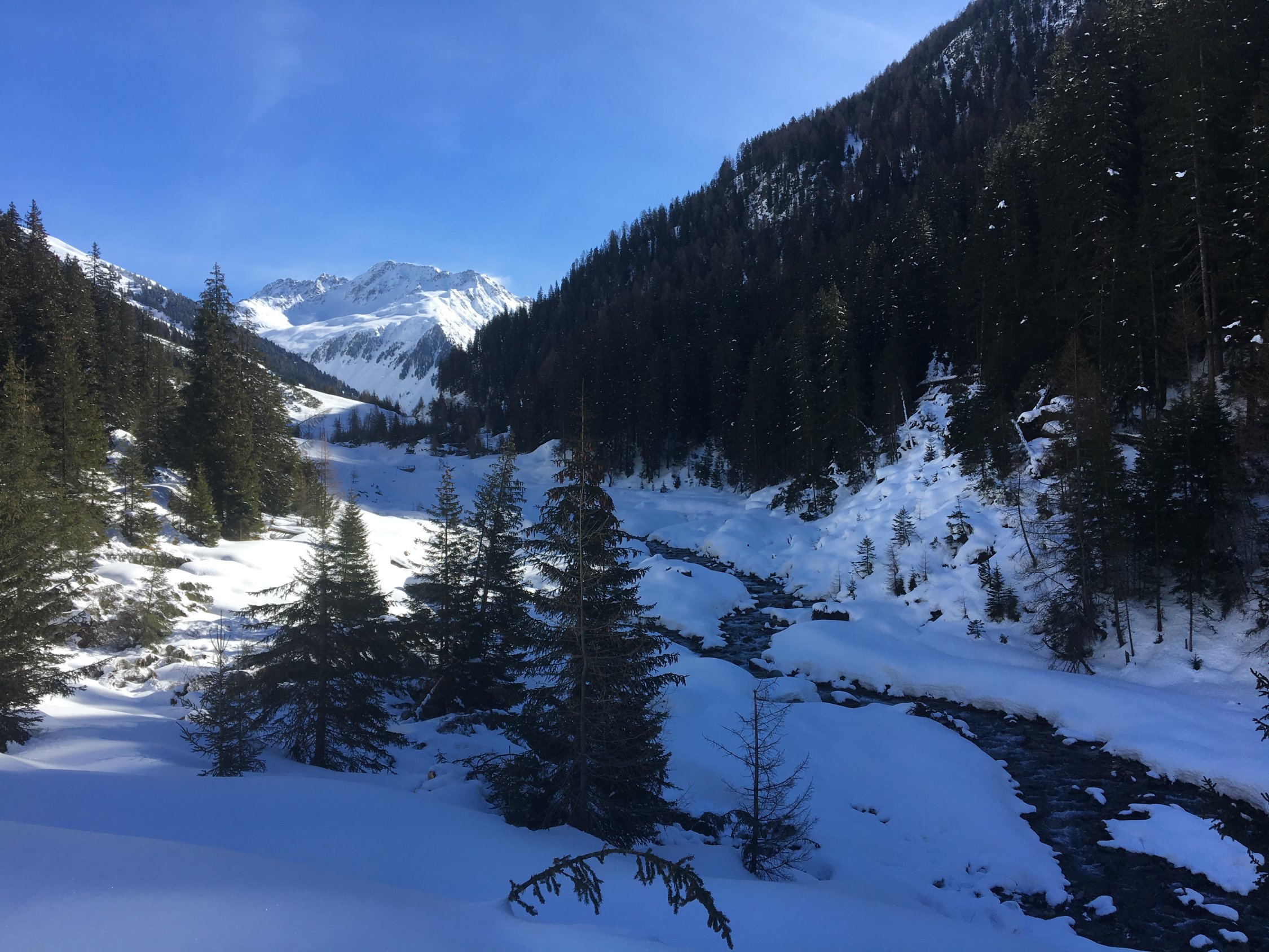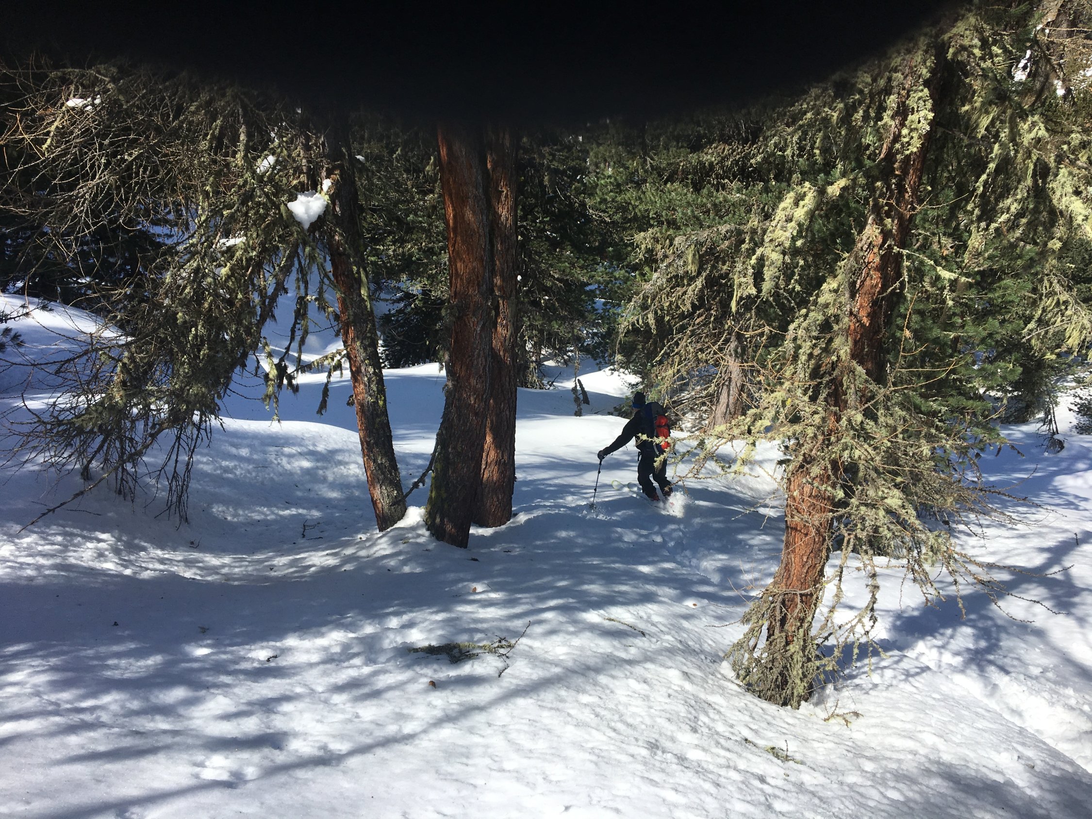Als Highlight erwies sich der Tipp des Hüttenwarts, ab P 2337 nicht über den üblichen Weg (Moränenrücken) nach Tuors Chants abzufahren sondern mehr oder weniger auf direkter Linie links des Baches Ava da Salect (nicht zu tief gen Bachbett ziehen. Hier wunderschöne Waldabdahrt durch lichten Waldbestand, am Ende durch Schnurgerade Schneise bis chants!