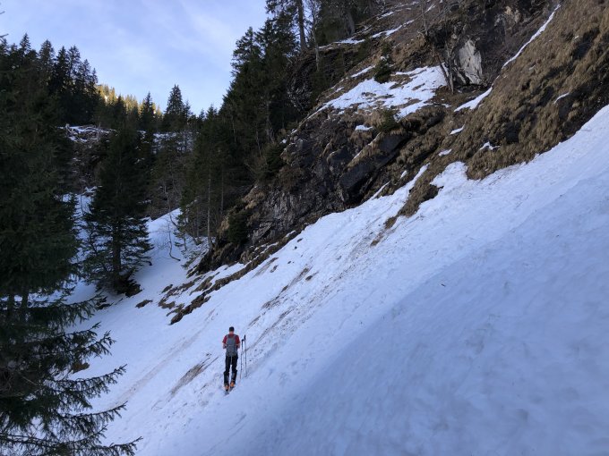 Abfahrt: Wir waren mit null Erwartungen gegangen und dann sehr positiv überrascht worden: Bei Abfahrt um 12 Uhr südseitig schön aufgesulzt, einzig die paar Zastrugis etwas störend. Ab Chlus dann teilweise im Schatten und immer noch gefroren, ergo etwas rüttelig. Im Wald unten dann etwas mühsamer Nassschnee, aber ok fahrbar.