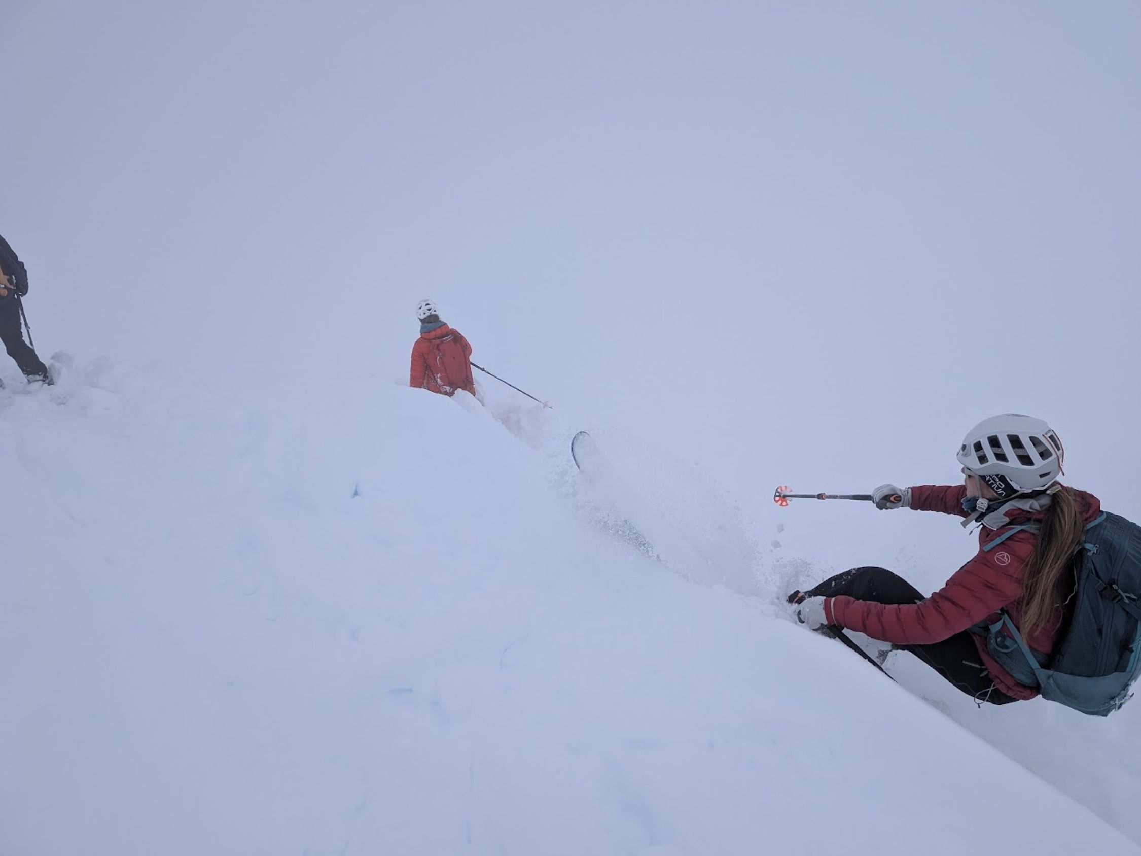 Sehr spezielle, aber auch faszinierende Verhältnisse durch starken Neuschnee am Samstag bis Sonntag früh und häufigem Wechsel von Sonne und Nebel. Bei den Schneeverhältnisse war es nicht nur wg. Nebel nicht immer einfach zu fahren, z.T. zwischen dem Altschnee und dem hohen Neuschnee mit dazwischen auch leichten festen Flächen und nahe beieinander unterschiedliche Schneehöhen. Nur Richtung Gipfel neben hohem Neuschnee auf der linken Seite auch noch schneearme Stellen