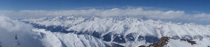 haben wir mit Vorsicht und viel Abstand durchgeführt, da der Hang doch mit viel Neuschnee beladen war. Sonst war die Schneeauflage 5 - 10cm Presspulver, was einfach zu spuren ging. Ab dem Skidepot ist der Grat weitesgehend Schneefrei. Wind bis zum Gipfel hin immer stärker, 40 - 50 km/h, Am Gipfel schöne Fernsicht ins BEO und Wallis.