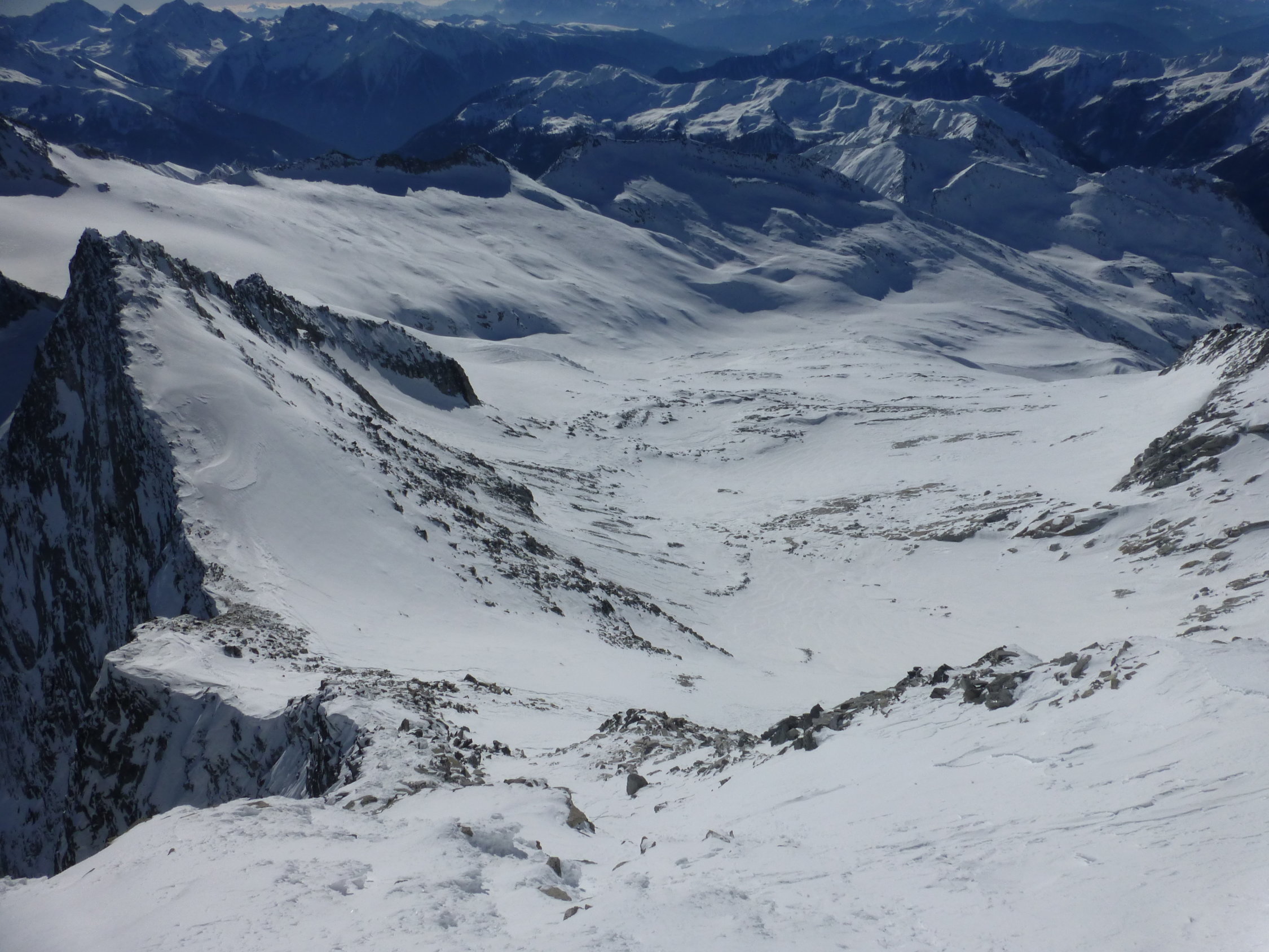 Allein auf weiter Flur. Die Masse kommt dann wahrscheinlich am Wochenende. Verhältnisse Richtung Weiszint schauen ebenfalls top aus. Hochfeiler Nordwand Einfahrt oder Ausstieg, je nach Ansicht, blank!