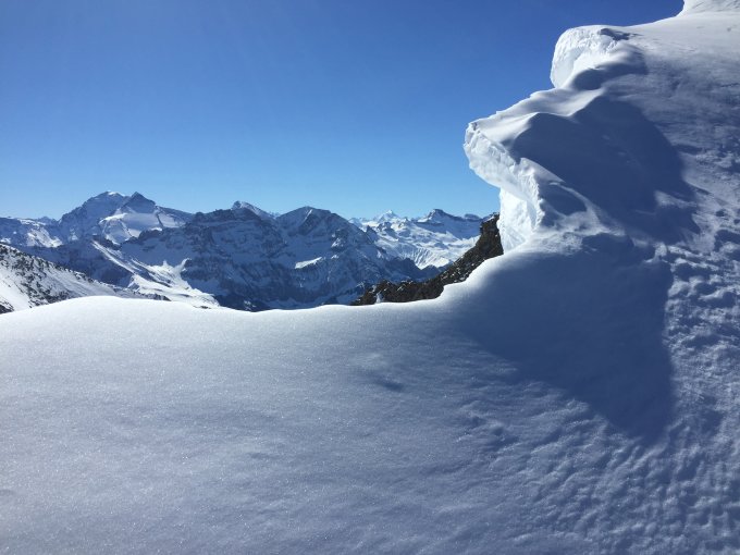 Quasi aper bis Unt. Gurbs, meist tragend bis gegen den Bütschisattel, dann wenig Pulverschnee auf teilweise etwas rutschiger Unterlage. Schlussaufstieg über den Grat in gutem Trittschnee - Pickel/Steigeisen nicht nötig.