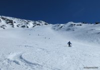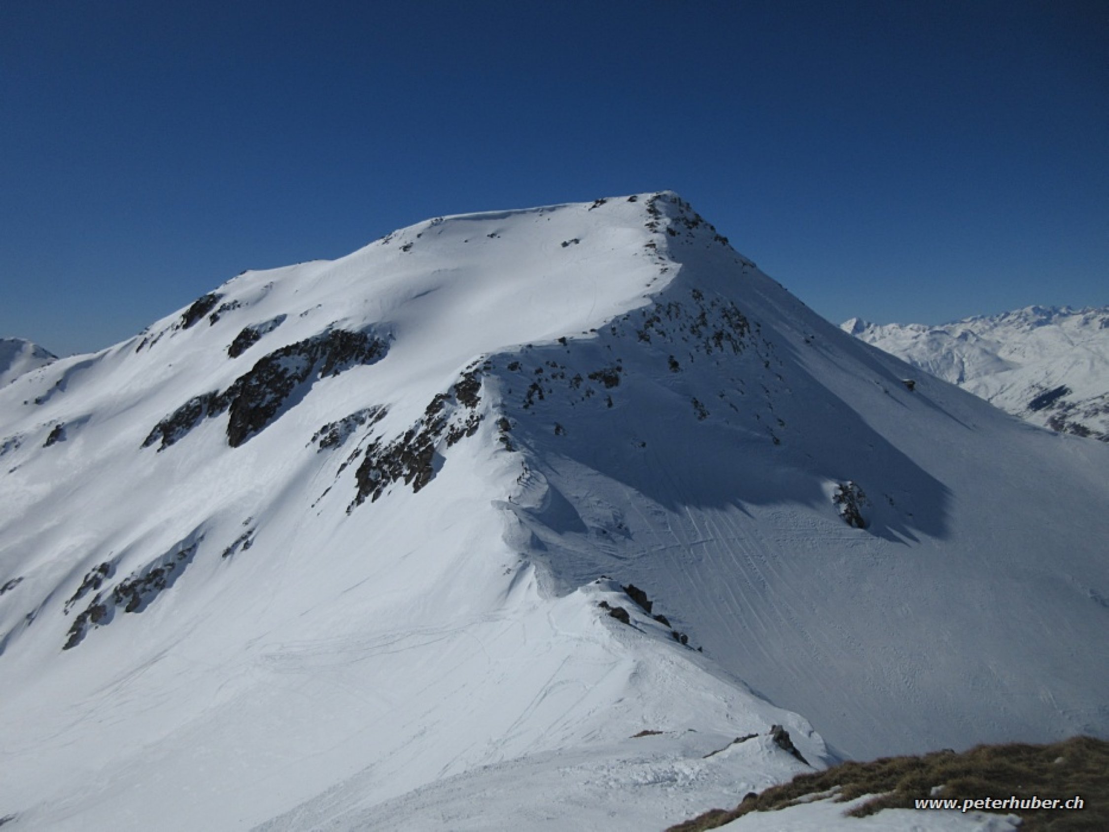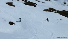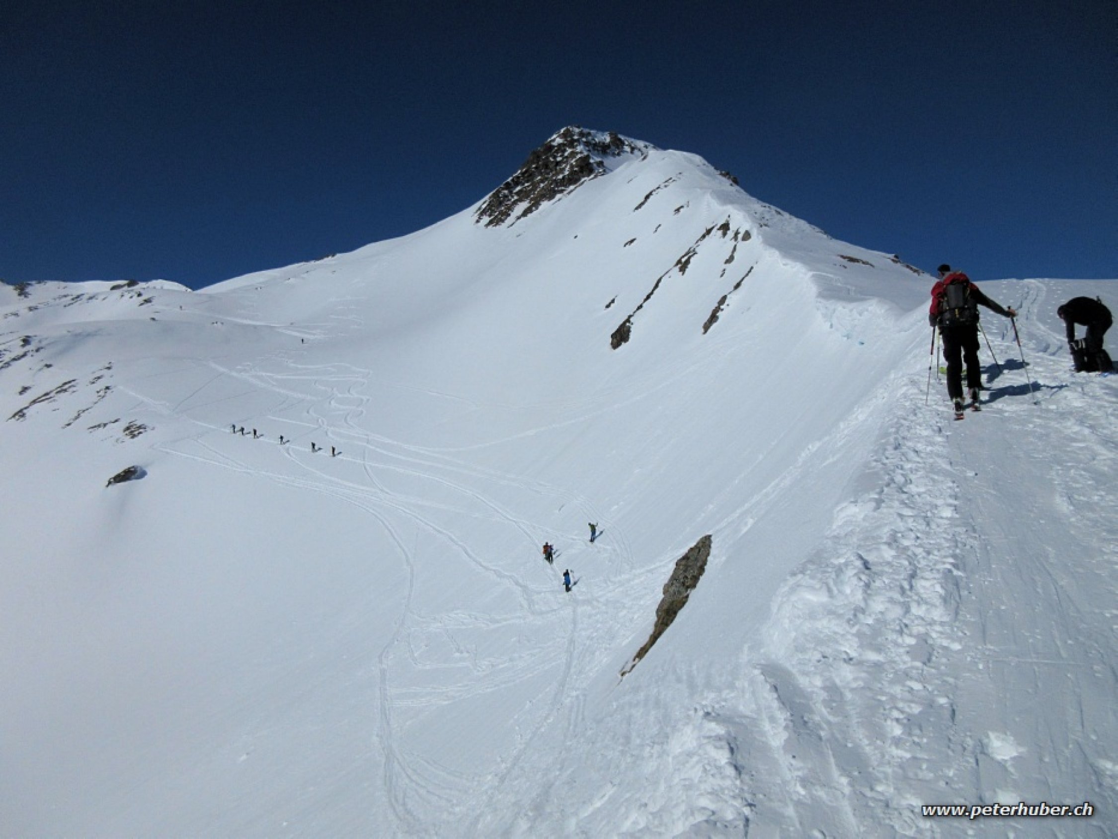 Strahlend schönes Wetter. Unten sehr warm, auf dem Gipfel ging ein kühler Wind. Es hat recht viel Schnee auf der ganzen Tour. Aufstiegspur zum Pazzolastock eher steil und hart/rutschig. Es läuft sich besser neben der Spur. Passage über die Kante ist gut zu machen. Dann über die Gräte zur Martschallücke sind meist gut eingeschneit, kurze Stellen glasig, Abfahrt in die Lücke recht hart. Fussanstieg über die Felsstufe hat gute Tritte, jedoch eher hart.