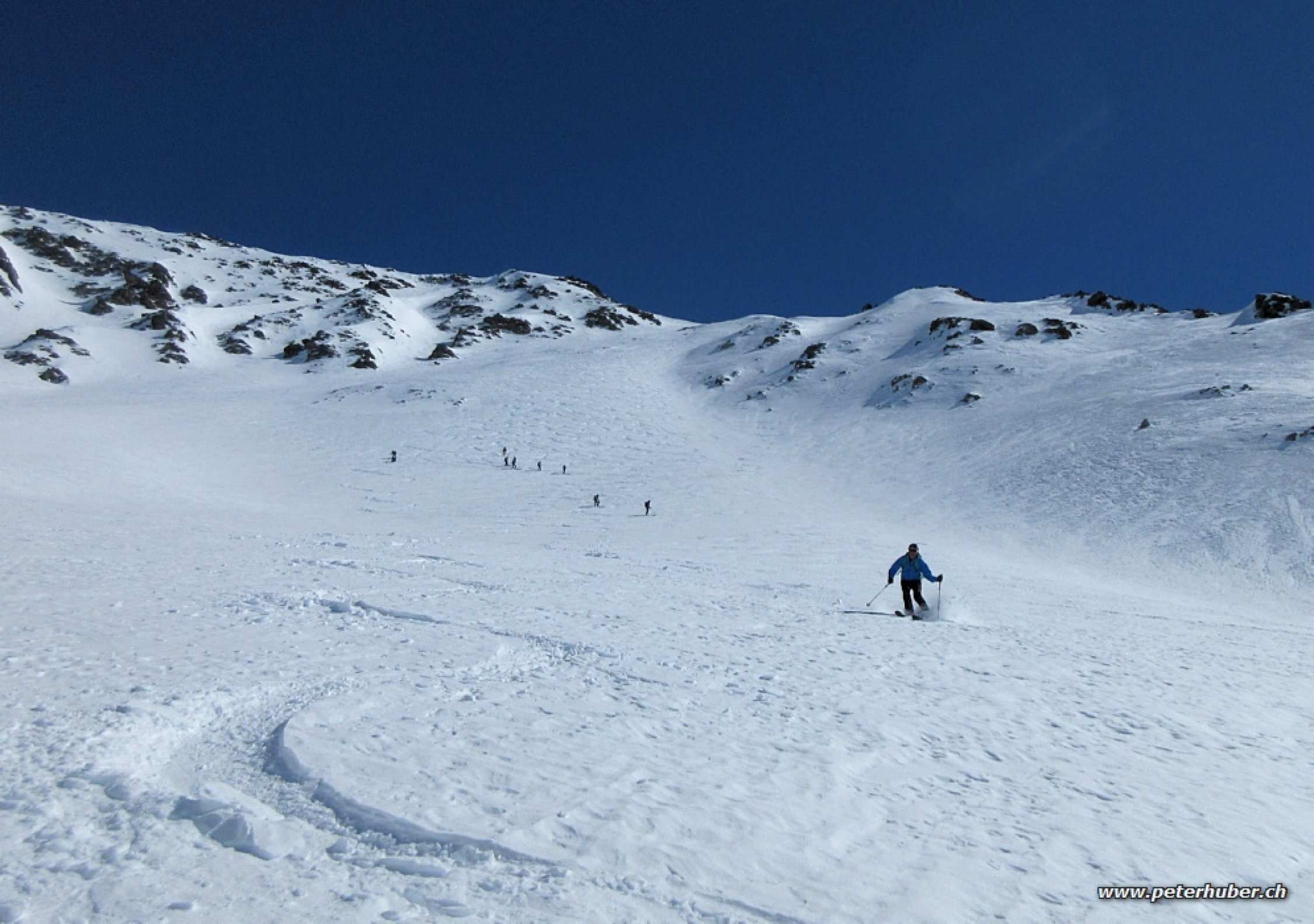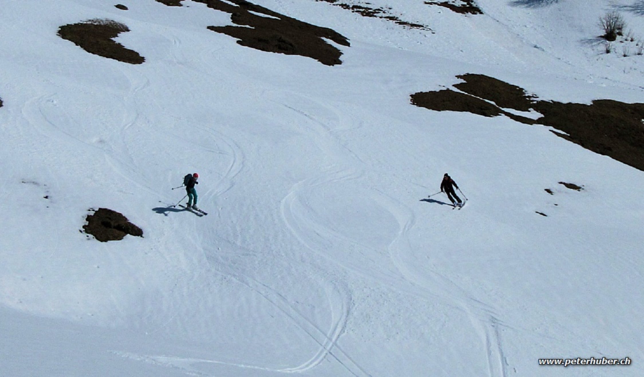 Abfahrt: Die ersten Hänge nach Lang Egg sind windgezeichneter Presspulver, mit etwas Schwung passabel zu fahren. Darunter sehr schöner Sulz mit genügend Schnee bis nach Andermatt hinunter.