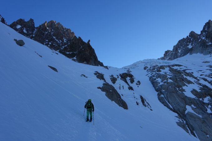 Start um 6:45 vom Ref.Argentiere(grand montets gondel ausser betrieb).Die ersten Meter sind eisig nach der Hütte und die Aufstiegsspur abgerutscht.