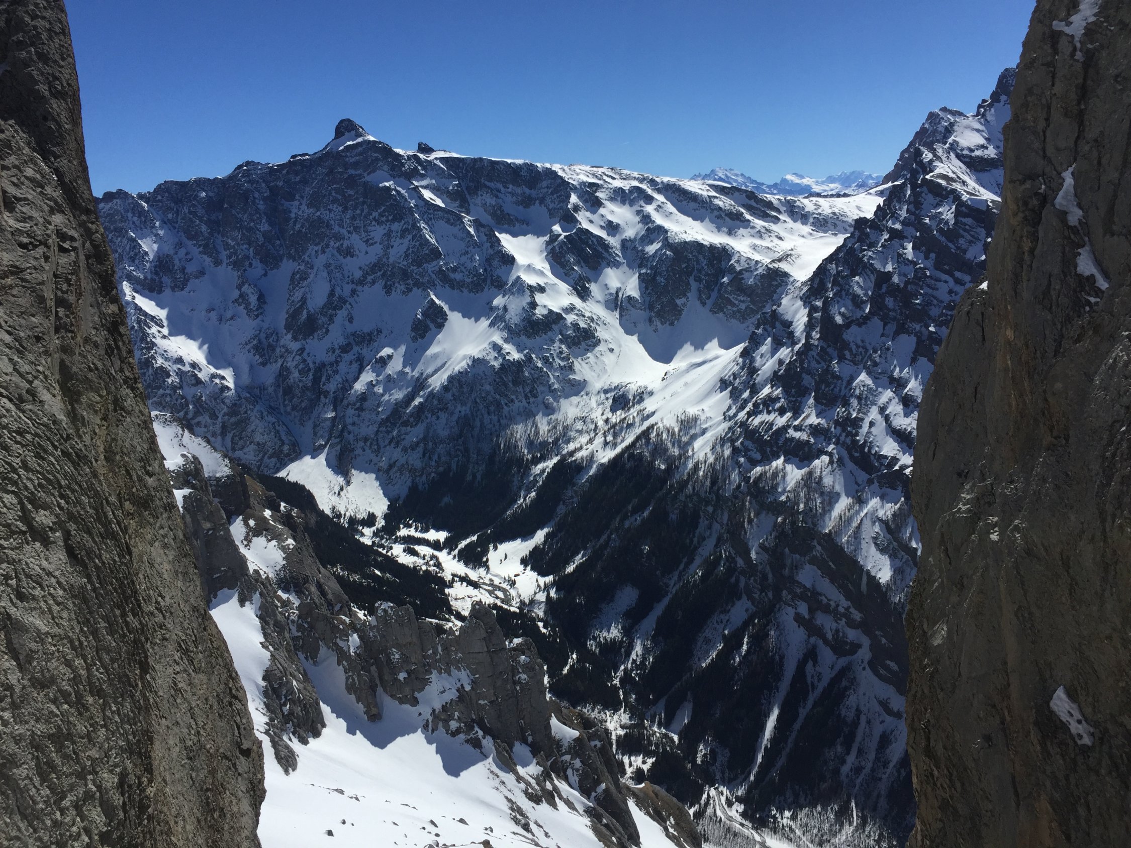 Geschlossene Schneedecke ab 1650 m. Schlüsselstelle unter Fisialp mit Trittschnee, Pickel angenehm. Darüber Harschdeckel, später Sulz. Brünnlital schönster Pulverschnee. Zuoberst dann abgeblasen/aper, wie fast immer.