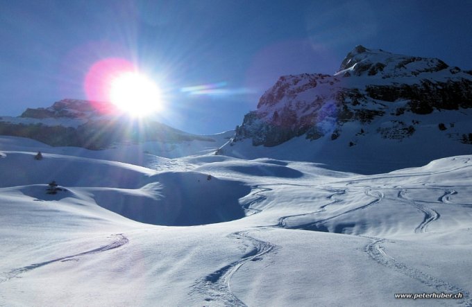 Abfahrt: Oben pulverig, doch recht verfahren. Ganz im Schatten fanden wir noch ein paar schöne Pulverabschnitte. Dann ein Abschnitt mit rasch wechselndem Schnee. Ob dem Wald wieder schön mit gutem Sulz. Wegen den vielen harten Spuren sind wir wieder über die Waldstrasse abgefahren.