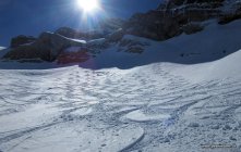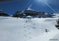 Tolles Wetter, meist windstill. Auf dem Parkplatz Weglosen wegen eines Skirennens um 8 Uhr schon viel los. Aufstieg auf der Waldstrasse mit genügend Schnee noch einige Zeit gut zu machen. Dann sehr steile Spur, oft glasig - daneben laufen geht besser. Oben im steilen Gelände ist die Spur schön griffig. Steilstufe ist sehr gut machbar, es hat viel Schnee drin.
