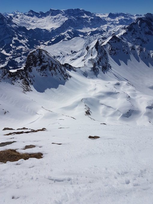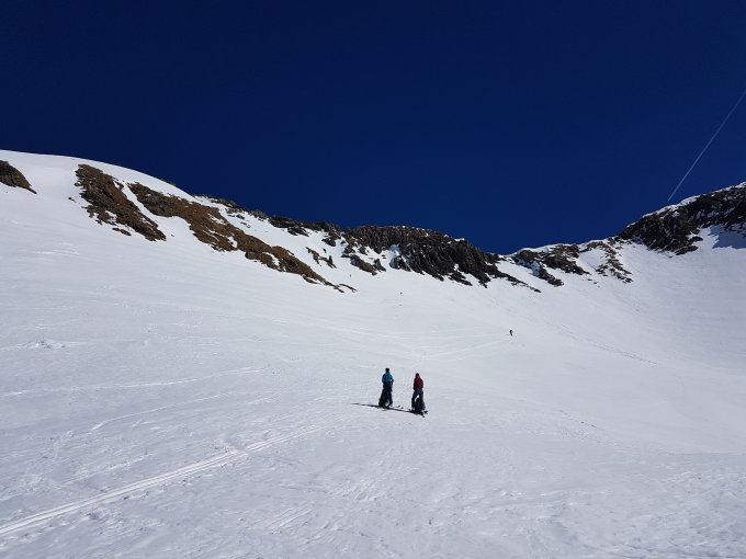 Danach hat es bis auf eine Stelle im Obertal auf ca. 2100 Meter durchgehend Schnee. Vom Oberberg zum Obertal wieder mit Harsteisen, danach war der Hang bereits im Aufstieg weich.