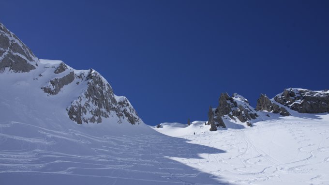 Schattseitiger Gipfelhang Pulverschnnee - Hänge des Windeckers: Firnschnee. Traumwetter, Traumbedingungen. Abfahrt ins Zalimtal: Firnschnee
