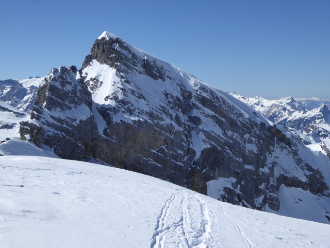 strahlend blauer Himmel, keine Wolken, windstill, auf dem Gipfel eine leichte Brise. Sehr milde Verhältnisse. Gute Spur ab Lidernenhütte vorhanden, auch an der Querung unterhalb des Chaiserstocks. Im oberen Teil Spur steil und leicht eisig, geht aber ohne Harscheisen. Gute Trittspur in der Rinne. Steigeisen können von Vorteil sein, jedoch zur Zeit nicht zwingend. Pickel hilft im Auf- und Abstieg.