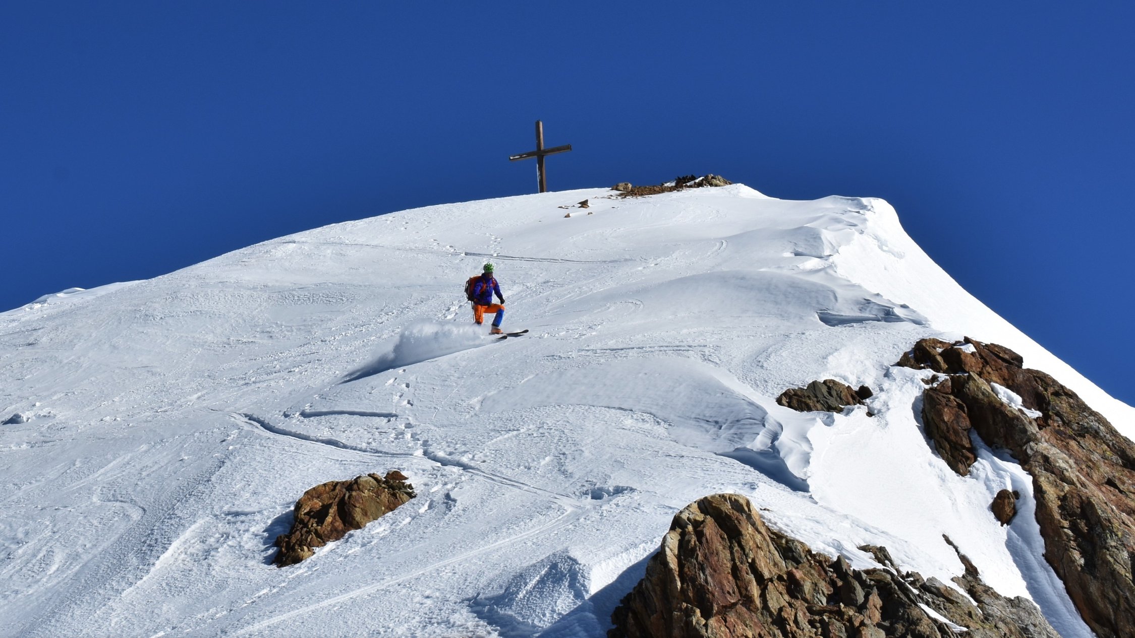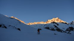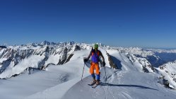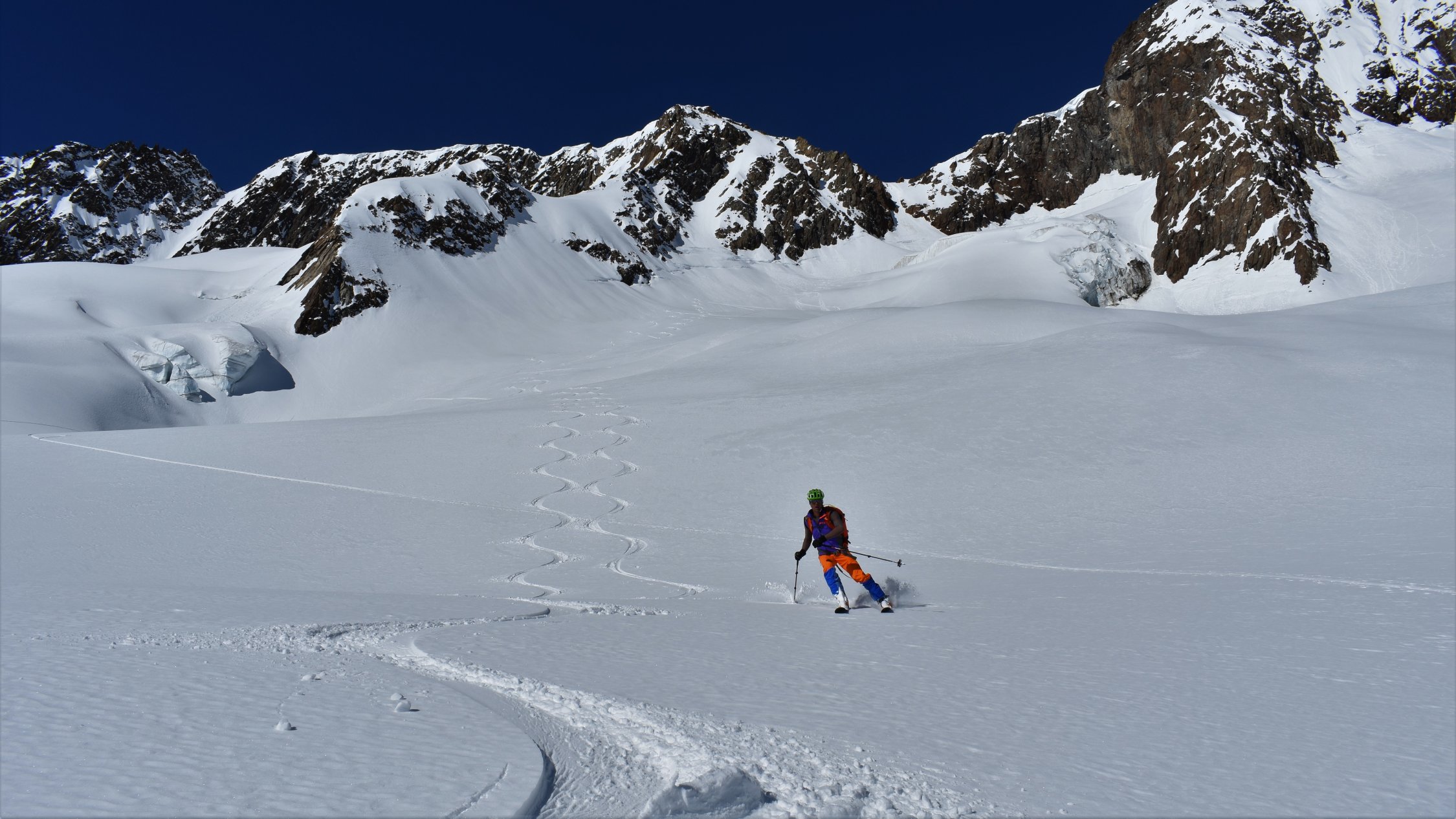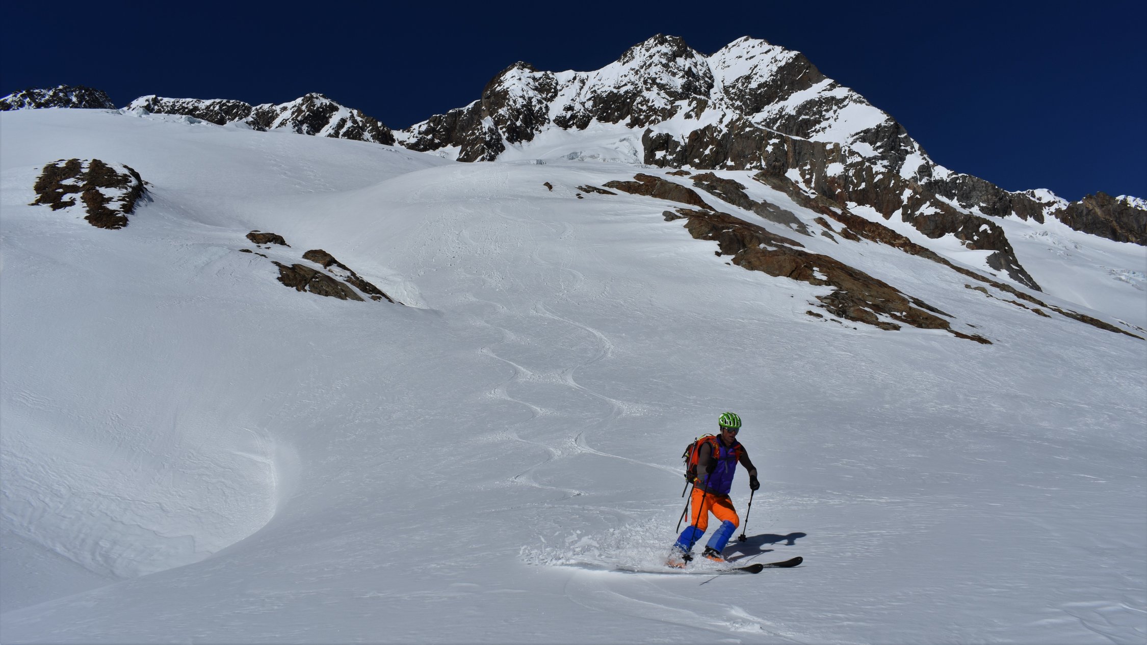 Start hinter Göschenen um 4.30 Uhr. Auf Hartschnee bis zum Voralp Rank P.1404 dann auf Sulzschnee durch den steilen Wald und weiter auf harter Spur durch das Voralptal bis zur Voralphütte. Nun Westlich über den Flachensteinfirn zum P. 3287 (ab 2600 meist Pulverschnee) bis zum Gipfel kaum noch Pulverschnee.