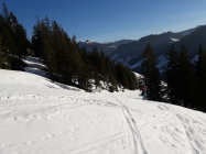 Ganz oben am Hagleren noch etwas verwehten Lockerschnee, ansonsten bei der Abfahrt, ca. 9:30 in der Sonne schon leicht sulzig.