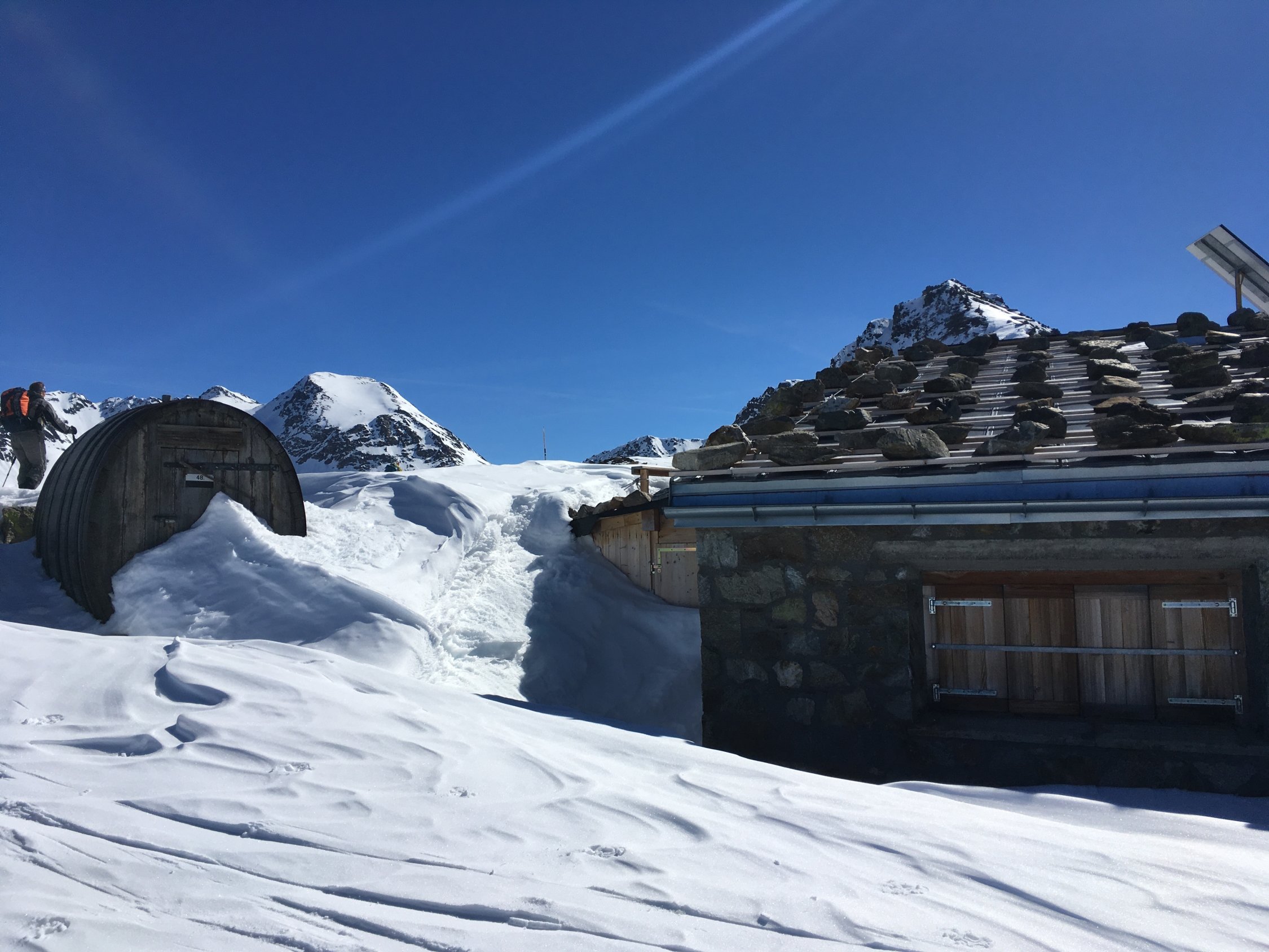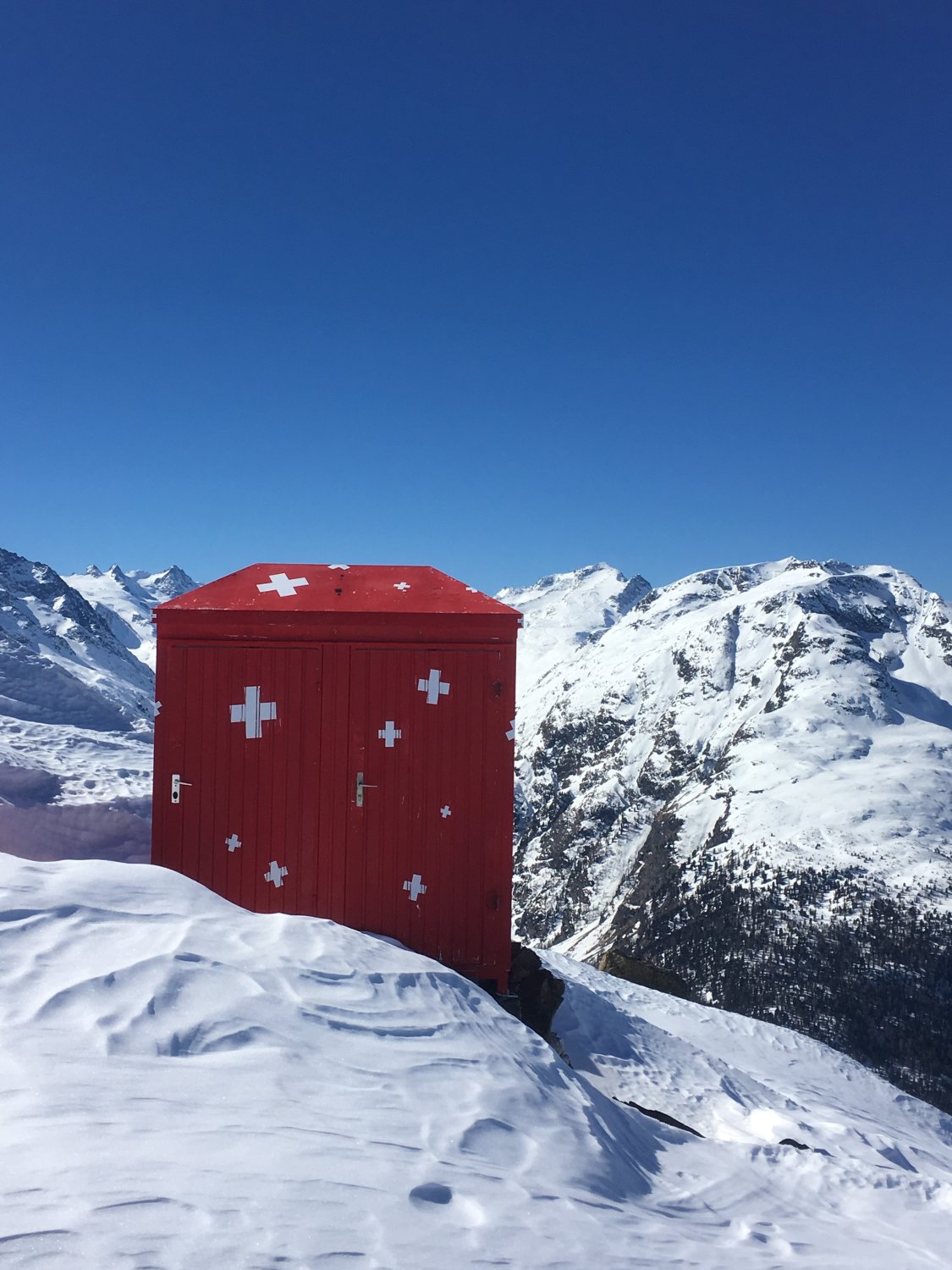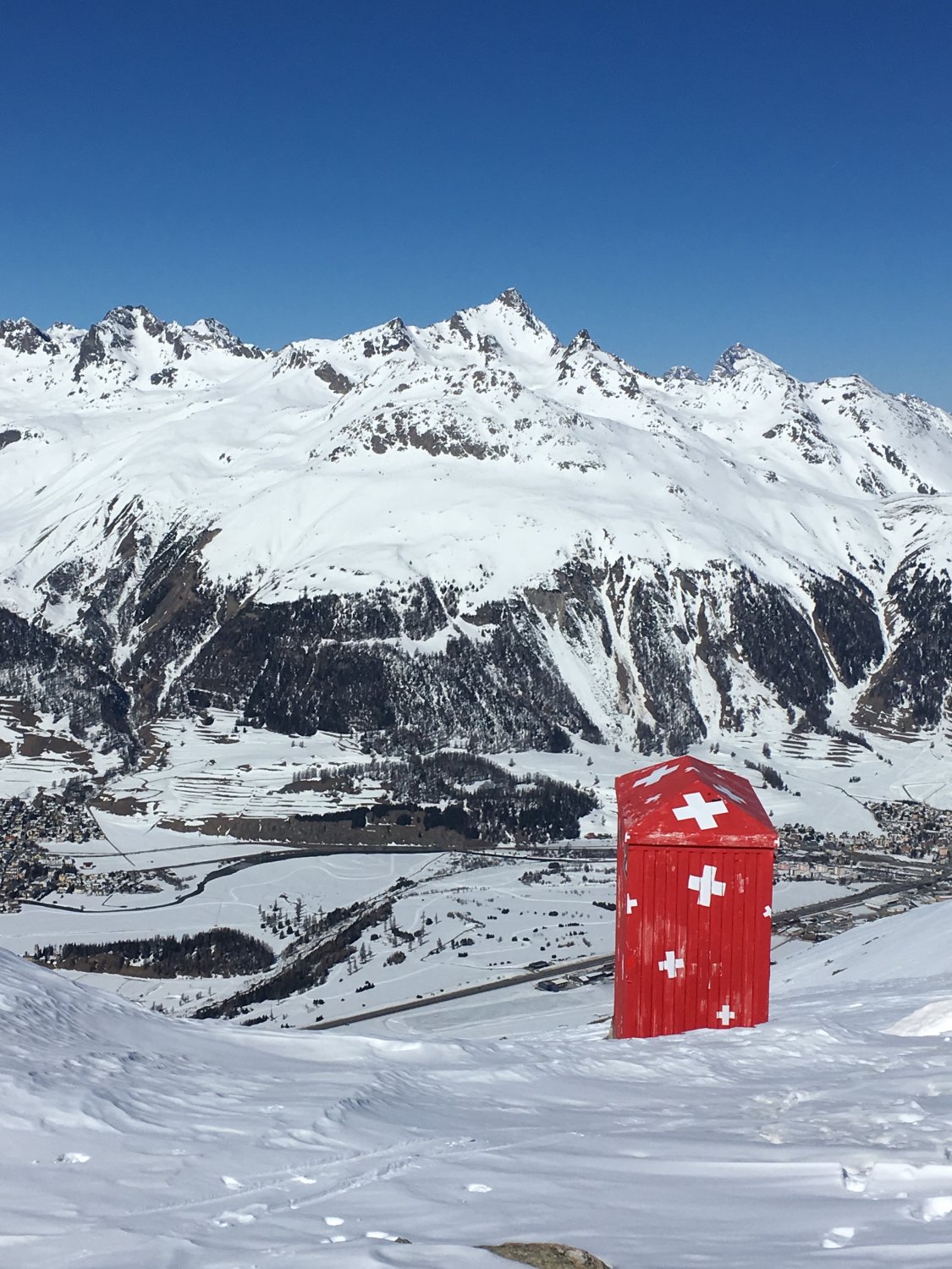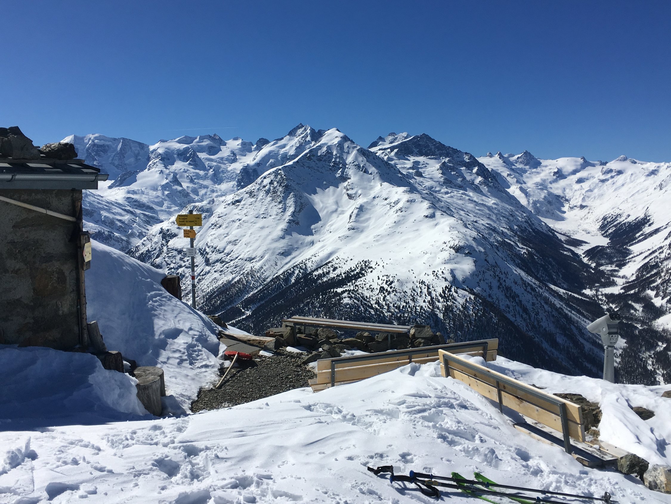Start um 8.15 Uhr Muottas Muragl 2454 m, Minus 2 Grad, windstill. Billet einfach CHF 25.00. Steile Abfahrt ins Val Muragl Hartschnee aber ausgezeichnet zu fahren. Aufstieg ab P. 2285 mit ca. 20 cm Pulverschnee, ab Rücken 2500 m Hartschnee vom Wind verblasen. Unschwierig zur berühmten Chamanna Segantini mit der schönen roten Toilette. Schaufel liegt bereit für Terasse freischaufeln. Weiter zum Aussichtsgipfel mit prächtiger Aussicht in alle Richtungen. Abfahrt direkt ab Hütte Richtung Nordosten in perfektem Pulverschnee, ca. 30 cm auf harter Unterlage in etwa dem alten Hüttenweg entlang ins Val Muragl. Unterhalb Alp Margun schöne Firnabfahrt bis Punt Muragl. Besser geht es nichr, optimale Verhältnisse.