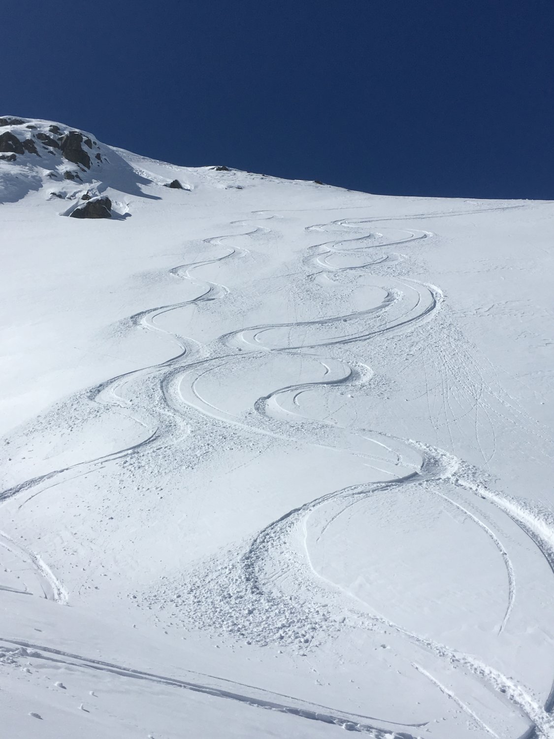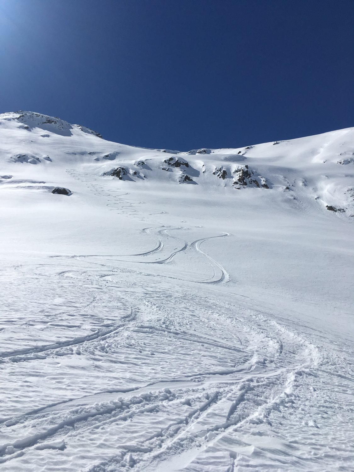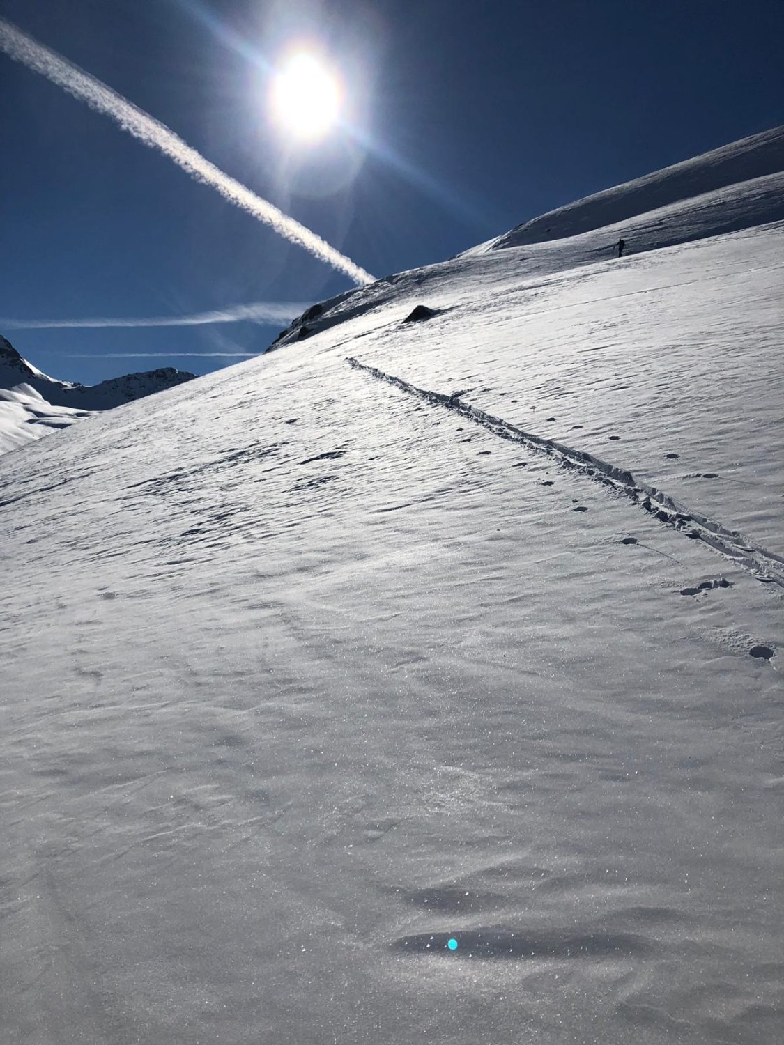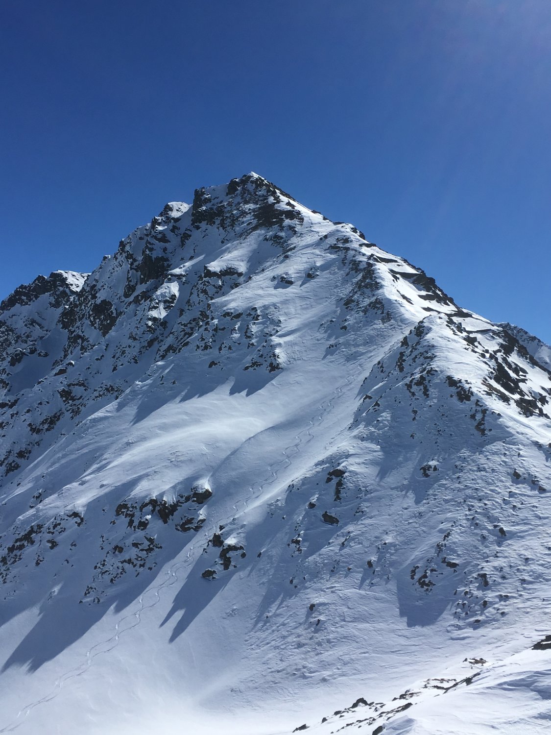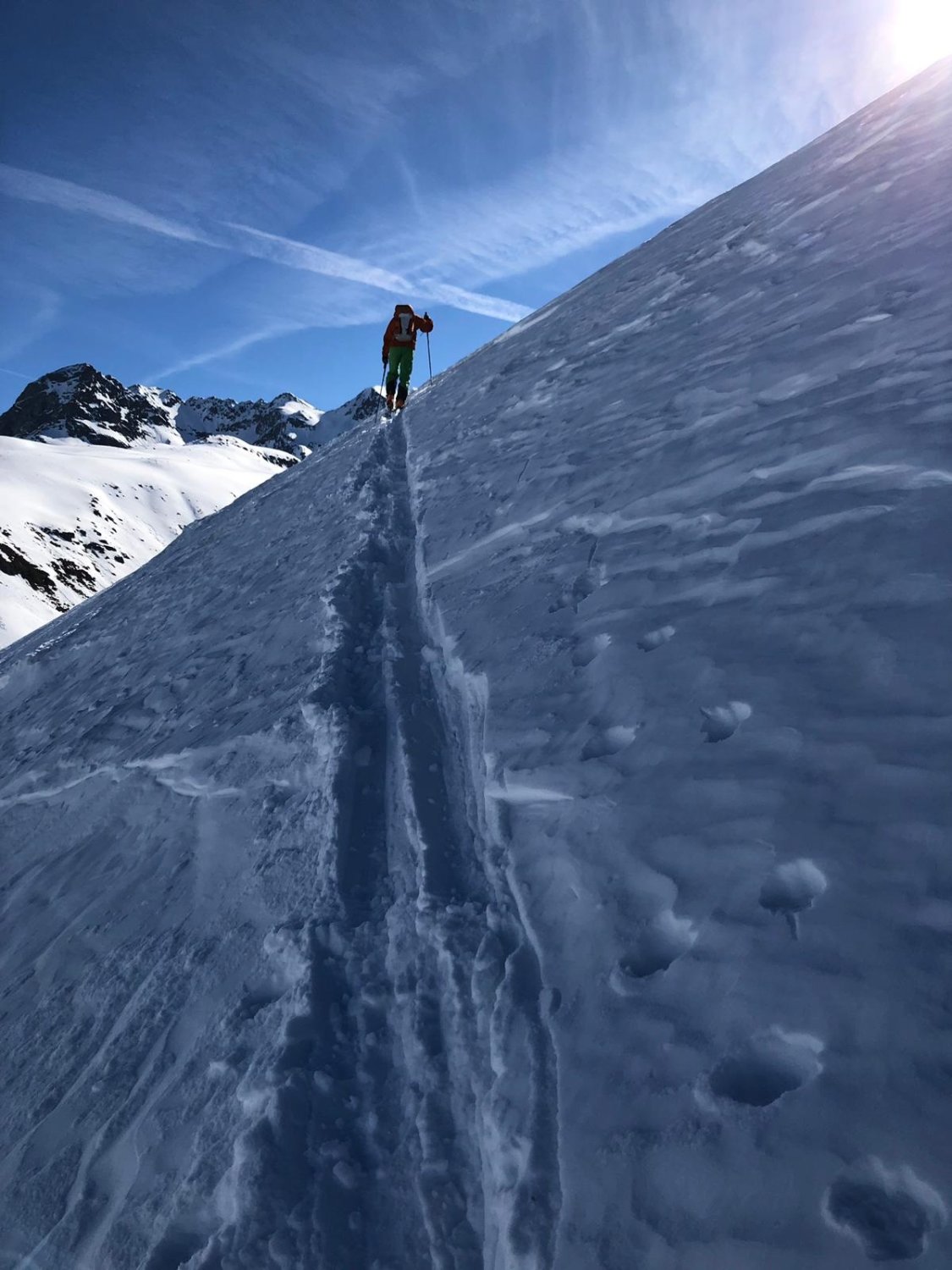 Danke Christine für das Spuren und die optimale Idee für die perfekte Abfahrtslinie. Der Berg wird ganz selten besucht, wir haben Aufstiegsspuren und schöne Abfahrtsspuren bei der Fuorcla da la Chamanna 2750 m gesehen. Die kurze Skitour kann ich wärmstens empfehlen. Es muss nicht immer eine Modeskitour sein.