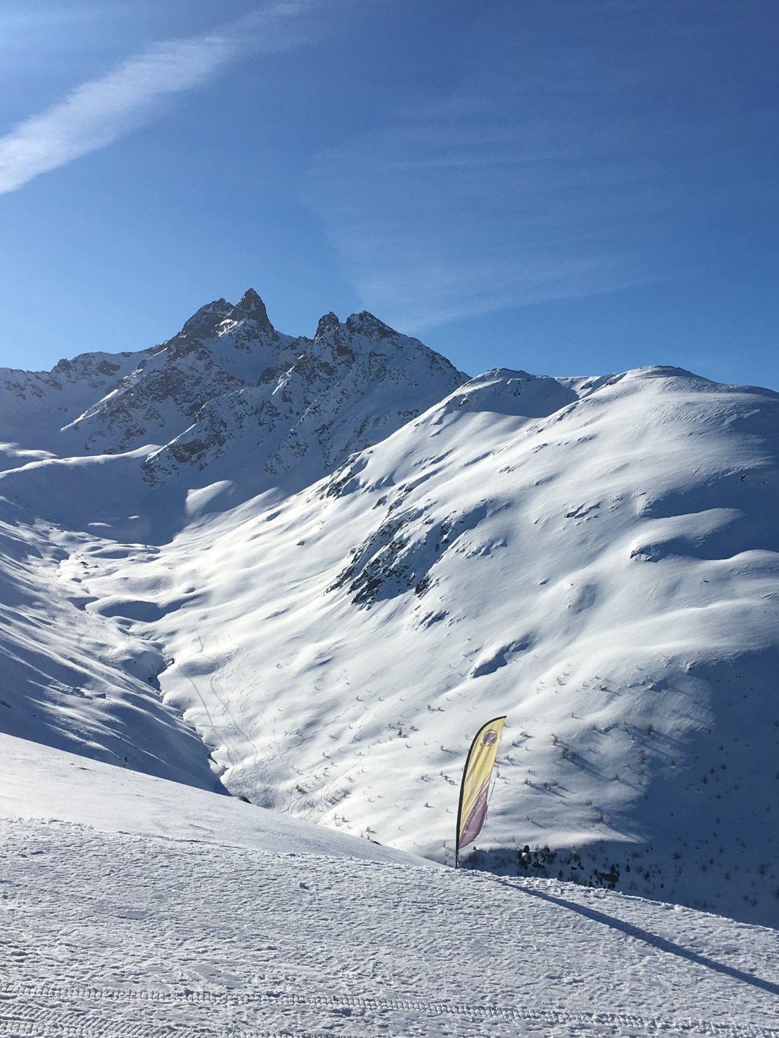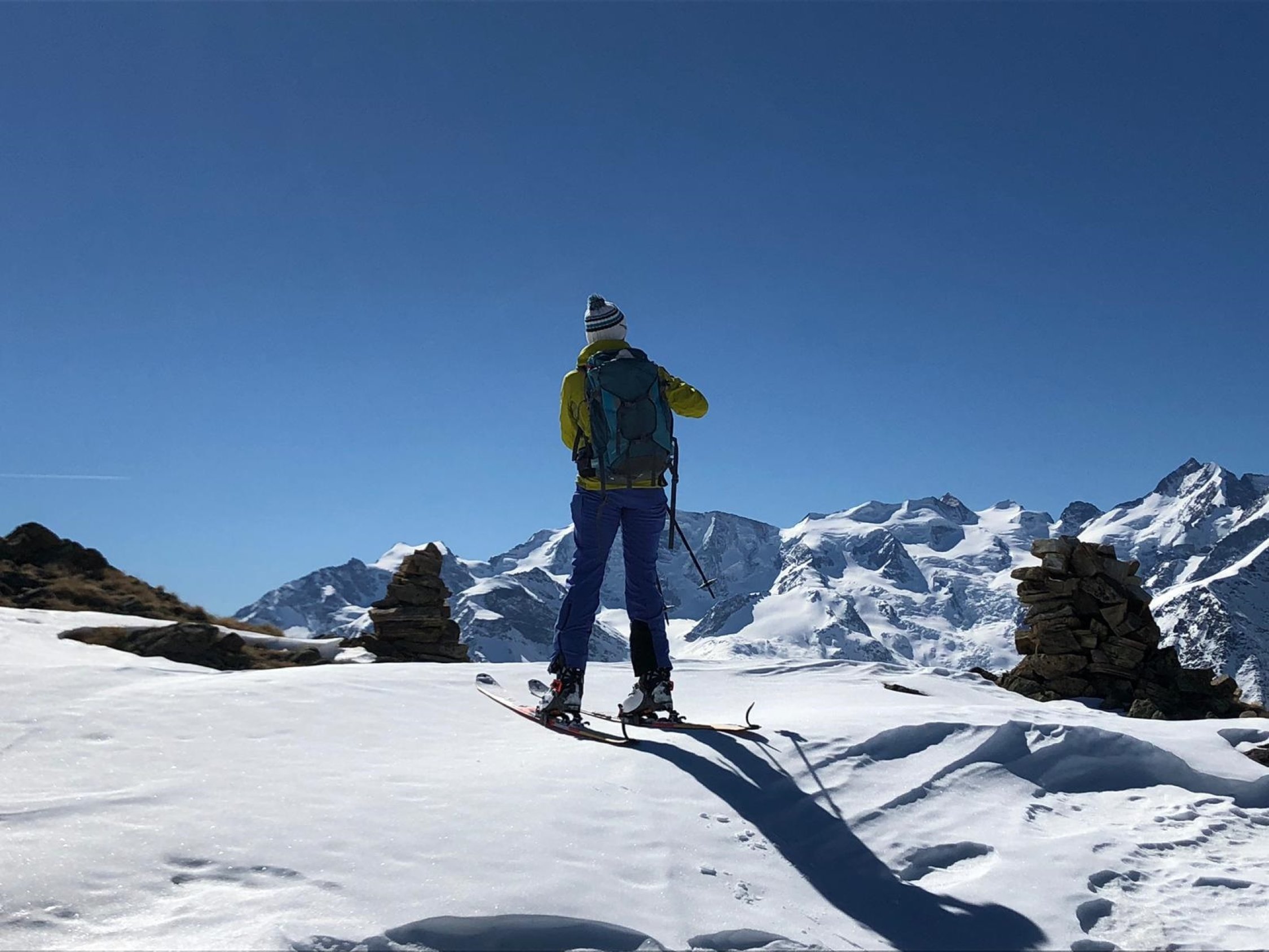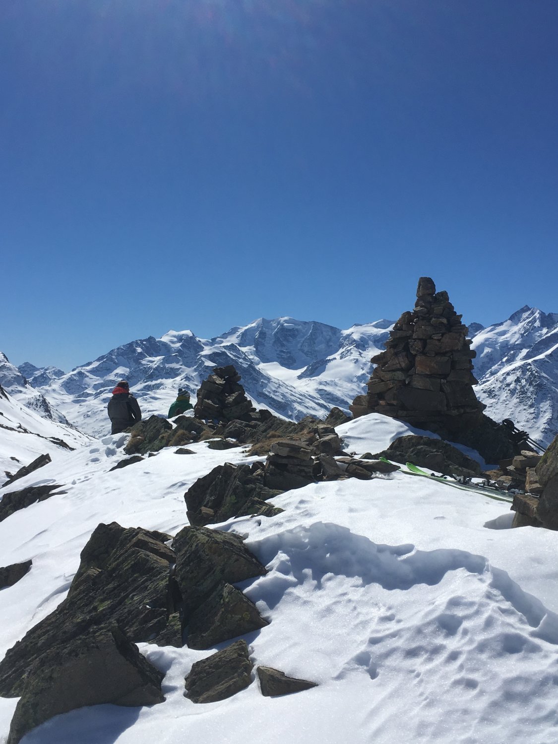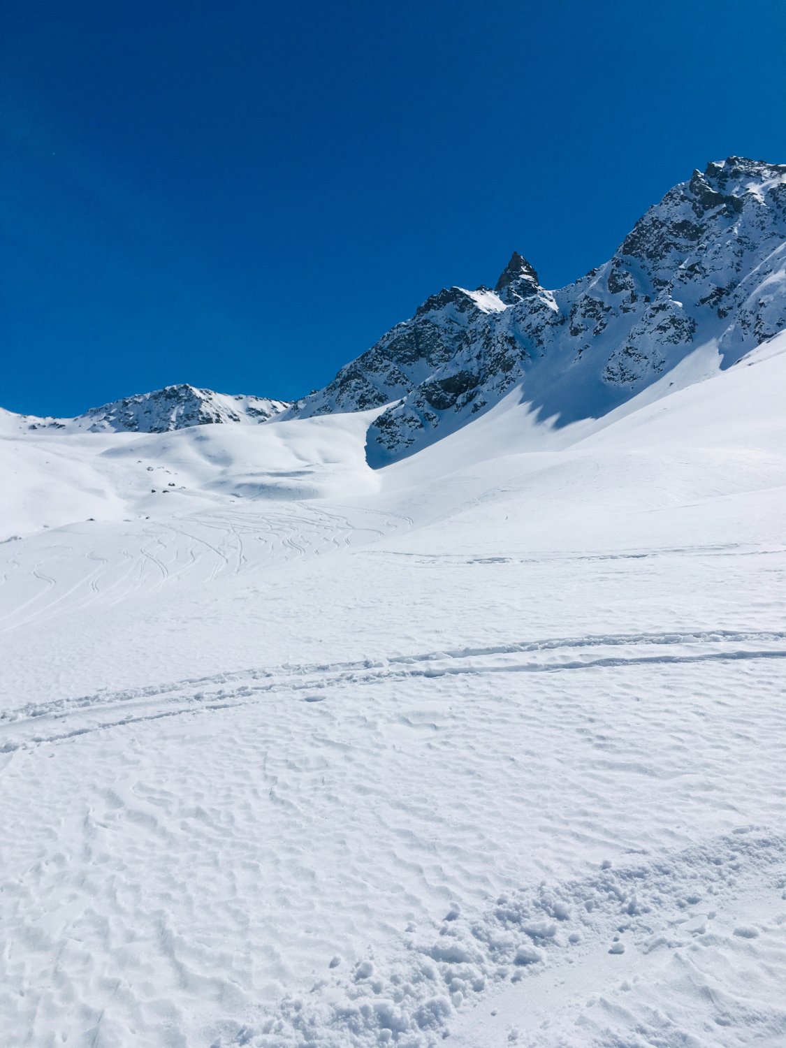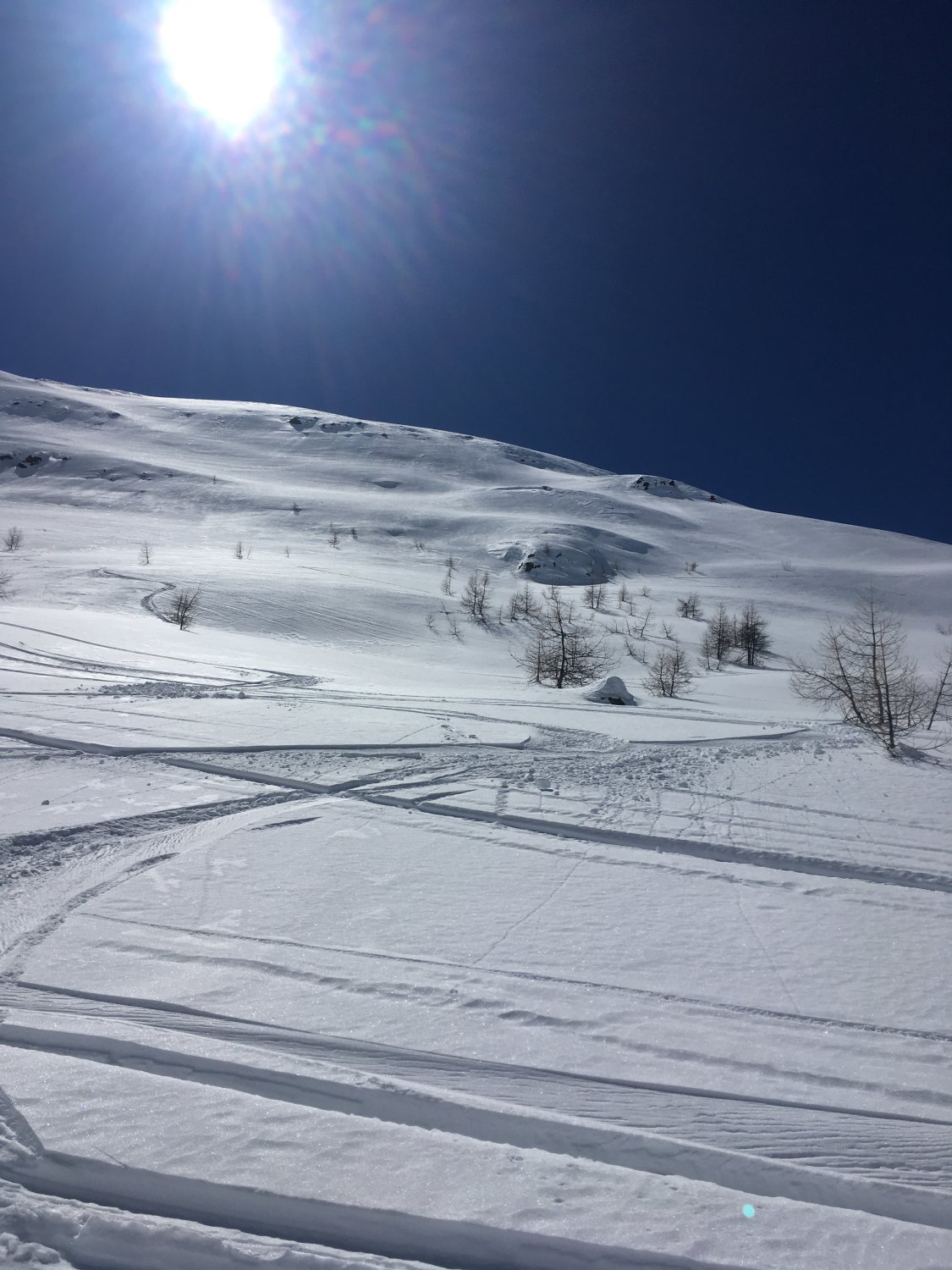 Danke Christine für das Spuren und die optimale Idee für die perfekte Abfahrtslinie. Der Berg wird ganz selten besucht, wir haben Aufstiegsspuren und schöne Abfahrtsspuren bei der Fuorcla da la Chamanna 2750 m gesehen. Die kurze Skitour kann ich wärmstens empfehlen. Es muss nicht immer eine Modeskitour sein.