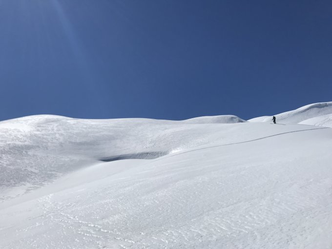 Schöne Frühlingstour auf den Piz Tomül. Am Morgen war die Aufstiegsspur noch etwas rutschig. Mit der Sonne besserte sich das rasch. Grat gut zu gehen. Ausgeprägte Spur. Bei der heutigen Lawinensituation konnte schon oberhalb der Mulde steil und direkt in die Ostflanke eingefahren werden. Toll!