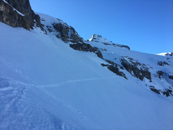 Gipfelhang Presspulver, gut fahrbar, Querung und Traversierung zur Sefinenfurgga dann hart, ruppig.