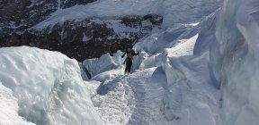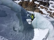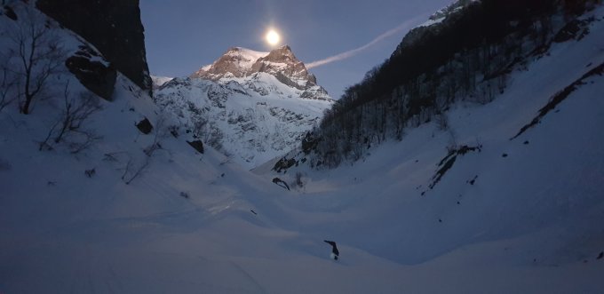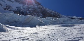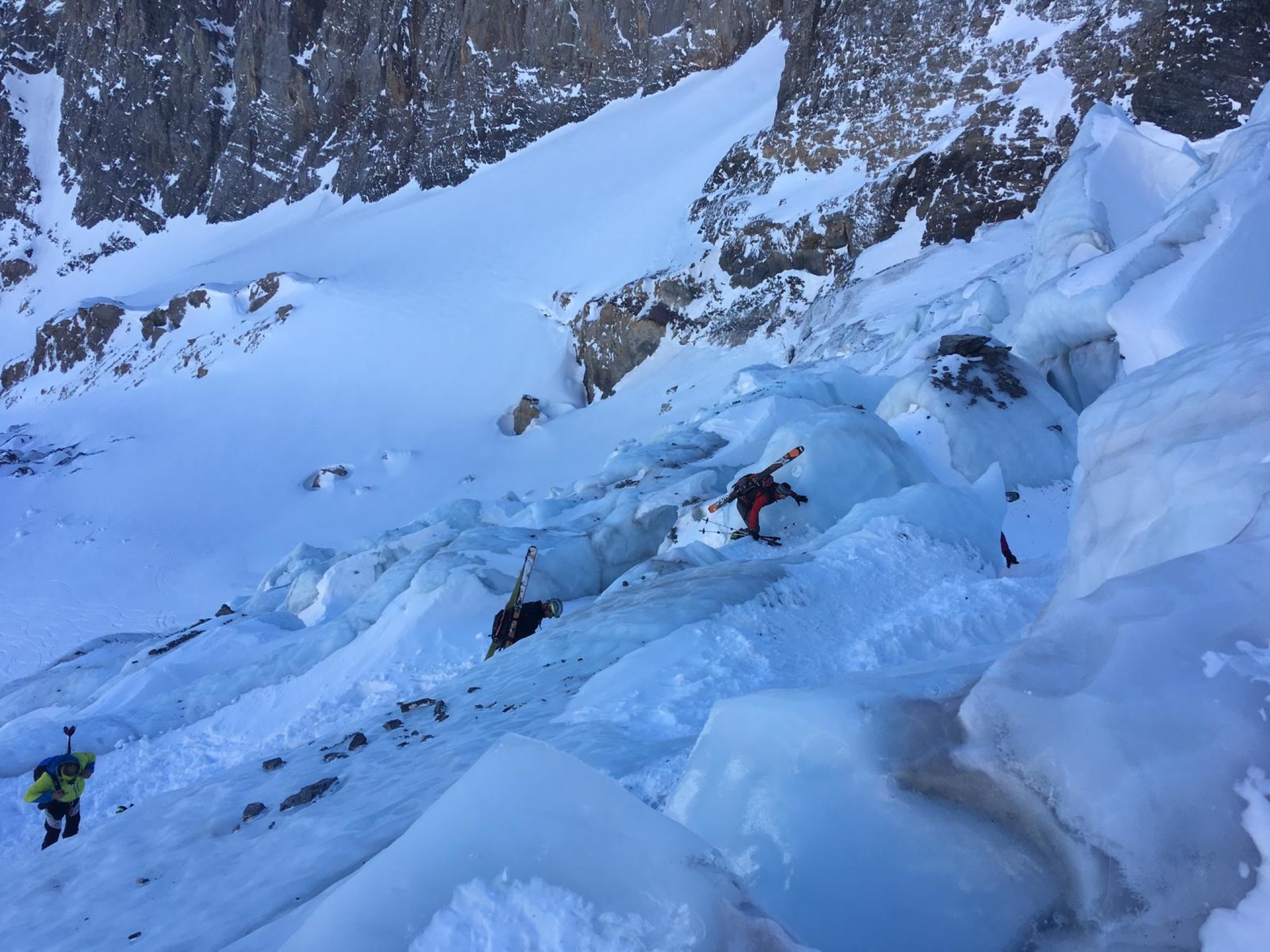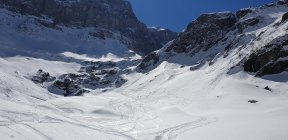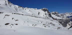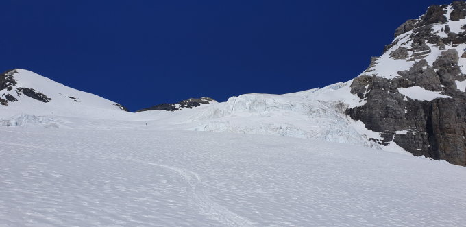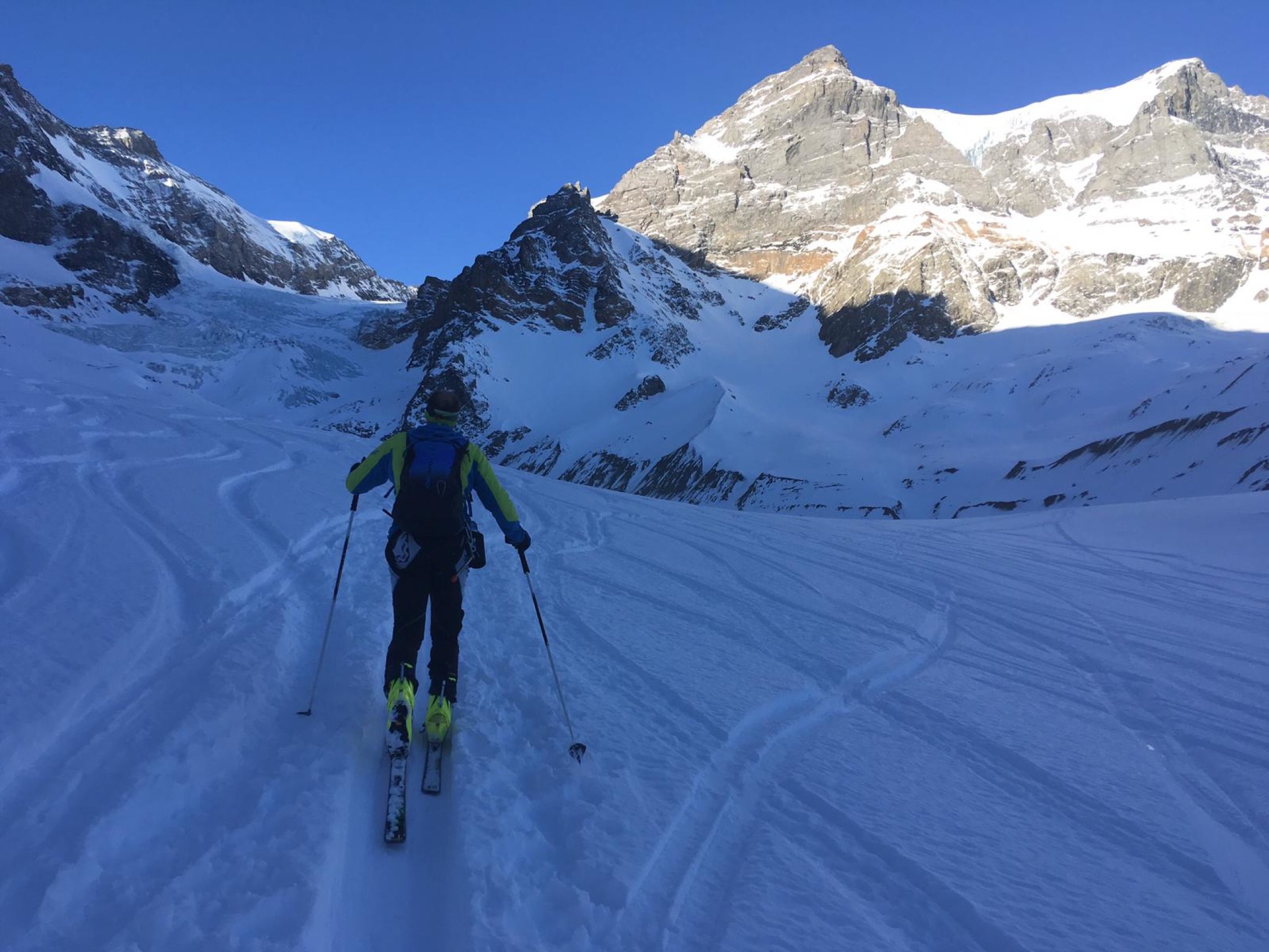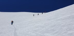 Bei der Abfahrt am Gipfelhang leichter Deckel, weiter unten zum zweiten Gletscherabbruch etwas verblasen, ab dem ersten Abbruch wurden die Verhältnisse für die Abfahrt wieder sehr gut.