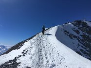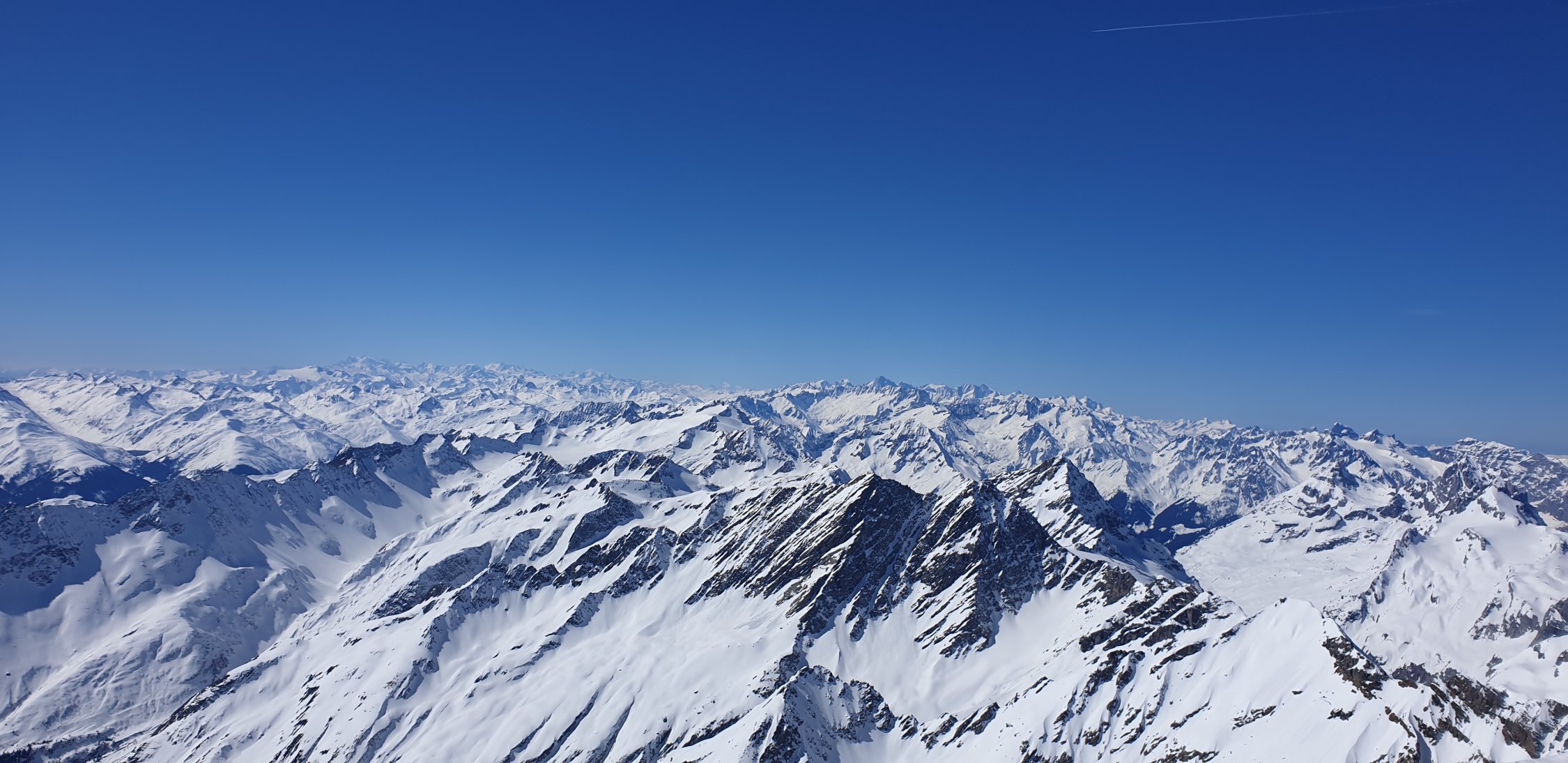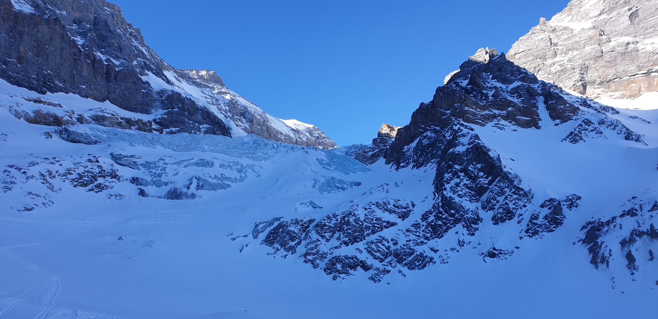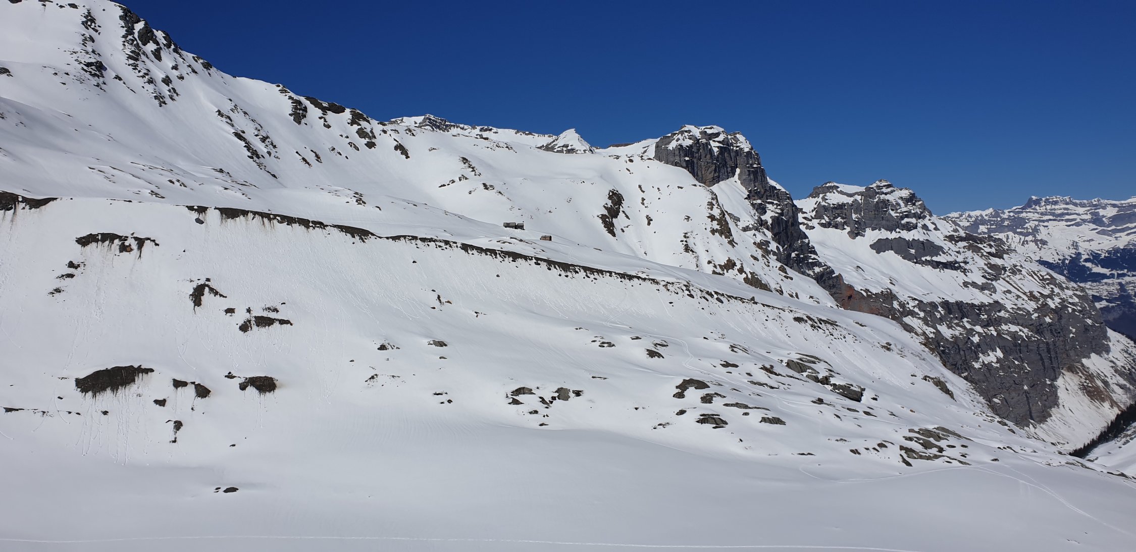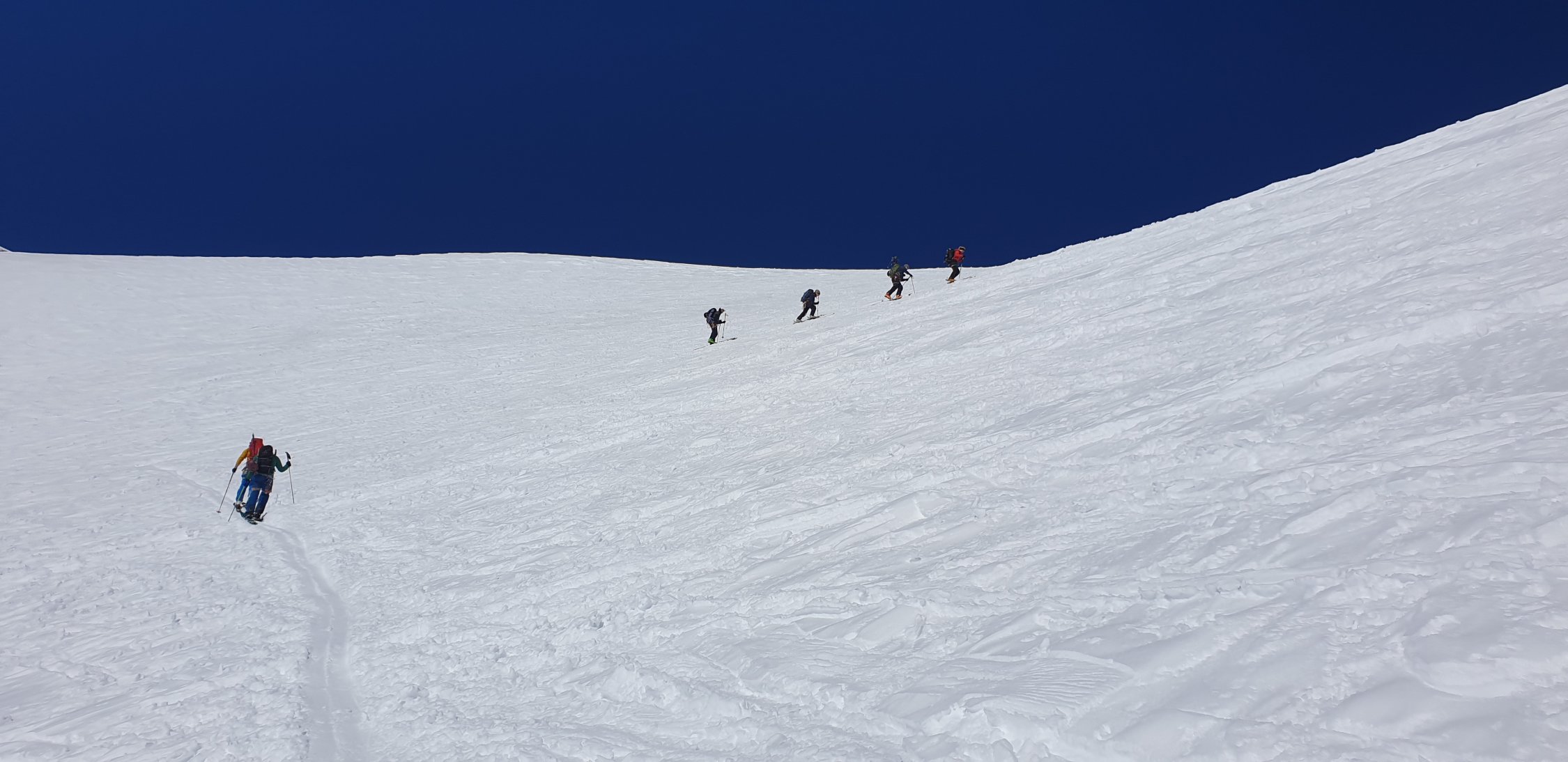 Start der Tour am 4.30 Uhr beim Tierfehd , bei einer Temperatur von 2 Grad, auch das Wetter heute sehr sonnig mit wenig Wind, die Ski konnten beim Parkplatz immer noch montiert werden, beim Tunnel mussten die Ski kurz getragen werden, die Spur entlang der Strasse nach Hintersand war sehr glasig, beim Aufstieg durch den Wald dann wieder griffiger, ab 1800 Meter immer noch Puverschnee, der erste Gletscherabbruch wird rechts umgangen, die Schneerus hat keinen Schnee zur Zeit, am Ende des zweiten Gletscherabbruchs mussten die Ski getragen werden, nur eine Meter hohe Stufe war Blank, dort wurde gemeiselt, die Portage konnte auch ohne Propleme ohne Steigeisen gemacht werden, der weiter Aufstieg um Gipfel erfolgte auf einer sehr gut angelegten Spur, die Fernsicht war heute extrem gut, nach Westen bis zum Mont Blanc nach Osten der Ortler im Südtirol.