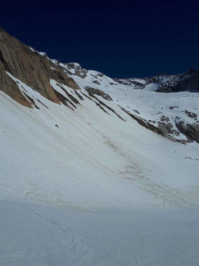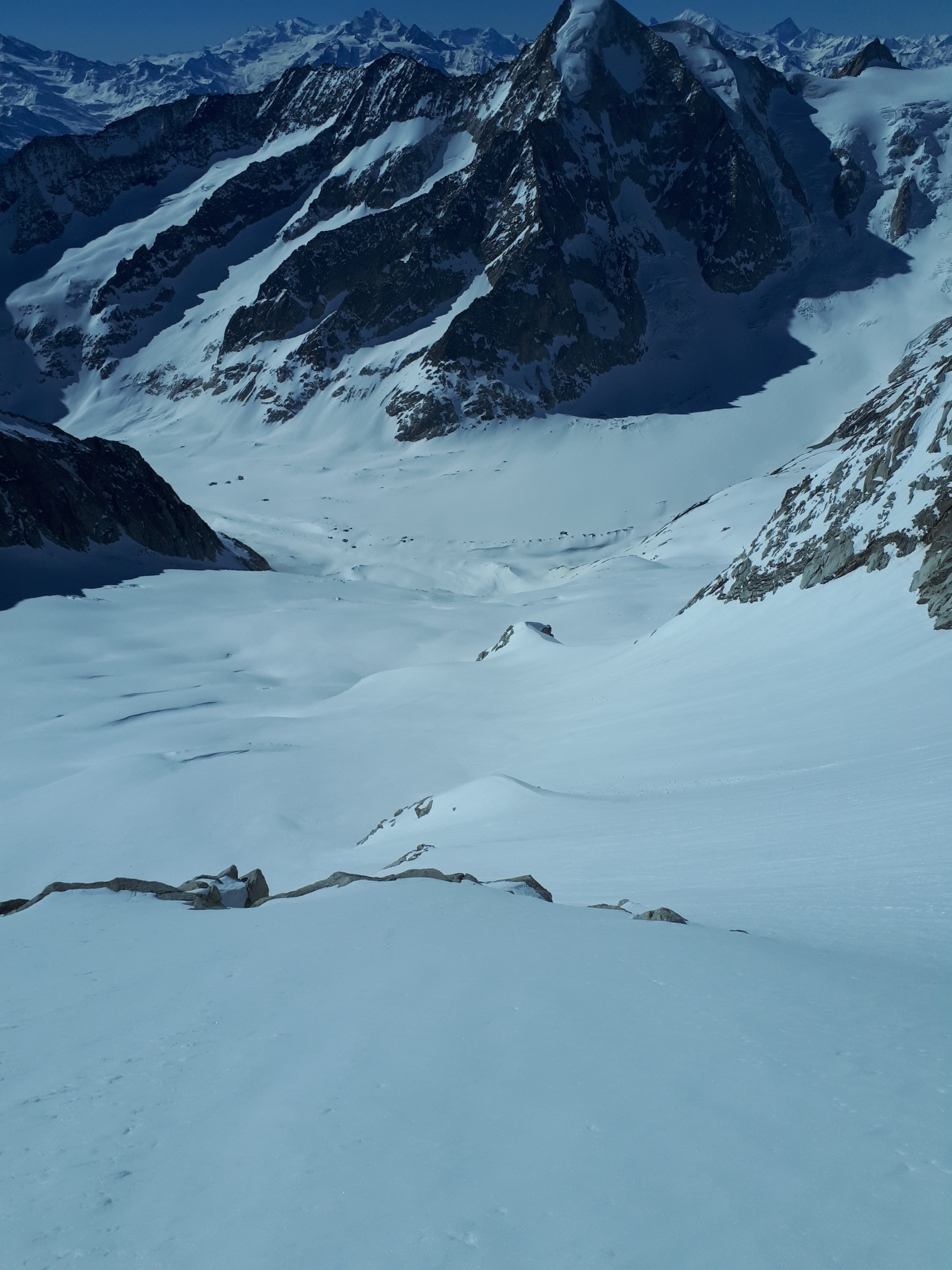 Top Verhältnisse auf dieser Tour ab Oberaletschhütte. Vom Gletscher weg steil mit Harscheisen aufgestiegen bis 300m unter den Gipfel. Dann direkt mit den Steigeisen auf den Gipfel. Mit Ski vom Gipfel abgefahren. Ost war schön angesulzen. Beichpass war auch super mit den Ski zu fahren.