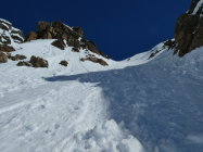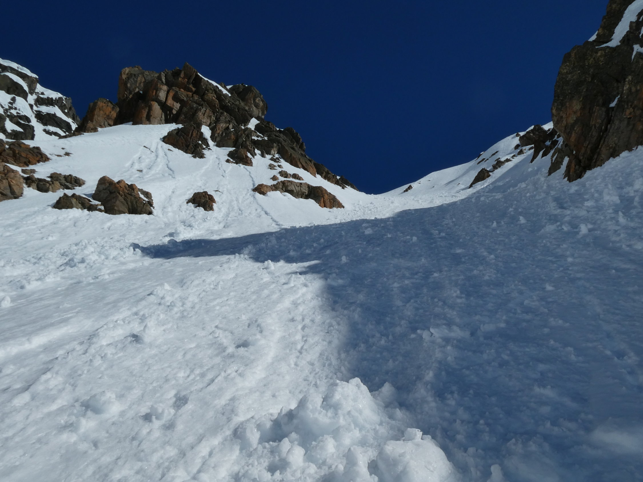 Top Verhältnisse, das Couloir im Aufstieg hat Trittschnee