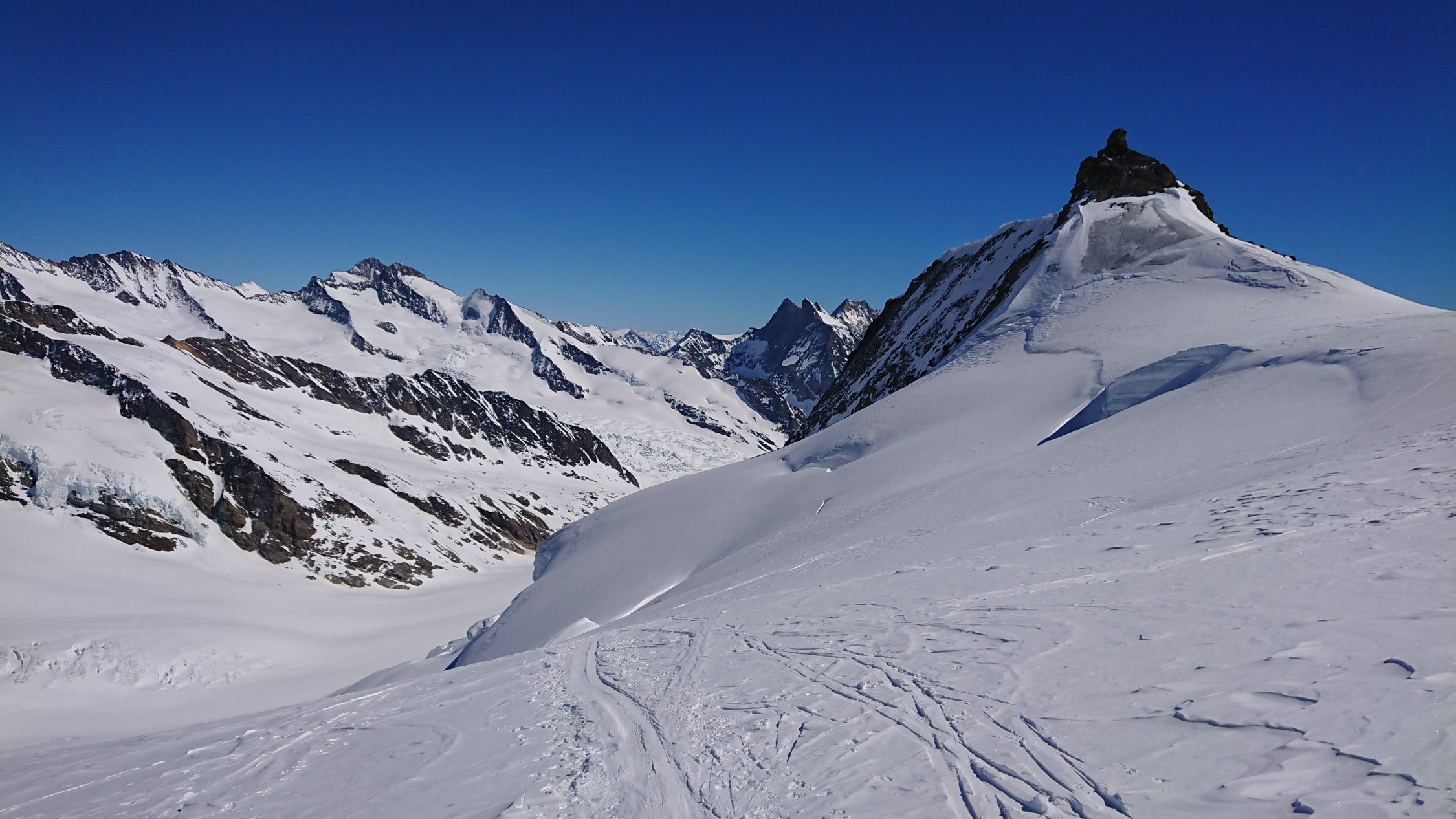 Super Spur vom Joch zum Louwitor. Gletscher sehr gut eingeschneit. Abfahrt über Kranzbergfirn sehr gut, Spalten gut eingeschneit. Oberhalb vom Bruch ein bisschen umsichtig sein, ein Spalt tut sich langsam auf und viele Spuren führen drüber, mit etwas "Gas" und Nervenkitzel gut "überfahrbar", aber wird sich sicher weiter öffnen und scheint tief/gross. Autobahn Richtung Lötschenlücke wie üblich.
