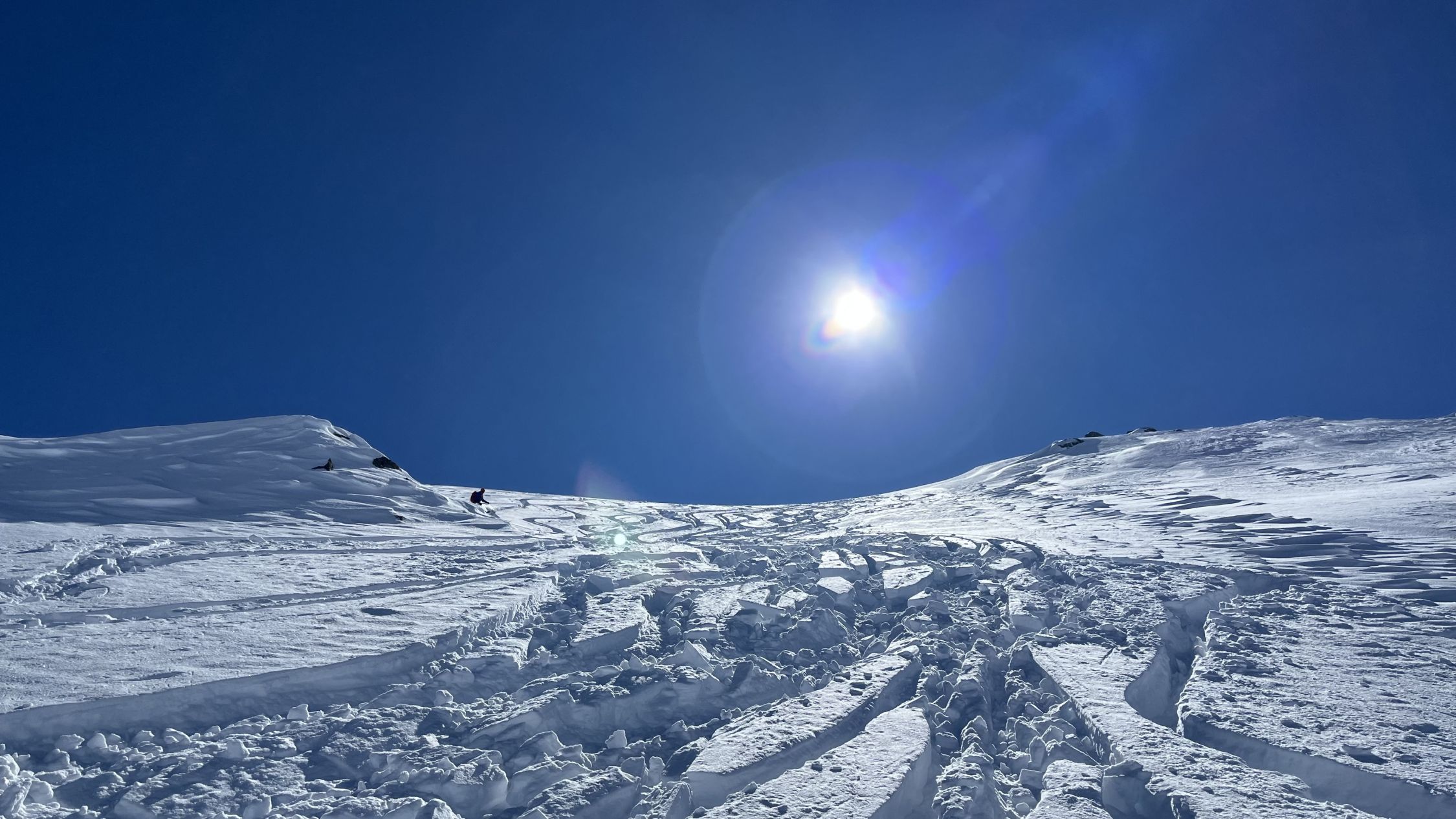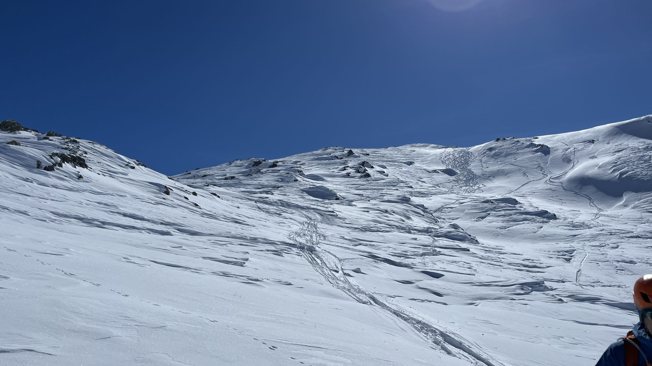 Wechsel zwischen sehr tiefem und nicht verfestigten Neuschnee unten und stark windverpressten Stellen. Viele Wumm-Geräusche im oberen (flachen) Bereich zu hören, zeitweise war das Setzen der Schneedecke sogar zu spüren. Oben stark windbeeinflusste Schneedecke, Abfahrt dadurch mäßig.