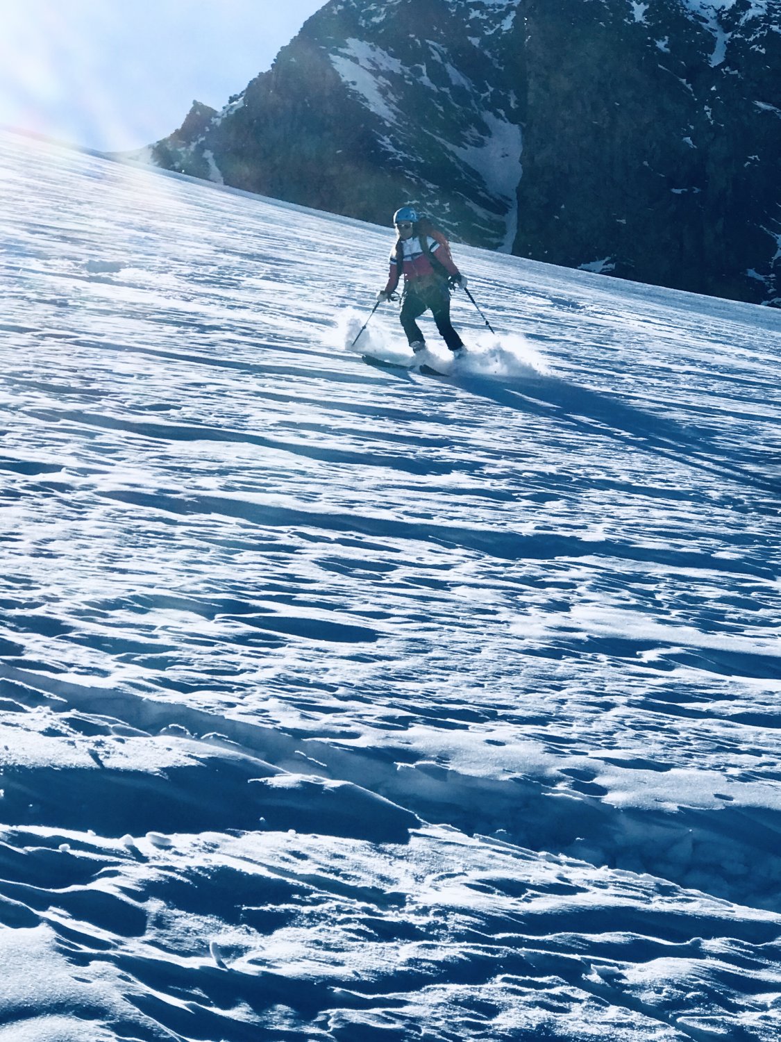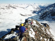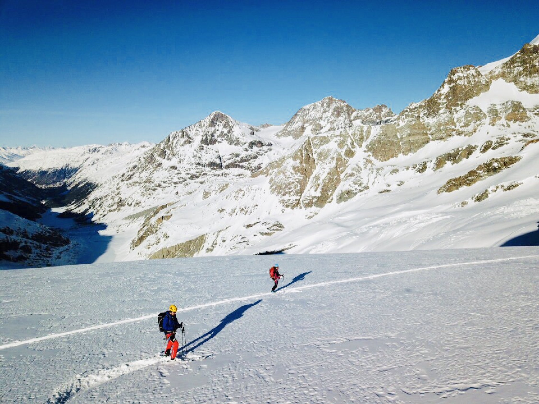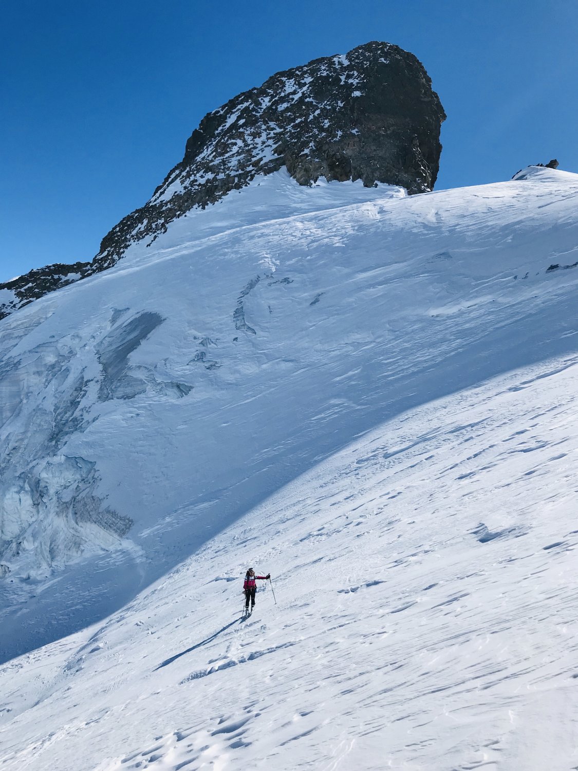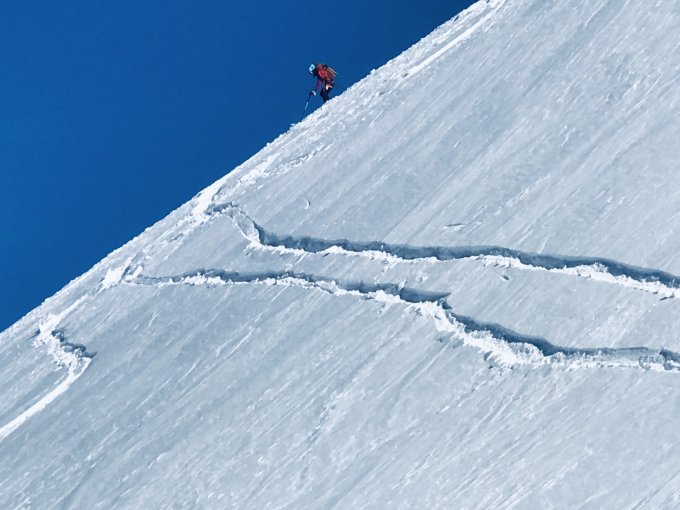 Es herrschen ausgezeichnete Verhältnisse im ganzen Gebiet. Wir waren alleine unterwegs. Gletscher/Spalten sind sehr gut eingeschneit. Grat zum Glüschaint schneefrei, Abseilstelle schmilzt unten Schnee langsam weg (50 Meter Seil von Vorteil, sonst 2 x abseilen) Da nordseitig, Pulververhältnisse bis runter. Wind hat allerdings in Gipfelnähe seine Spuren hinterlassen - oft Presspulver aber erstaunlicherweise gut zu fahren. Mittelteile, unterhalb 3200m bis Hütte genial zu fahren.