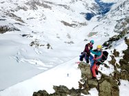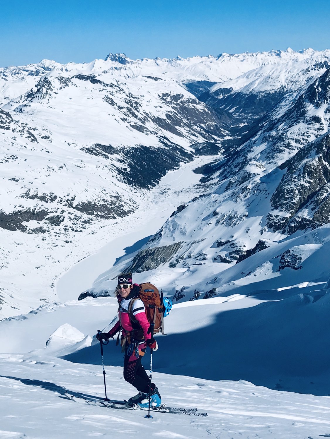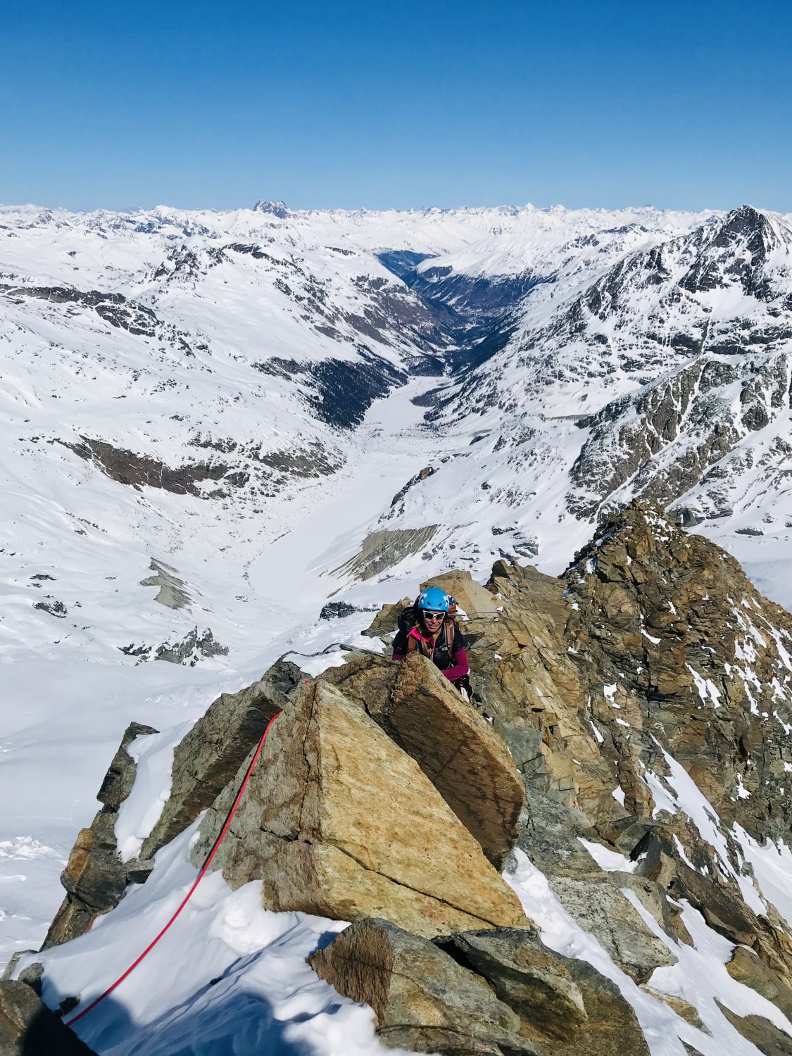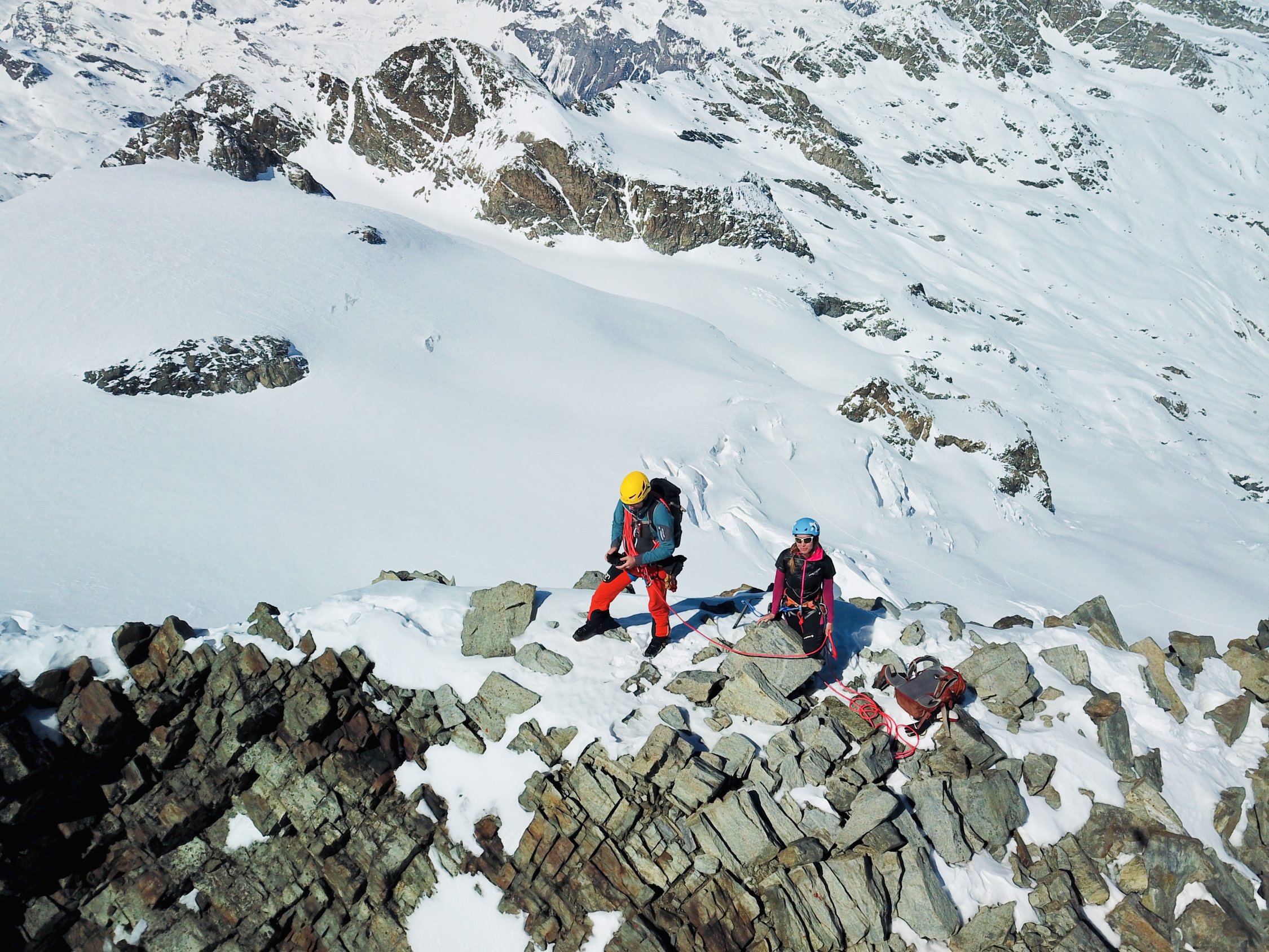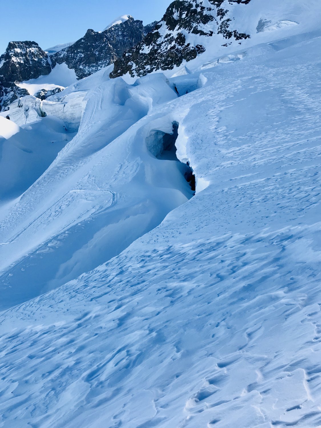 Es herrschen ausgezeichnete Verhältnisse im ganzen Gebiet. Wir waren alleine unterwegs. Gletscher/Spalten sind sehr gut eingeschneit. Grat zum Glüschaint schneefrei, Abseilstelle schmilzt unten Schnee langsam weg (50 Meter Seil von Vorteil, sonst 2 x abseilen) Da nordseitig, Pulververhältnisse bis runter. Wind hat allerdings in Gipfelnähe seine Spuren hinterlassen - oft Presspulver aber erstaunlicherweise gut zu fahren. Mittelteile, unterhalb 3200m bis Hütte genial zu fahren.