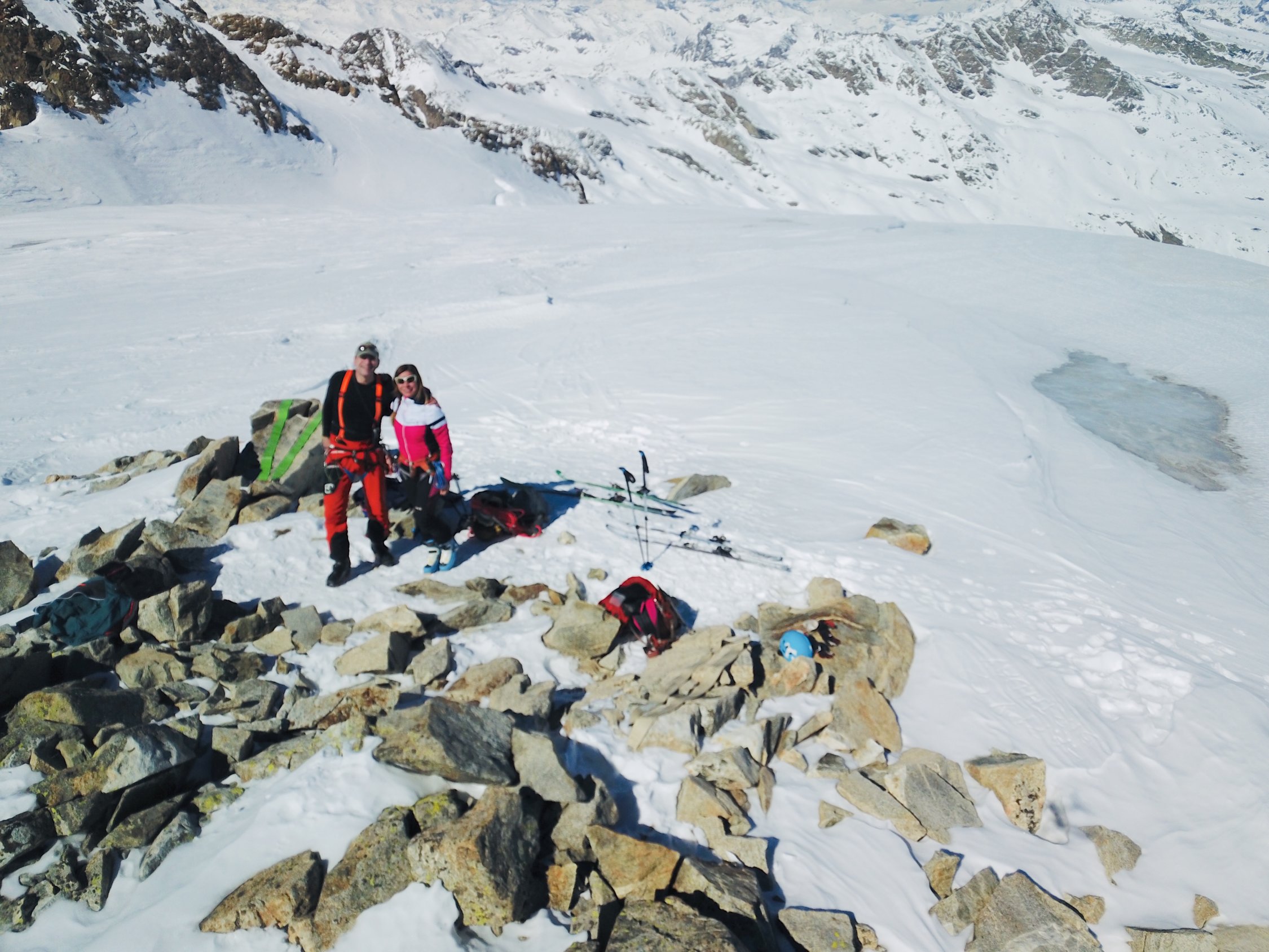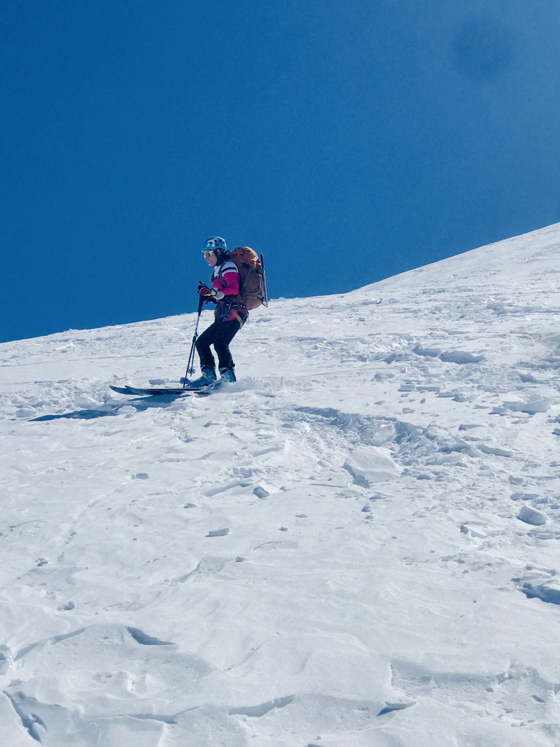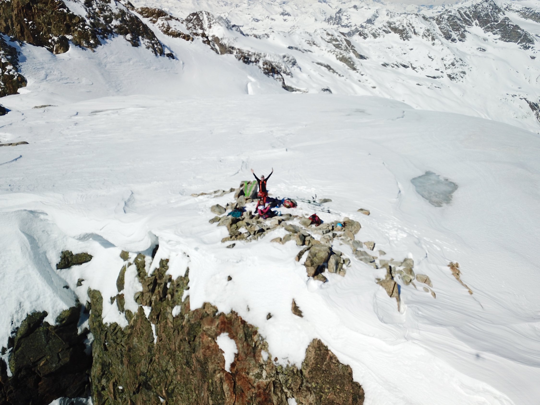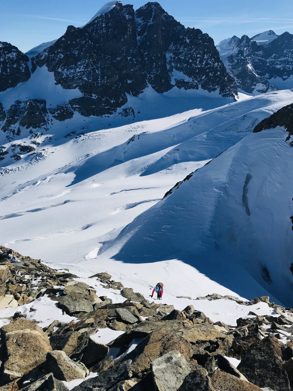 Prächtiger zweiter Tourentag ab Coazhütte. Heute gings früher los, da die Marinelli-Truppe etwas gemütlicher unterwegs war. Immer noch Pulver in den Schattenhängen auf unserem zu La Sella und zum ersten Dschimels - der andere Zwilling war leider schon blank oben und der etwas östlichere Piz Sella wies auch schon glänzende Eisflächen auf. Wir entschieden auf frühe Abfahrt, was sicher nicht verkehrt war bei der Wärme, da wir durchs Val Roseg rausfuhren und so noch zeitig die momentan stark besonnten Osthänge auf 2200/2300 queren mussten. Diese stellten bei der Wärme lawinentechnischen sicher die ernsthaftere Gefahr dar, als die Touren in der höhe selbst.