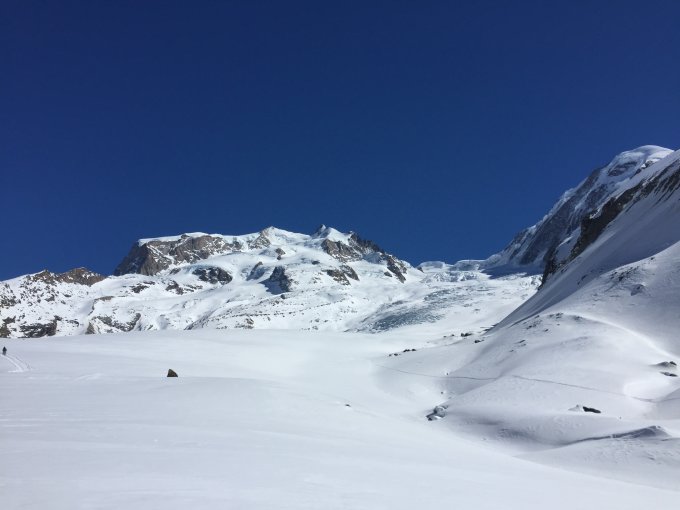 Am Vortag ohne Bahn der Piste entlang zum klein Matterhorn und anschließend auf den Roccia Nera. Danach Schwarztor abfahrt und aufstieg zur Monte Rosa Hütte.