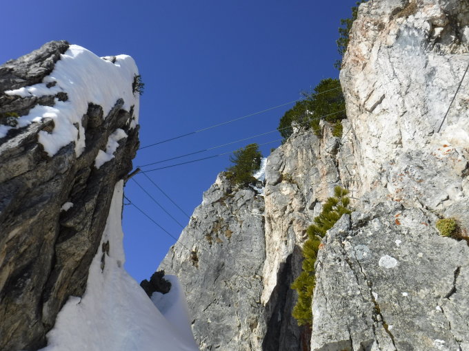 Bin diesen KS abgeklettert, da die Nordseite noch verschneit war. In welchen ich deswegen erst an oberer Kreuzung hineinwechselte. Ebenso eingeschneit war noch untere Leiter des KS „Knorren-Nadel“ zum Felsabsatz. Der Fuß vom Holzkreuz auf der Felskuppe wackelt erheblich, da er nur noch mit einer Schraube gehalten wird.
