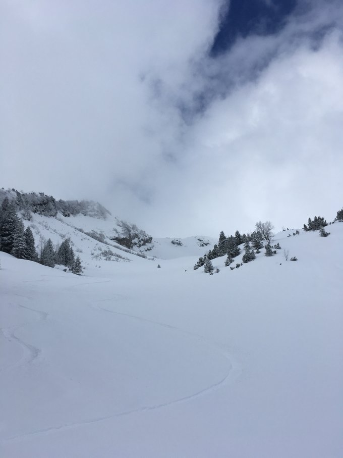 Ab ca 1700 hm viele Treibschneeansammlungen die bei guter Sicht umgangen werden können. Leider hatte ich nicht so viel Glück und musste bei null Sicht auf 2100hm abfahren. Unten wurde die Sicht wieder besser. Trotzdem super Pulver für die Abfahrt.