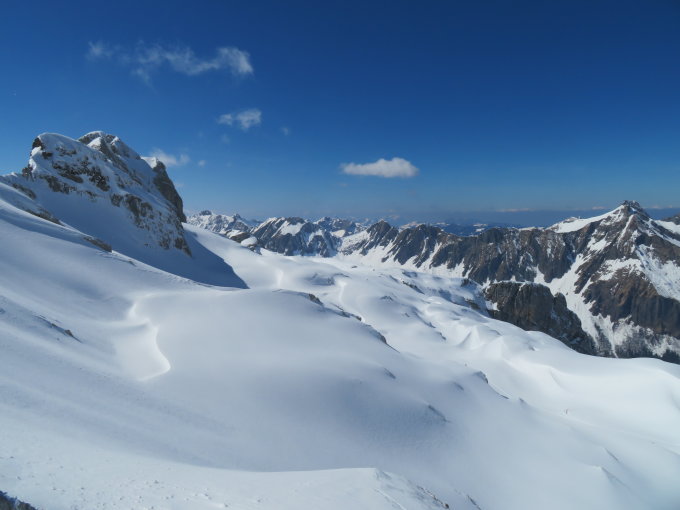 Aufstieg über den Chrüpler nicht mehr machbar. Über die Aberen top. Beste Verhältnisse. Alle alternativen Abfahrten sind zur Zeit super.
