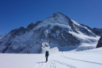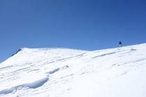 Aufstieg von der Bertolhütte in 10cm Pulver. Ab 200hm unterm Gipfel war der Schnee recht windbearbeitet. Es hat aber immer eine gute Spur. Es empfielt sich bei der Gipfelkuppe in Aufstiegsrichtung links herum (zu den Felsen) zu gehen, da man rechts herum auf Blankeis trifft.