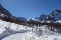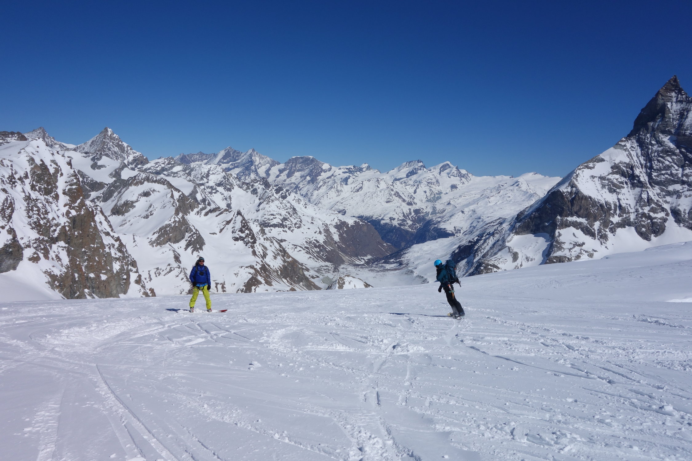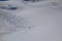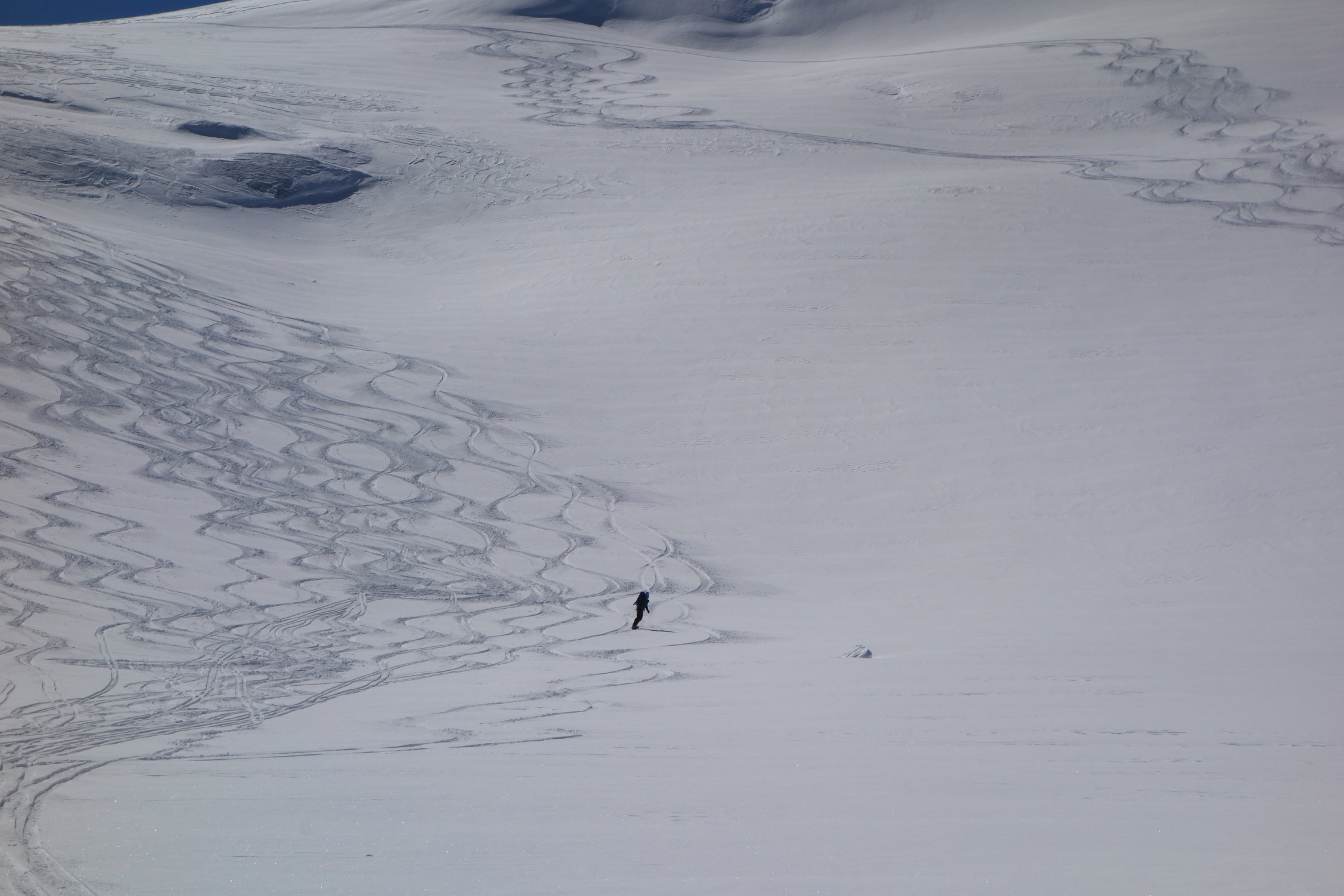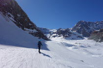 Abfahrt bis ins Skigebiet mit wenig Stockeinsatz und 100m zu fuss einfach möglich,es hat eine ausgefahrene glatte Spur, auch für Splitboarder fahrbar, aber anstrengend, da langes traversieren. Ansonsten super Abfahrt, etwas verspurt dank Heliskier, aber man kann noch ein paar schöne Schwünge ziehen.