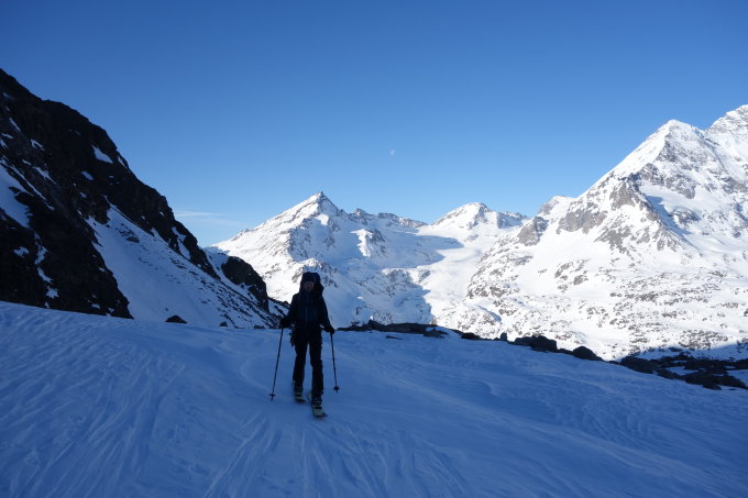 Es hat wenig Schnee im Gebiet ( eher April/Mai Feeling) und bis zum Gl. Du Brenay mussten wir die Strecke mit Harscheisen zurücklegen. Anschliessend auf guter Spur auf der Moräne linke Talseite bis kurz vor die Brüche des Gl.Du Brenay, sind dann abgebogen auf den Serpentine Gl, da der Aufstieg recht einfach aussah. Dann endlich Sonne. Beim Gl du Brennay sieht man derzeit nur auf der rechte Talseite Abfahrtspuren.