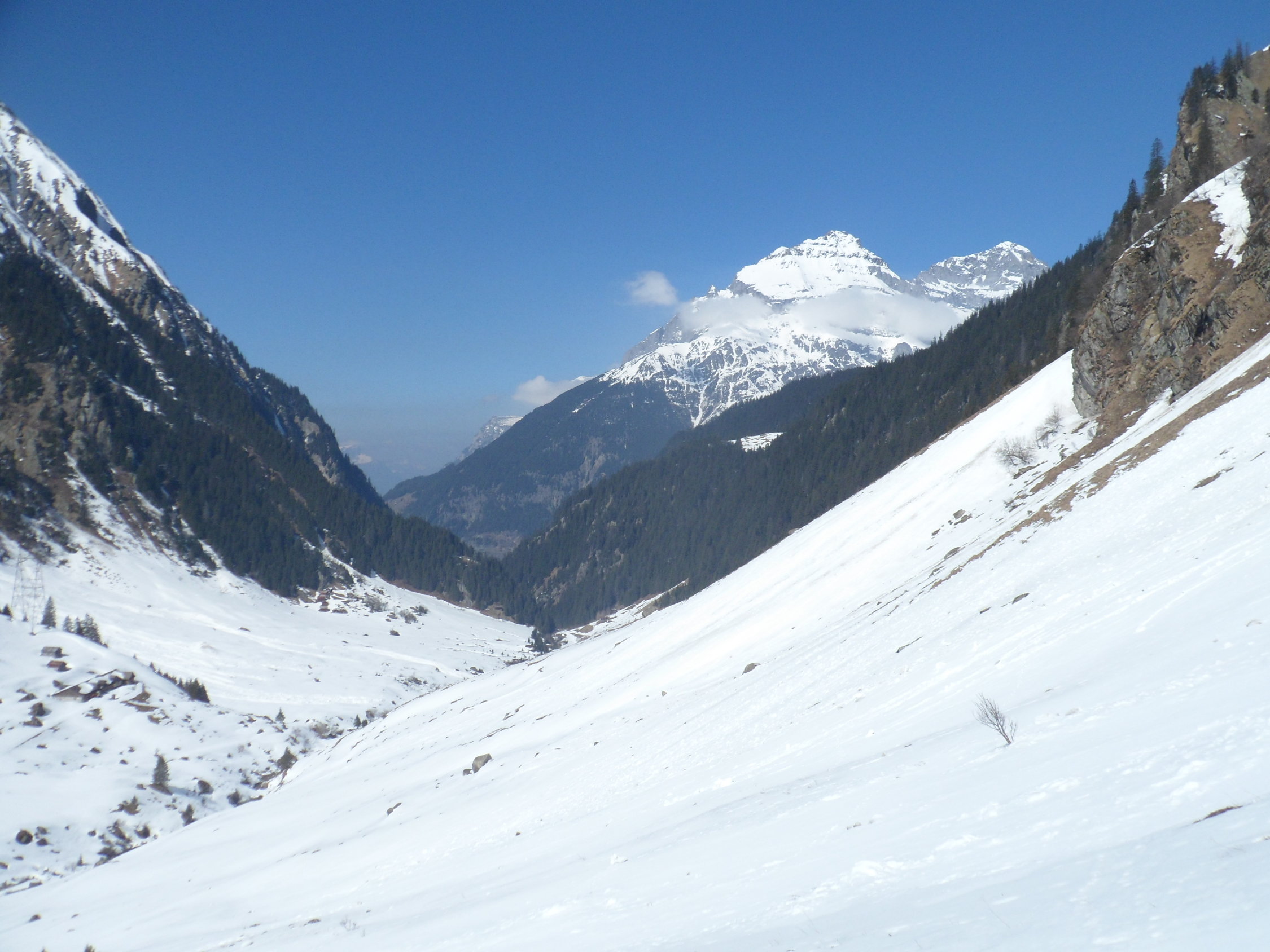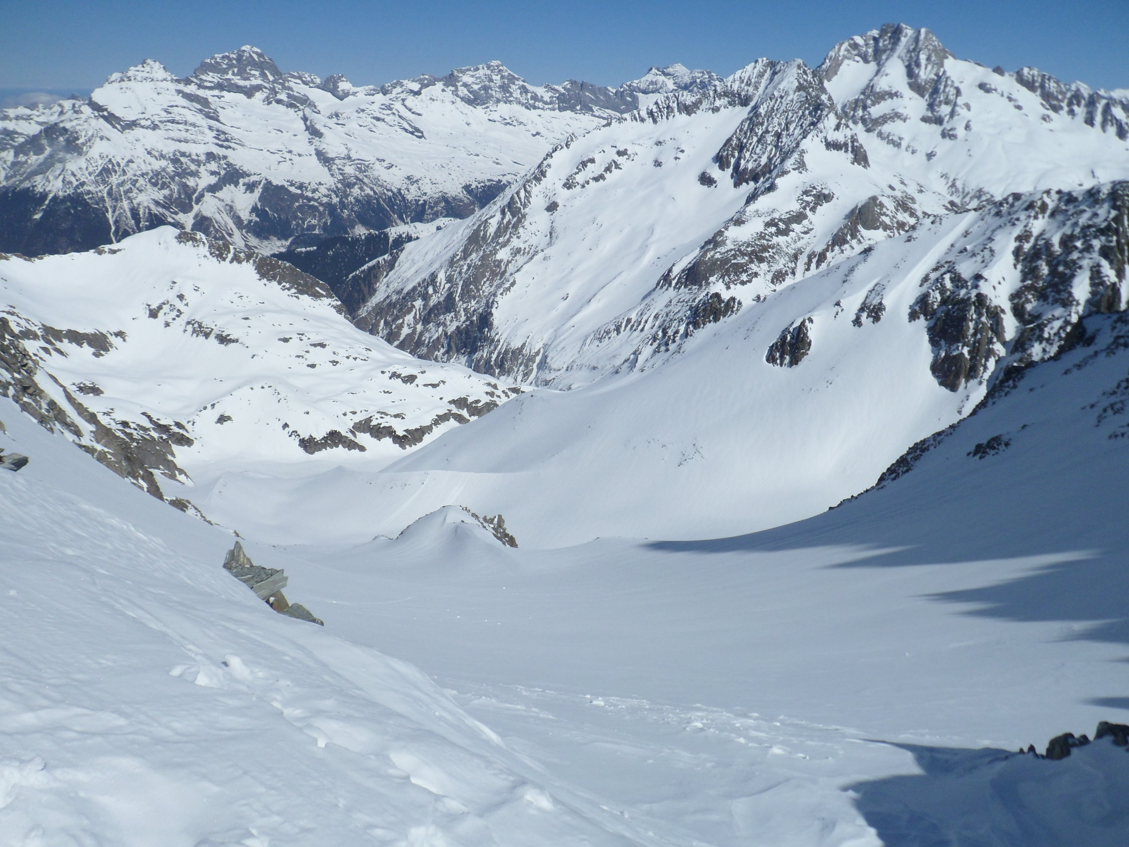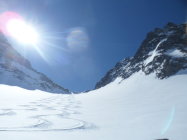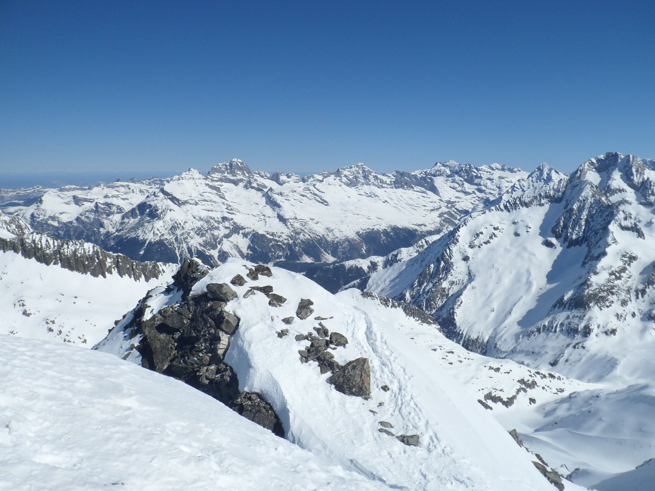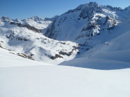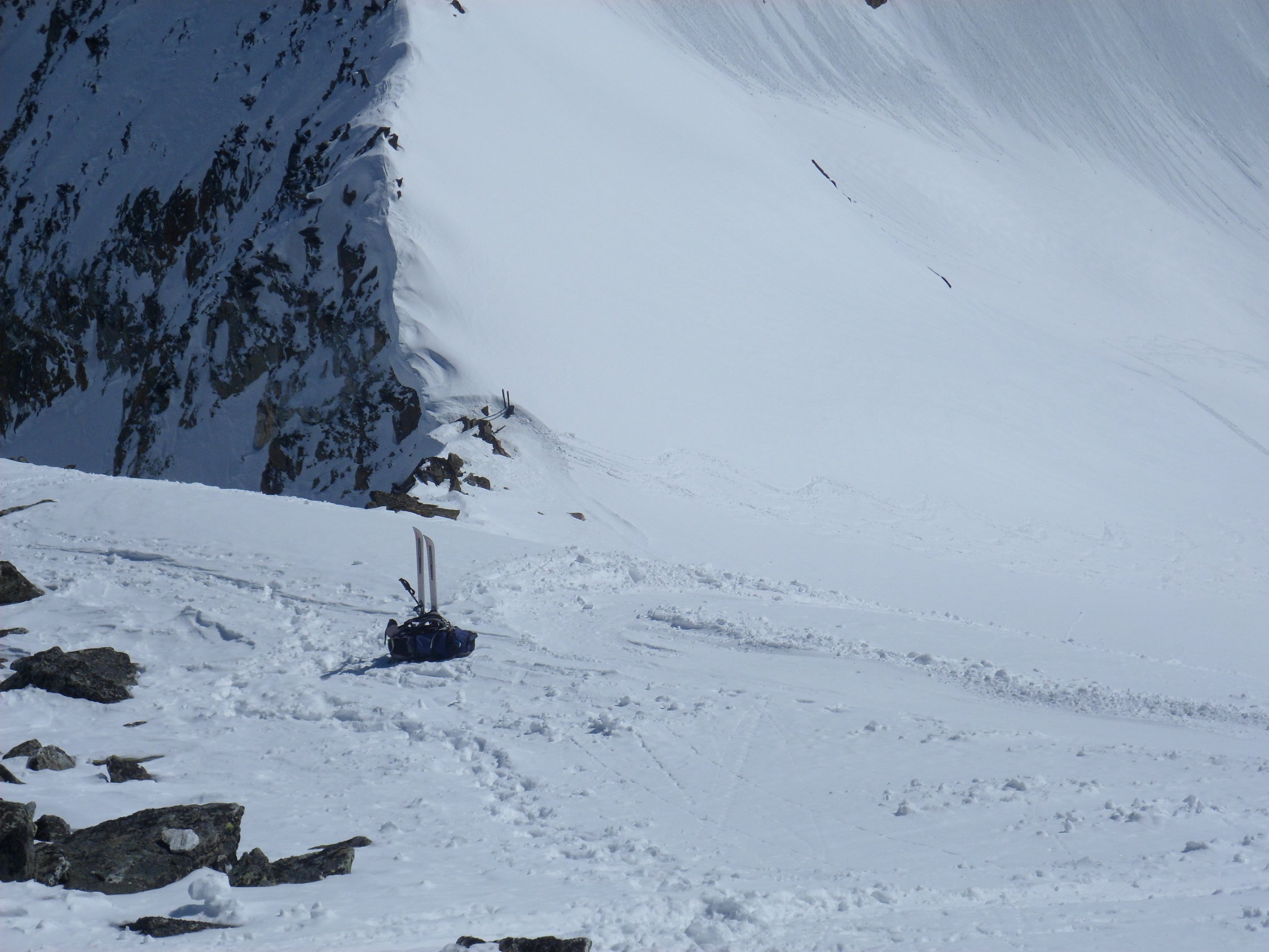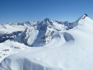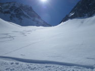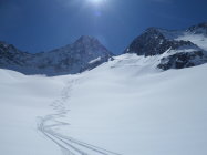 Nordseitig wunderbarer Pulverschnee (etwas windbearbeitet). Man kann mit den Skis bis zum Gipfel. Es hat auch Abfahrtsspuren. Der Schnee ist aber zerfahren und alle Stollen waren um 11 Uhr noch gefrohren. Kein Vergnügen. Zur Zeit besser zu Fuss auf den Gipfel. Die normale Route in dem vom Spillauifirn gebildeten Talmulde von und zur Etzlihütte auf den Giuv ist von einer "Jahrhundertlawine" gefüllt mit Lawinenmüll. Abfahrt in der mittleren von zwei Moränen gebildeten Talmulde ist empfehlenswert.