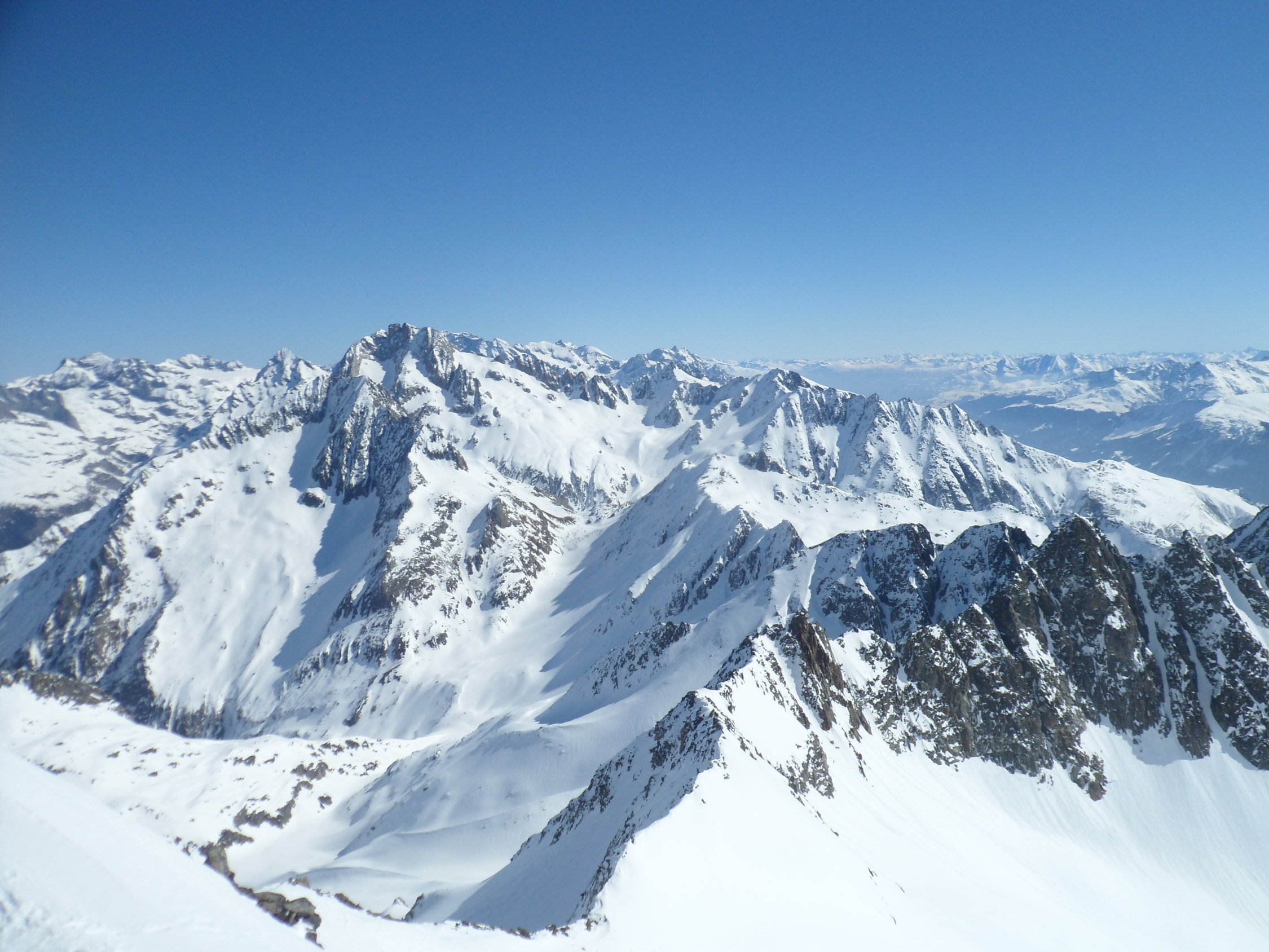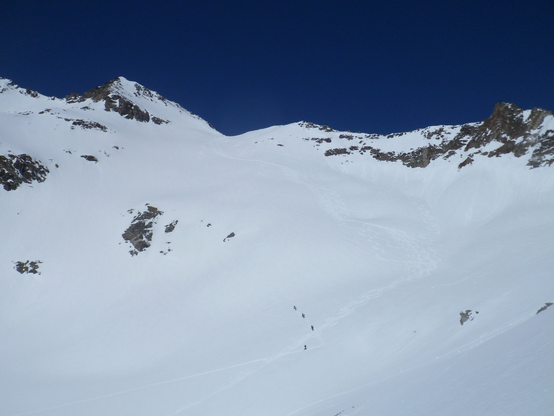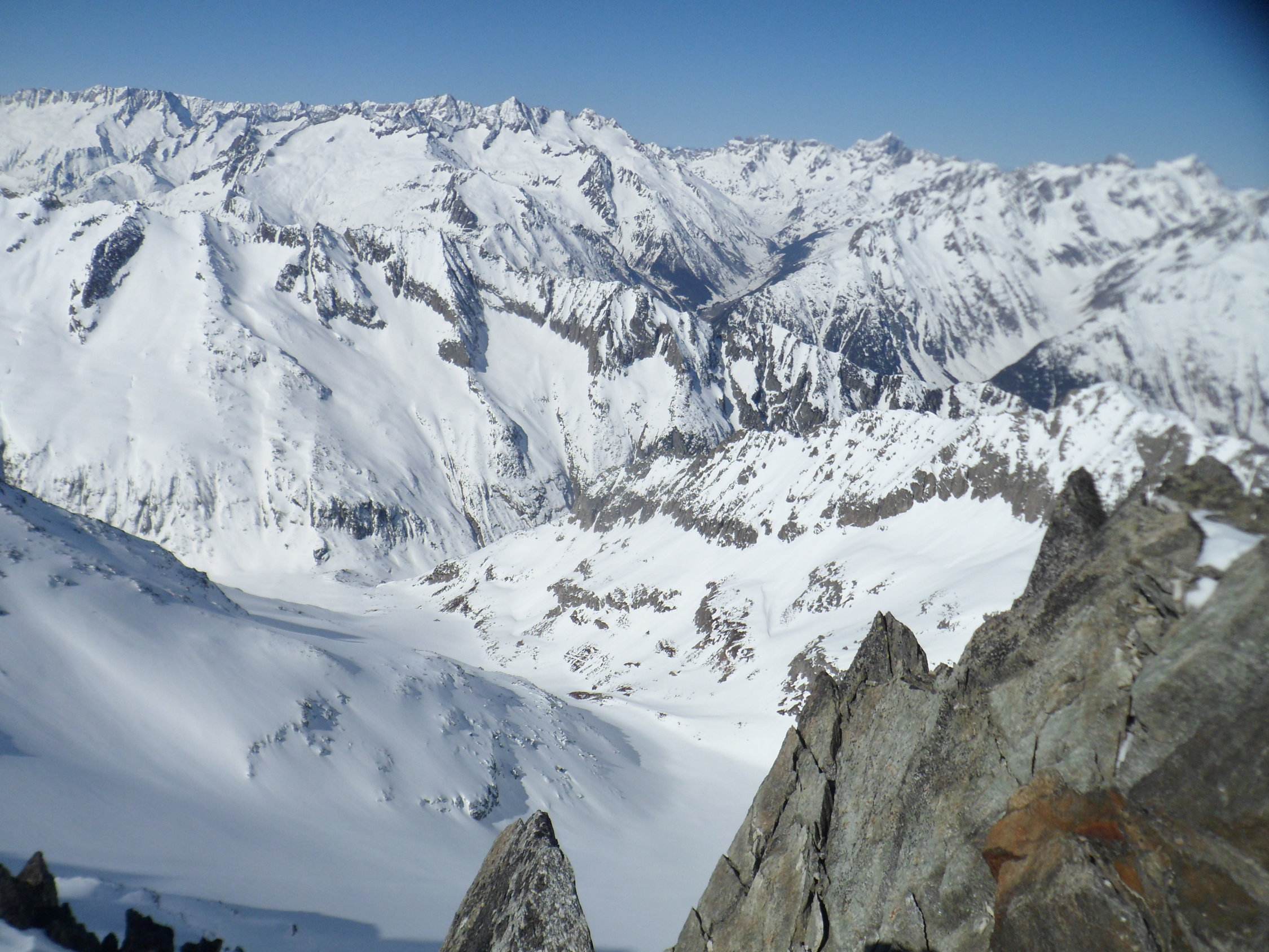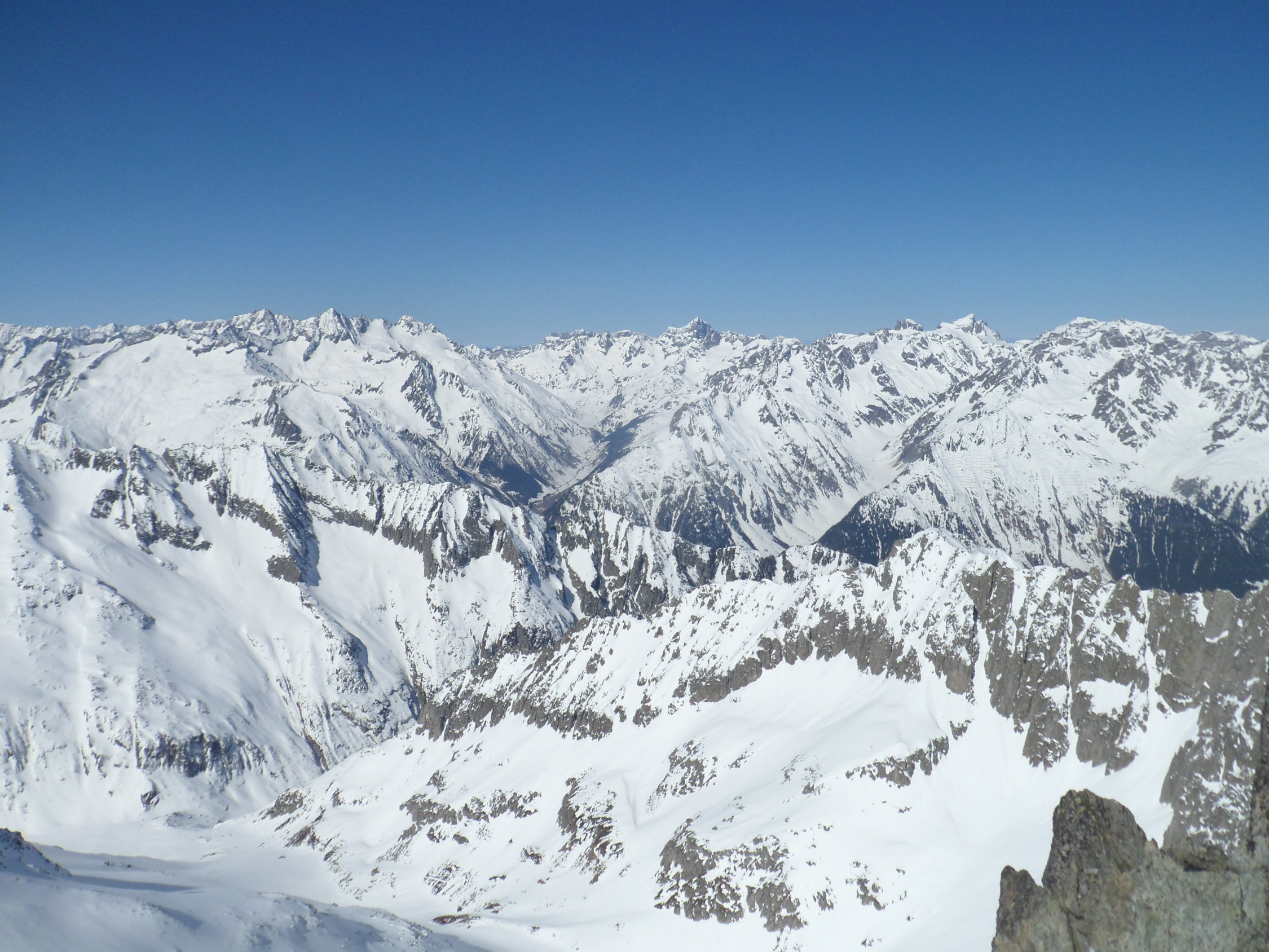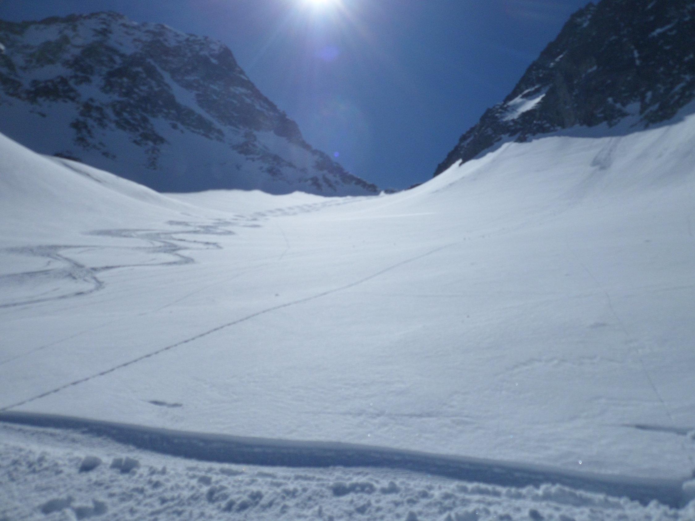 Nordseitig wunderbarer Pulverschnee (etwas windbearbeitet). Man kann mit den Skis bis zum Gipfel. Es hat auch Abfahrtsspuren. Der Schnee ist aber zerfahren und alle Stollen waren um 11 Uhr noch gefrohren. Kein Vergnügen. Zur Zeit besser zu Fuss auf den Gipfel. Die normale Route in dem vom Spillauifirn gebildeten Talmulde von und zur Etzlihütte auf den Giuv ist von einer "Jahrhundertlawine" gefüllt mit Lawinenmüll. Abfahrt in der mittleren von zwei Moränen gebildeten Talmulde ist empfehlenswert.